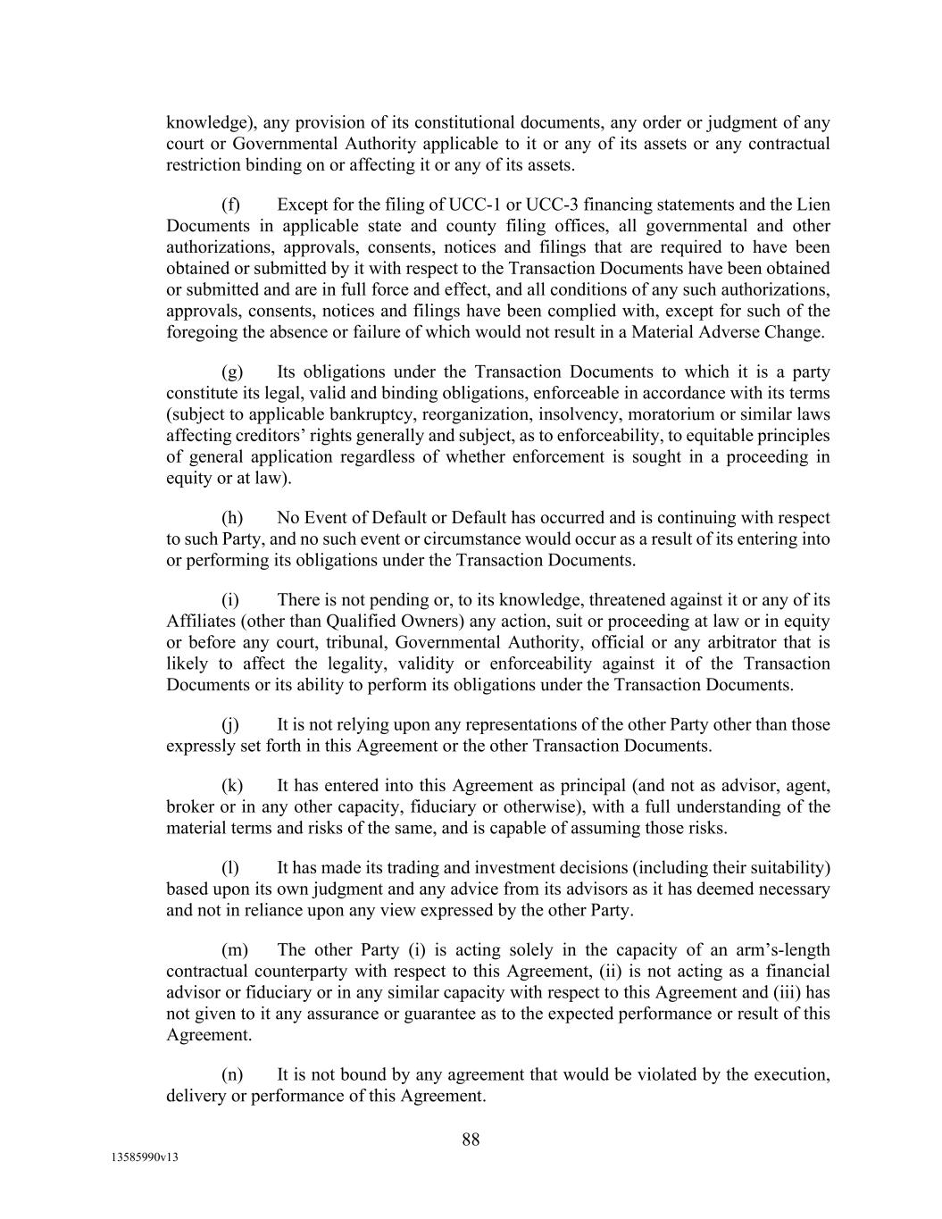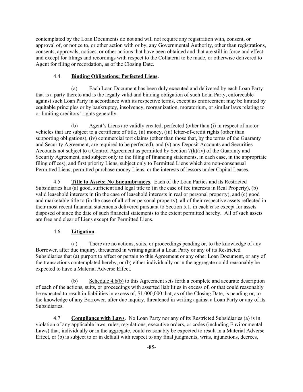 -85- contemplated by the Loan Documents do not and will not require any registration with, consent, or approval of, or notice to, or other action with or by, any Governmental Authority, other than registrations, consents, approvals, notices, or other actions that have been obtained and that are still in force and effect and except for filings and recordings with respect to the Collateral to be made, or otherwise delivered to Agent for filing or recordation, as of the Closing Date. 4.4 Binding Obligations; Perfected Liens. (a) Each Loan Document has been duly executed and delivered by each Loan Party that is a party thereto and is the legally valid and binding obligation of such Loan Party, enforceable against such Loan Party in accordance with its respective terms, except as enforcement may be limited by equitable principles or by bankruptcy, insolvency, reorganization, moratorium, or similar laws relating to or limiting creditors’ rights generally. (b) Agent’s Liens are validly created, perfected (other than (i) in respect of motor vehicles that are subject to a certificate of title, (ii) money, (iii) letter-of-credit rights (other than supporting obligations), (iv) commercial tort claims (other than those that, by the terms of the Guaranty and Security Agreement, are required to be perfected), and (v) any Deposit Accounts and Securities Accounts not subject to a Control Agreement as permitted by Section 7(k)(iv) of the Guaranty and Security Agreement, and subject only to the filing of financing statements, in each case, in the appropriate filing offices), and first priority Liens, subject only to Permitted Liens which are non-consensual Permitted Liens, permitted purchase money Liens, or the interests of lessors under Capital Leases. 4.5 Title to Assets; No Encumbrances. Each of the Loan Parties and its Restricted Subsidiaries has (a) good, sufficient and legal title to (in the case of fee interests in Real Property), (b) valid leasehold interests in (in the case of leasehold interests in real or personal property), and (c) good and marketable title to (in the case of all other personal property), all of their respective assets reflected in their most recent financial statements delivered pursuant to Section 5.1, in each case except for assets disposed of since the date of such financial statements to the extent permitted hereby. All of such assets are free and clear of Liens except for Permitted Liens. 4.6 Litigation. (a) There are no actions, suits, or proceedings pending or, to the knowledge of any Borrower, after due inquiry, threatened in writing against a Loan Party or any of its Restricted Subsidiaries that (a) purport to affect or pertain to this Agreement or any other Loan Document, or any of the transactions contemplated hereby, or (b) either individually or in the aggregate could reasonably be expected to have a Material Adverse Effect. (b) Schedule 4.6(b) to this Agreement sets forth a complete and accurate description of each of the actions, suits, or proceedings with asserted liabilities in excess of, or that could reasonably be expected to result in liabilities in excess of, $1,000,000 that, as of the Closing Date, is pending or, to the knowledge of any Borrower, after due inquiry, threatened in writing against a Loan Party or any of its Subsidiaries. 4.7 Compliance with Laws. No Loan Party nor any of its Restricted Subsidiaries (a) is in violation of any applicable laws, rules, regulations, executive orders, or codes (including Environmental Laws) that, individually or in the aggregate, could reasonably be expected to result in a Material Adverse Effect, or (b) is subject to or in default with respect to any final judgments, writs, injunctions, decrees,