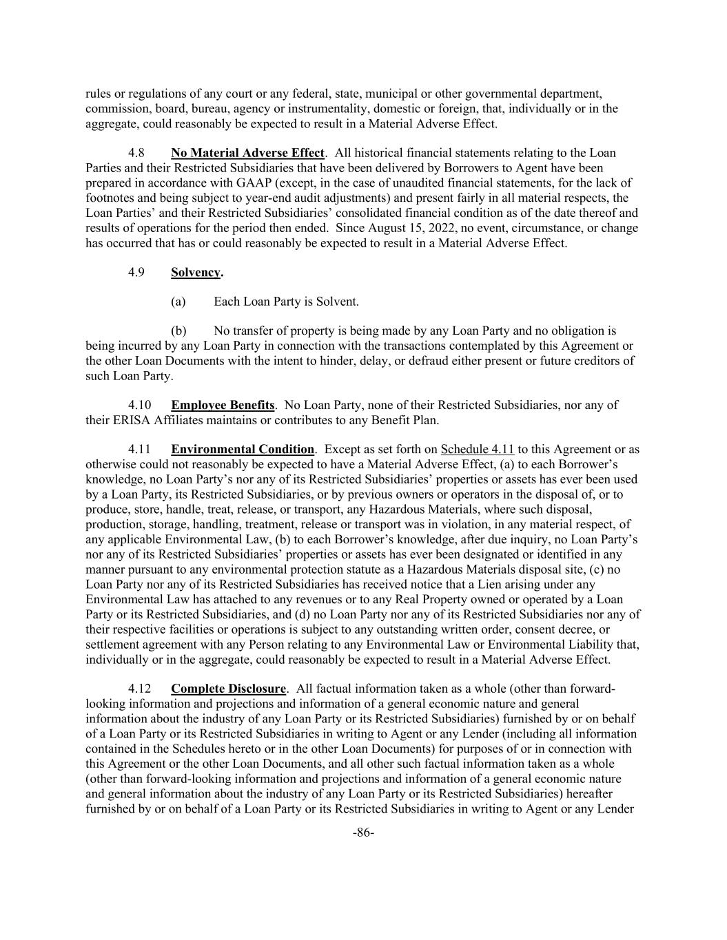 -86- rules or regulations of any court or any federal, state, municipal or other governmental department, commission, board, bureau, agency or instrumentality, domestic or foreign, that, individually or in the aggregate, could reasonably be expected to result in a Material Adverse Effect. 4.8 No Material Adverse Effect. All historical financial statements relating to the Loan Parties and their Restricted Subsidiaries that have been delivered by Borrowers to Agent have been prepared in accordance with GAAP (except, in the case of unaudited financial statements, for the lack of footnotes and being subject to year-end audit adjustments) and present fairly in all material respects, the Loan Parties’ and their Restricted Subsidiaries’ consolidated financial condition as of the date thereof and results of operations for the period then ended. Since August 15, 2022, no event, circumstance, or change has occurred that has or could reasonably be expected to result in a Material Adverse Effect. 4.9 Solvency. (a) Each Loan Party is Solvent. (b) No transfer of property is being made by any Loan Party and no obligation is being incurred by any Loan Party in connection with the transactions contemplated by this Agreement or the other Loan Documents with the intent to hinder, delay, or defraud either present or future creditors of such Loan Party. 4.10 Employee Benefits. No Loan Party, none of their Restricted Subsidiaries, nor any of their ERISA Affiliates maintains or contributes to any Benefit Plan. 4.11 Environmental Condition. Except as set forth on Schedule 4.11 to this Agreement or as otherwise could not reasonably be expected to have a Material Adverse Effect, (a) to each Borrower’s knowledge, no Loan Party’s nor any of its Restricted Subsidiaries’ properties or assets has ever been used by a Loan Party, its Restricted Subsidiaries, or by previous owners or operators in the disposal of, or to produce, store, handle, treat, release, or transport, any Hazardous Materials, where such disposal, production, storage, handling, treatment, release or transport was in violation, in any material respect, of any applicable Environmental Law, (b) to each Borrower’s knowledge, after due inquiry, no Loan Party’s nor any of its Restricted Subsidiaries’ properties or assets has ever been designated or identified in any manner pursuant to any environmental protection statute as a Hazardous Materials disposal site, (c) no Loan Party nor any of its Restricted Subsidiaries has received notice that a Lien arising under any Environmental Law has attached to any revenues or to any Real Property owned or operated by a Loan Party or its Restricted Subsidiaries, and (d) no Loan Party nor any of its Restricted Subsidiaries nor any of their respective facilities or operations is subject to any outstanding written order, consent decree, or settlement agreement with any Person relating to any Environmental Law or Environmental Liability that, individually or in the aggregate, could reasonably be expected to result in a Material Adverse Effect. 4.12 Complete Disclosure. All factual information taken as a whole (other than forward- looking information and projections and information of a general economic nature and general information about the industry of any Loan Party or its Restricted Subsidiaries) furnished by or on behalf of a Loan Party or its Restricted Subsidiaries in writing to Agent or any Lender (including all information contained in the Schedules hereto or in the other Loan Documents) for purposes of or in connection with this Agreement or the other Loan Documents, and all other such factual information taken as a whole (other than forward-looking information and projections and information of a general economic nature and general information about the industry of any Loan Party or its Restricted Subsidiaries) hereafter furnished by or on behalf of a Loan Party or its Restricted Subsidiaries in writing to Agent or any Lender