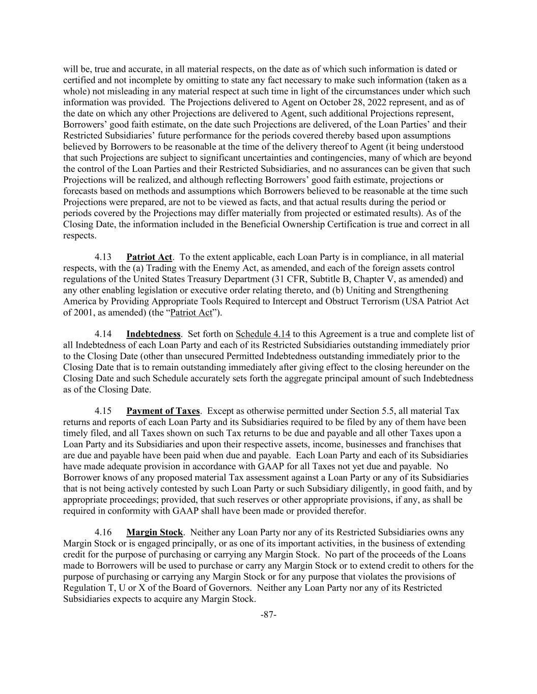 -87- will be, true and accurate, in all material respects, on the date as of which such information is dated or certified and not incomplete by omitting to state any fact necessary to make such information (taken as a whole) not misleading in any material respect at such time in light of the circumstances under which such information was provided. The Projections delivered to Agent on October 28, 2022 represent, and as of the date on which any other Projections are delivered to Agent, such additional Projections represent, Borrowers’ good faith estimate, on the date such Projections are delivered, of the Loan Parties’ and their Restricted Subsidiaries’ future performance for the periods covered thereby based upon assumptions believed by Borrowers to be reasonable at the time of the delivery thereof to Agent (it being understood that such Projections are subject to significant uncertainties and contingencies, many of which are beyond the control of the Loan Parties and their Restricted Subsidiaries, and no assurances can be given that such Projections will be realized, and although reflecting Borrowers’ good faith estimate, projections or forecasts based on methods and assumptions which Borrowers believed to be reasonable at the time such Projections were prepared, are not to be viewed as facts, and that actual results during the period or periods covered by the Projections may differ materially from projected or estimated results). As of the Closing Date, the information included in the Beneficial Ownership Certification is true and correct in all respects. 4.13 Patriot Act. To the extent applicable, each Loan Party is in compliance, in all material respects, with the (a) Trading with the Enemy Act, as amended, and each of the foreign assets control regulations of the United States Treasury Department (31 CFR, Subtitle B, Chapter V, as amended) and any other enabling legislation or executive order relating thereto, and (b) Uniting and Strengthening America by Providing Appropriate Tools Required to Intercept and Obstruct Terrorism (USA Patriot Act of 2001, as amended) (the “Patriot Act”). 4.14 Indebtedness. Set forth on Schedule 4.14 to this Agreement is a true and complete list of all Indebtedness of each Loan Party and each of its Restricted Subsidiaries outstanding immediately prior to the Closing Date (other than unsecured Permitted Indebtedness outstanding immediately prior to the Closing Date that is to remain outstanding immediately after giving effect to the closing hereunder on the Closing Date and such Schedule accurately sets forth the aggregate principal amount of such Indebtedness as of the Closing Date. 4.15 Payment of Taxes. Except as otherwise permitted under Section 5.5, all material Tax returns and reports of each Loan Party and its Subsidiaries required to be filed by any of them have been timely filed, and all Taxes shown on such Tax returns to be due and payable and all other Taxes upon a Loan Party and its Subsidiaries and upon their respective assets, income, businesses and franchises that are due and payable have been paid when due and payable. Each Loan Party and each of its Subsidiaries have made adequate provision in accordance with GAAP for all Taxes not yet due and payable. No Borrower knows of any proposed material Tax assessment against a Loan Party or any of its Subsidiaries that is not being actively contested by such Loan Party or such Subsidiary diligently, in good faith, and by appropriate proceedings; provided, that such reserves or other appropriate provisions, if any, as shall be required in conformity with GAAP shall have been made or provided therefor. 4.16 Margin Stock. Neither any Loan Party nor any of its Restricted Subsidiaries owns any Margin Stock or is engaged principally, or as one of its important activities, in the business of extending credit for the purpose of purchasing or carrying any Margin Stock. No part of the proceeds of the Loans made to Borrowers will be used to purchase or carry any Margin Stock or to extend credit to others for the purpose of purchasing or carrying any Margin Stock or for any purpose that violates the provisions of Regulation T, U or X of the Board of Governors. Neither any Loan Party nor any of its Restricted Subsidiaries expects to acquire any Margin Stock.