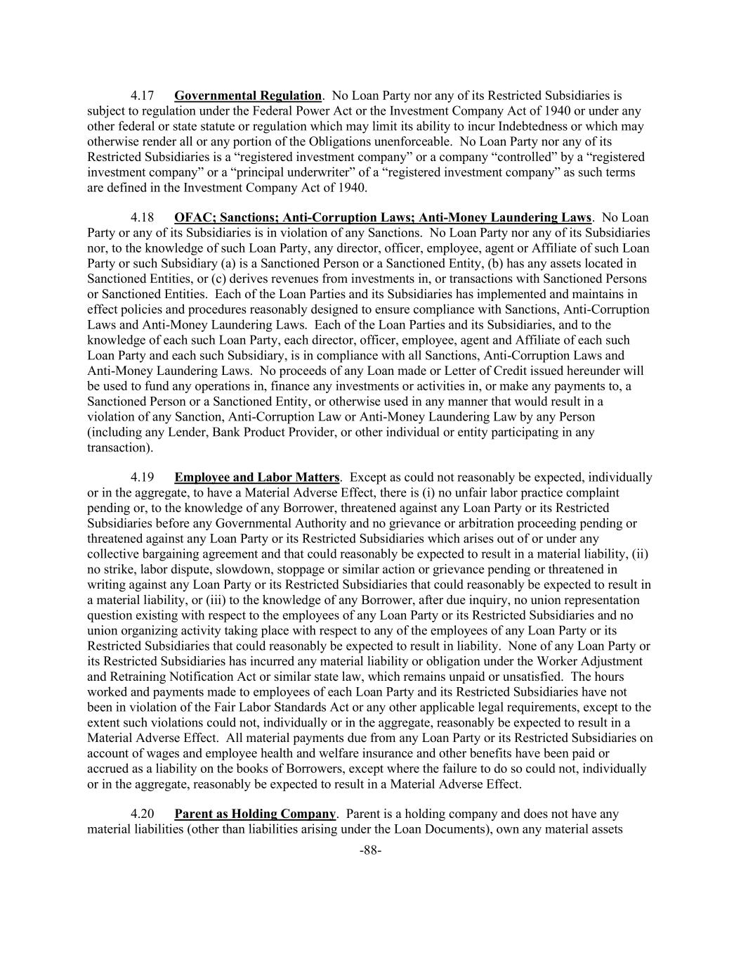 -88- 4.17 Governmental Regulation. No Loan Party nor any of its Restricted Subsidiaries is subject to regulation under the Federal Power Act or the Investment Company Act of 1940 or under any other federal or state statute or regulation which may limit its ability to incur Indebtedness or which may otherwise render all or any portion of the Obligations unenforceable. No Loan Party nor any of its Restricted Subsidiaries is a “registered investment company” or a company “controlled” by a “registered investment company” or a “principal underwriter” of a “registered investment company” as such terms are defined in the Investment Company Act of 1940. 4.18 OFAC; Sanctions; Anti-Corruption Laws; Anti-Money Laundering Laws. No Loan Party or any of its Subsidiaries is in violation of any Sanctions. No Loan Party nor any of its Subsidiaries nor, to the knowledge of such Loan Party, any director, officer, employee, agent or Affiliate of such Loan Party or such Subsidiary (a) is a Sanctioned Person or a Sanctioned Entity, (b) has any assets located in Sanctioned Entities, or (c) derives revenues from investments in, or transactions with Sanctioned Persons or Sanctioned Entities. Each of the Loan Parties and its Subsidiaries has implemented and maintains in effect policies and procedures reasonably designed to ensure compliance with Sanctions, Anti-Corruption Laws and Anti-Money Laundering Laws. Each of the Loan Parties and its Subsidiaries, and to the knowledge of each such Loan Party, each director, officer, employee, agent and Affiliate of each such Loan Party and each such Subsidiary, is in compliance with all Sanctions, Anti-Corruption Laws and Anti-Money Laundering Laws. No proceeds of any Loan made or Letter of Credit issued hereunder will be used to fund any operations in, finance any investments or activities in, or make any payments to, a Sanctioned Person or a Sanctioned Entity, or otherwise used in any manner that would result in a violation of any Sanction, Anti-Corruption Law or Anti-Money Laundering Law by any Person (including any Lender, Bank Product Provider, or other individual or entity participating in any transaction). 4.19 Employee and Labor Matters. Except as could not reasonably be expected, individually or in the aggregate, to have a Material Adverse Effect, there is (i) no unfair labor practice complaint pending or, to the knowledge of any Borrower, threatened against any Loan Party or its Restricted Subsidiaries before any Governmental Authority and no grievance or arbitration proceeding pending or threatened against any Loan Party or its Restricted Subsidiaries which arises out of or under any collective bargaining agreement and that could reasonably be expected to result in a material liability, (ii) no strike, labor dispute, slowdown, stoppage or similar action or grievance pending or threatened in writing against any Loan Party or its Restricted Subsidiaries that could reasonably be expected to result in a material liability, or (iii) to the knowledge of any Borrower, after due inquiry, no union representation question existing with respect to the employees of any Loan Party or its Restricted Subsidiaries and no union organizing activity taking place with respect to any of the employees of any Loan Party or its Restricted Subsidiaries that could reasonably be expected to result in liability. None of any Loan Party or its Restricted Subsidiaries has incurred any material liability or obligation under the Worker Adjustment and Retraining Notification Act or similar state law, which remains unpaid or unsatisfied. The hours worked and payments made to employees of each Loan Party and its Restricted Subsidiaries have not been in violation of the Fair Labor Standards Act or any other applicable legal requirements, except to the extent such violations could not, individually or in the aggregate, reasonably be expected to result in a Material Adverse Effect. All material payments due from any Loan Party or its Restricted Subsidiaries on account of wages and employee health and welfare insurance and other benefits have been paid or accrued as a liability on the books of Borrowers, except where the failure to do so could not, individually or in the aggregate, reasonably be expected to result in a Material Adverse Effect. 4.20 Parent as Holding Company. Parent is a holding company and does not have any material liabilities (other than liabilities arising under the Loan Documents), own any material assets