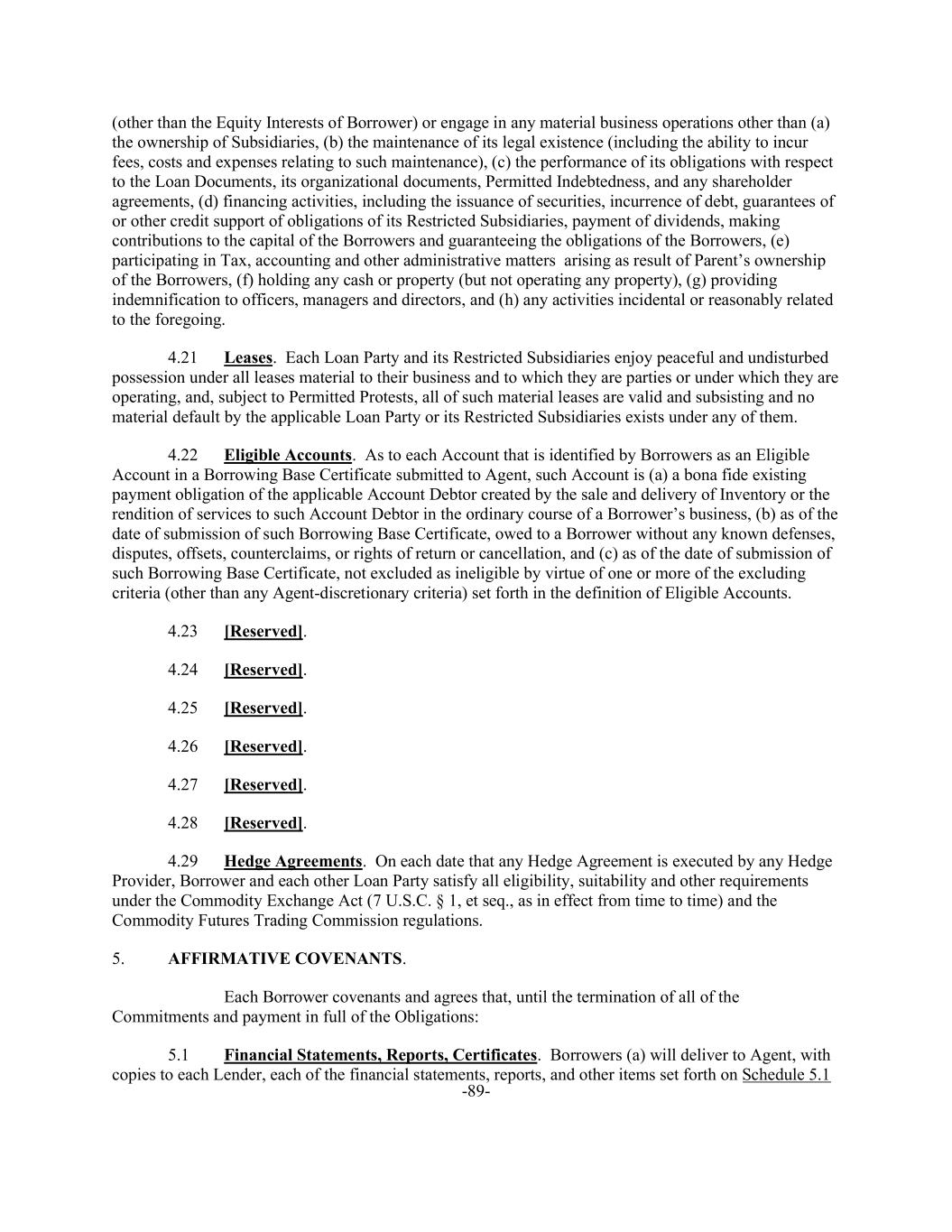 -89- (other than the Equity Interests of Borrower) or engage in any material business operations other than (a) the ownership of Subsidiaries, (b) the maintenance of its legal existence (including the ability to incur fees, costs and expenses relating to such maintenance), (c) the performance of its obligations with respect to the Loan Documents, its organizational documents, Permitted Indebtedness, and any shareholder agreements, (d) financing activities, including the issuance of securities, incurrence of debt, guarantees of or other credit support of obligations of its Restricted Subsidiaries, payment of dividends, making contributions to the capital of the Borrowers and guaranteeing the obligations of the Borrowers, (e) participating in Tax, accounting and other administrative matters arising as result of Parent’s ownership of the Borrowers, (f) holding any cash or property (but not operating any property), (g) providing indemnification to officers, managers and directors, and (h) any activities incidental or reasonably related to the foregoing. 4.21 Leases. Each Loan Party and its Restricted Subsidiaries enjoy peaceful and undisturbed possession under all leases material to their business and to which they are parties or under which they are operating, and, subject to Permitted Protests, all of such material leases are valid and subsisting and no material default by the applicable Loan Party or its Restricted Subsidiaries exists under any of them. 4.22 Eligible Accounts. As to each Account that is identified by Borrowers as an Eligible Account in a Borrowing Base Certificate submitted to Agent, such Account is (a) a bona fide existing payment obligation of the applicable Account Debtor created by the sale and delivery of Inventory or the rendition of services to such Account Debtor in the ordinary course of a Borrower’s business, (b) as of the date of submission of such Borrowing Base Certificate, owed to a Borrower without any known defenses, disputes, offsets, counterclaims, or rights of return or cancellation, and (c) as of the date of submission of such Borrowing Base Certificate, not excluded as ineligible by virtue of one or more of the excluding criteria (other than any Agent-discretionary criteria) set forth in the definition of Eligible Accounts. 4.23 [Reserved]. 4.24 [Reserved]. 4.25 [Reserved]. 4.26 [Reserved]. 4.27 [Reserved]. 4.28 [Reserved]. 4.29 Hedge Agreements. On each date that any Hedge Agreement is executed by any Hedge Provider, Borrower and each other Loan Party satisfy all eligibility, suitability and other requirements under the Commodity Exchange Act (7 U.S.C. § 1, et seq., as in effect from time to time) and the Commodity Futures Trading Commission regulations. 5. AFFIRMATIVE COVENANTS. Each Borrower covenants and agrees that, until the termination of all of the Commitments and payment in full of the Obligations: 5.1 Financial Statements, Reports, Certificates. Borrowers (a) will deliver to Agent, with copies to each Lender, each of the financial statements, reports, and other items set forth on Schedule 5.1