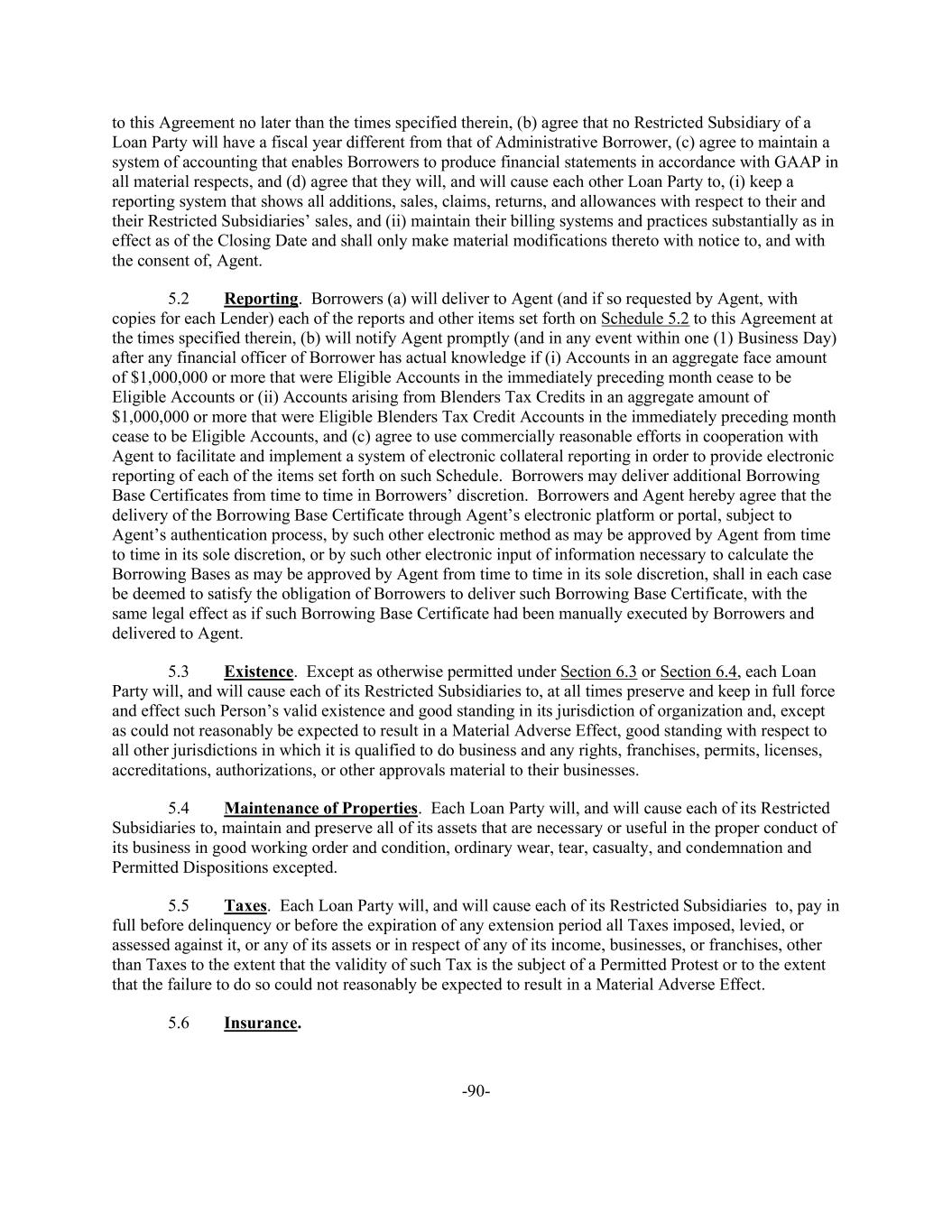 -90- to this Agreement no later than the times specified therein, (b) agree that no Restricted Subsidiary of a Loan Party will have a fiscal year different from that of Administrative Borrower, (c) agree to maintain a system of accounting that enables Borrowers to produce financial statements in accordance with GAAP in all material respects, and (d) agree that they will, and will cause each other Loan Party to, (i) keep a reporting system that shows all additions, sales, claims, returns, and allowances with respect to their and their Restricted Subsidiaries’ sales, and (ii) maintain their billing systems and practices substantially as in effect as of the Closing Date and shall only make material modifications thereto with notice to, and with the consent of, Agent. 5.2 Reporting. Borrowers (a) will deliver to Agent (and if so requested by Agent, with copies for each Lender) each of the reports and other items set forth on Schedule 5.2 to this Agreement at the times specified therein, (b) will notify Agent promptly (and in any event within one (1) Business Day) after any financial officer of Borrower has actual knowledge if (i) Accounts in an aggregate face amount of $1,000,000 or more that were Eligible Accounts in the immediately preceding month cease to be Eligible Accounts or (ii) Accounts arising from Blenders Tax Credits in an aggregate amount of $1,000,000 or more that were Eligible Blenders Tax Credit Accounts in the immediately preceding month cease to be Eligible Accounts, and (c) agree to use commercially reasonable efforts in cooperation with Agent to facilitate and implement a system of electronic collateral reporting in order to provide electronic reporting of each of the items set forth on such Schedule. Borrowers may deliver additional Borrowing Base Certificates from time to time in Borrowers’ discretion. Borrowers and Agent hereby agree that the delivery of the Borrowing Base Certificate through Agent’s electronic platform or portal, subject to Agent’s authentication process, by such other electronic method as may be approved by Agent from time to time in its sole discretion, or by such other electronic input of information necessary to calculate the Borrowing Bases as may be approved by Agent from time to time in its sole discretion, shall in each case be deemed to satisfy the obligation of Borrowers to deliver such Borrowing Base Certificate, with the same legal effect as if such Borrowing Base Certificate had been manually executed by Borrowers and delivered to Agent. 5.3 Existence. Except as otherwise permitted under Section 6.3 or Section 6.4, each Loan Party will, and will cause each of its Restricted Subsidiaries to, at all times preserve and keep in full force and effect such Person’s valid existence and good standing in its jurisdiction of organization and, except as could not reasonably be expected to result in a Material Adverse Effect, good standing with respect to all other jurisdictions in which it is qualified to do business and any rights, franchises, permits, licenses, accreditations, authorizations, or other approvals material to their businesses. 5.4 Maintenance of Properties. Each Loan Party will, and will cause each of its Restricted Subsidiaries to, maintain and preserve all of its assets that are necessary or useful in the proper conduct of its business in good working order and condition, ordinary wear, tear, casualty, and condemnation and Permitted Dispositions excepted. 5.5 Taxes. Each Loan Party will, and will cause each of its Restricted Subsidiaries to, pay in full before delinquency or before the expiration of any extension period all Taxes imposed, levied, or assessed against it, or any of its assets or in respect of any of its income, businesses, or franchises, other than Taxes to the extent that the validity of such Tax is the subject of a Permitted Protest or to the extent that the failure to do so could not reasonably be expected to result in a Material Adverse Effect. 5.6 Insurance.