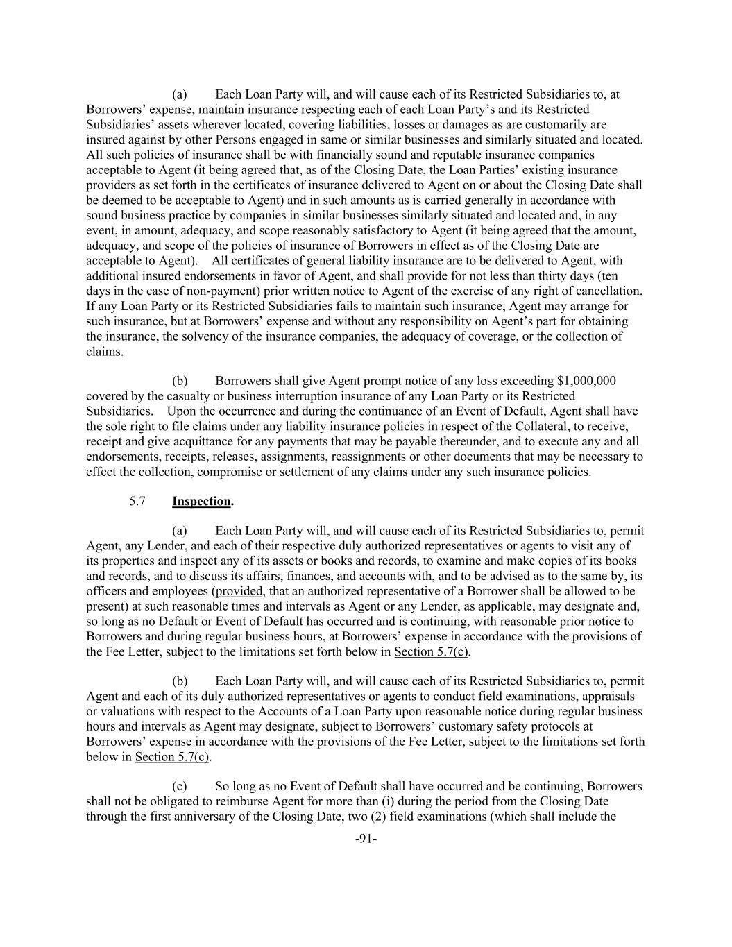-91- (a) Each Loan Party will, and will cause each of its Restricted Subsidiaries to, at Borrowers’ expense, maintain insurance respecting each of each Loan Party’s and its Restricted Subsidiaries’ assets wherever located, covering liabilities, losses or damages as are customarily are insured against by other Persons engaged in same or similar businesses and similarly situated and located. All such policies of insurance shall be with financially sound and reputable insurance companies acceptable to Agent (it being agreed that, as of the Closing Date, the Loan Parties’ existing insurance providers as set forth in the certificates of insurance delivered to Agent on or about the Closing Date shall be deemed to be acceptable to Agent) and in such amounts as is carried generally in accordance with sound business practice by companies in similar businesses similarly situated and located and, in any event, in amount, adequacy, and scope reasonably satisfactory to Agent (it being agreed that the amount, adequacy, and scope of the policies of insurance of Borrowers in effect as of the Closing Date are acceptable to Agent). All certificates of general liability insurance are to be delivered to Agent, with additional insured endorsements in favor of Agent, and shall provide for not less than thirty days (ten days in the case of non-payment) prior written notice to Agent of the exercise of any right of cancellation. If any Loan Party or its Restricted Subsidiaries fails to maintain such insurance, Agent may arrange for such insurance, but at Borrowers’ expense and without any responsibility on Agent’s part for obtaining the insurance, the solvency of the insurance companies, the adequacy of coverage, or the collection of claims. (b) Borrowers shall give Agent prompt notice of any loss exceeding $1,000,000 covered by the casualty or business interruption insurance of any Loan Party or its Restricted Subsidiaries. Upon the occurrence and during the continuance of an Event of Default, Agent shall have the sole right to file claims under any liability insurance policies in respect of the Collateral, to receive, receipt and give acquittance for any payments that may be payable thereunder, and to execute any and all endorsements, receipts, releases, assignments, reassignments or other documents that may be necessary to effect the collection, compromise or settlement of any claims under any such insurance policies. 5.7 Inspection. (a) Each Loan Party will, and will cause each of its Restricted Subsidiaries to, permit Agent, any Lender, and each of their respective duly authorized representatives or agents to visit any of its properties and inspect any of its assets or books and records, to examine and make copies of its books and records, and to discuss its affairs, finances, and accounts with, and to be advised as to the same by, its officers and employees (provided, that an authorized representative of a Borrower shall be allowed to be present) at such reasonable times and intervals as Agent or any Lender, as applicable, may designate and, so long as no Default or Event of Default has occurred and is continuing, with reasonable prior notice to Borrowers and during regular business hours, at Borrowers’ expense in accordance with the provisions of the Fee Letter, subject to the limitations set forth below in Section 5.7(c). (b) Each Loan Party will, and will cause each of its Restricted Subsidiaries to, permit Agent and each of its duly authorized representatives or agents to conduct field examinations, appraisals or valuations with respect to the Accounts of a Loan Party upon reasonable notice during regular business hours and intervals as Agent may designate, subject to Borrowers’ customary safety protocols at Borrowers’ expense in accordance with the provisions of the Fee Letter, subject to the limitations set forth below in Section 5.7(c). (c) So long as no Event of Default shall have occurred and be continuing, Borrowers shall not be obligated to reimburse Agent for more than (i) during the period from the Closing Date through the first anniversary of the Closing Date, two (2) field examinations (which shall include the