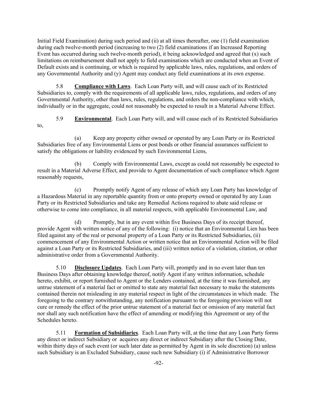 -92- Initial Field Examination) during such period and (ii) at all times thereafter, one (1) field examination during each twelve-month period (increasing to two (2) field examinations if an Increased Reporting Event has occurred during such twelve-month period), it being acknowledged and agreed that (x) such limitations on reimbursement shall not apply to field examinations which are conducted when an Event of Default exists and is continuing, or which is required by applicable laws, rules, regulations, and orders of any Governmental Authority and (y) Agent may conduct any field examinations at its own expense. 5.8 Compliance with Laws. Each Loan Party will, and will cause each of its Restricted Subsidiaries to, comply with the requirements of all applicable laws, rules, regulations, and orders of any Governmental Authority, other than laws, rules, regulations, and orders the non-compliance with which, individually or in the aggregate, could not reasonably be expected to result in a Material Adverse Effect. 5.9 Environmental. Each Loan Party will, and will cause each of its Restricted Subsidiaries to, (a) Keep any property either owned or operated by any Loan Party or its Restricted Subsidiaries free of any Environmental Liens or post bonds or other financial assurances sufficient to satisfy the obligations or liability evidenced by such Environmental Liens, (b) Comply with Environmental Laws, except as could not reasonably be expected to result in a Material Adverse Effect, and provide to Agent documentation of such compliance which Agent reasonably requests, (c) Promptly notify Agent of any release of which any Loan Party has knowledge of a Hazardous Material in any reportable quantity from or onto property owned or operated by any Loan Party or its Restricted Subsidiaries and take any Remedial Actions required to abate said release or otherwise to come into compliance, in all material respects, with applicable Environmental Law, and (d) Promptly, but in any event within five Business Days of its receipt thereof, provide Agent with written notice of any of the following: (i) notice that an Environmental Lien has been filed against any of the real or personal property of a Loan Party or its Restricted Subsidiaries, (ii) commencement of any Environmental Action or written notice that an Environmental Action will be filed against a Loan Party or its Restricted Subsidiaries, and (iii) written notice of a violation, citation, or other administrative order from a Governmental Authority. 5.10 Disclosure Updates. Each Loan Party will, promptly and in no event later than ten Business Days after obtaining knowledge thereof, notify Agent if any written information, schedule hereto, exhibit, or report furnished to Agent or the Lenders contained, at the time it was furnished, any untrue statement of a material fact or omitted to state any material fact necessary to make the statements contained therein not misleading in any material respect in light of the circumstances in which made. The foregoing to the contrary notwithstanding, any notification pursuant to the foregoing provision will not cure or remedy the effect of the prior untrue statement of a material fact or omission of any material fact nor shall any such notification have the effect of amending or modifying this Agreement or any of the Schedules hereto. 5.11 Formation of Subsidiaries. Each Loan Party will, at the time that any Loan Party forms any direct or indirect Subsidiary or acquires any direct or indirect Subsidiary after the Closing Date, within thirty days of such event (or such later date as permitted by Agent in its sole discretion) (a) unless such Subsidiary is an Excluded Subsidiary, cause such new Subsidiary (i) if Administrative Borrower