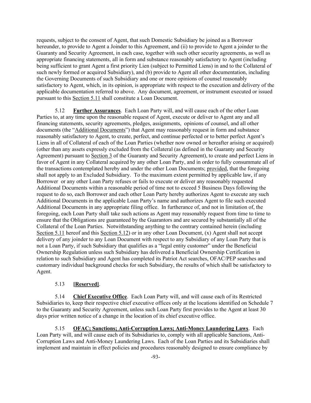 -93- requests, subject to the consent of Agent, that such Domestic Subsidiary be joined as a Borrower hereunder, to provide to Agent a Joinder to this Agreement, and (ii) to provide to Agent a joinder to the Guaranty and Security Agreement, in each case, together with such other security agreements, as well as appropriate financing statements, all in form and substance reasonably satisfactory to Agent (including being sufficient to grant Agent a first priority Lien (subject to Permitted Liens) in and to the Collateral of such newly formed or acquired Subsidiary), and (b) provide to Agent all other documentation, including the Governing Documents of such Subsidiary and one or more opinions of counsel reasonably satisfactory to Agent, which, in its opinion, is appropriate with respect to the execution and delivery of the applicable documentation referred to above. Any document, agreement, or instrument executed or issued pursuant to this Section 5.11 shall constitute a Loan Document. 5.12 Further Assurances. Each Loan Party will, and will cause each of the other Loan Parties to, at any time upon the reasonable request of Agent, execute or deliver to Agent any and all financing statements, security agreements, pledges, assignments, opinions of counsel, and all other documents (the “Additional Documents”) that Agent may reasonably request in form and substance reasonably satisfactory to Agent, to create, perfect, and continue perfected or to better perfect Agent’s Liens in all of Collateral of each of the Loan Parties (whether now owned or hereafter arising or acquired) (other than any assets expressly excluded from the Collateral (as defined in the Guaranty and Security Agreement) pursuant to Section 3 of the Guaranty and Security Agreement), to create and perfect Liens in favor of Agent in any Collateral acquired by any other Loan Party, and in order to fully consummate all of the transactions contemplated hereby and under the other Loan Documents; provided, that the foregoing shall not apply to an Excluded Subsidiary. To the maximum extent permitted by applicable law, if any Borrower or any other Loan Party refuses or fails to execute or deliver any reasonably requested Additional Documents within a reasonable period of time not to exceed 5 Business Days following the request to do so, each Borrower and each other Loan Party hereby authorizes Agent to execute any such Additional Documents in the applicable Loan Party’s name and authorizes Agent to file such executed Additional Documents in any appropriate filing office. In furtherance of, and not in limitation of, the foregoing, each Loan Party shall take such actions as Agent may reasonably request from time to time to ensure that the Obligations are guaranteed by the Guarantors and are secured by substantially all of the Collateral of the Loan Parties. Notwithstanding anything to the contrary contained herein (including Section 5.11 hereof and this Section 5.12) or in any other Loan Document, (x) Agent shall not accept delivery of any joinder to any Loan Document with respect to any Subsidiary of any Loan Party that is not a Loan Party, if such Subsidiary that qualifies as a “legal entity customer” under the Beneficial Ownership Regulation unless such Subsidiary has delivered a Beneficial Ownership Certification in relation to such Subsidiary and Agent has completed its Patriot Act searches, OFAC/PEP searches and customary individual background checks for such Subsidiary, the results of which shall be satisfactory to Agent. 5.13 [Reserved]. 5.14 Chief Executive Office. Each Loan Party will, and will cause each of its Restricted Subsidiaries to, keep their respective chief executive offices only at the locations identified on Schedule 7 to the Guaranty and Security Agreement, unless such Loan Party first provides to the Agent at least 30 days prior written notice of a change in the location of its chief executive office. 5.15 OFAC; Sanctions; Anti-Corruption Laws; Anti-Money Laundering Laws. Each Loan Party will, and will cause each of its Subsidiaries to, comply with all applicable Sanctions, Anti- Corruption Laws and Anti-Money Laundering Laws. Each of the Loan Parties and its Subsidiaries shall implement and maintain in effect policies and procedures reasonably designed to ensure compliance by