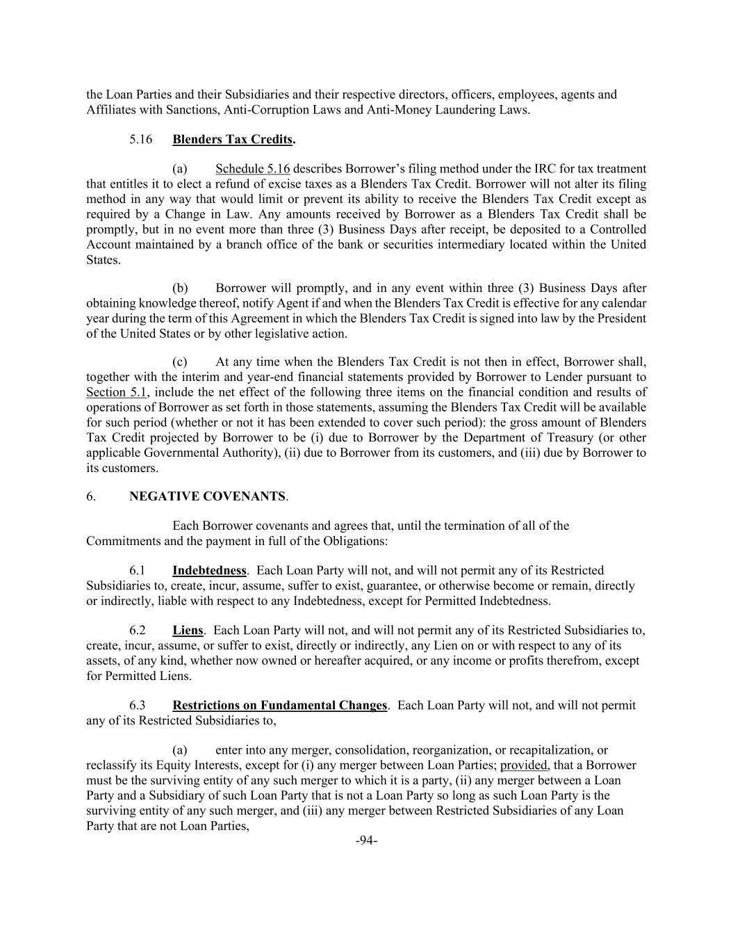 -94- the Loan Parties and their Subsidiaries and their respective directors, officers, employees, agents and Affiliates with Sanctions, Anti-Corruption Laws and Anti-Money Laundering Laws. 5.16 Blenders Tax Credits. (a) Schedule 5.16 describes Borrower’s filing method under the IRC for tax treatment that entitles it to elect a refund of excise taxes as a Blenders Tax Credit. Borrower will not alter its filing method in any way that would limit or prevent its ability to receive the Blenders Tax Credit except as required by a Change in Law. Any amounts received by Borrower as a Blenders Tax Credit shall be promptly, but in no event more than three (3) Business Days after receipt, be deposited to a Controlled Account maintained by a branch office of the bank or securities intermediary located within the United States. (b) Borrower will promptly, and in any event within three (3) Business Days after obtaining knowledge thereof, notify Agent if and when the Blenders Tax Credit is effective for any calendar year during the term of this Agreement in which the Blenders Tax Credit is signed into law by the President of the United States or by other legislative action. (c) At any time when the Blenders Tax Credit is not then in effect, Borrower shall, together with the interim and year-end financial statements provided by Borrower to Lender pursuant to Section 5.1, include the net effect of the following three items on the financial condition and results of operations of Borrower as set forth in those statements, assuming the Blenders Tax Credit will be available for such period (whether or not it has been extended to cover such period): the gross amount of Blenders Tax Credit projected by Borrower to be (i) due to Borrower by the Department of Treasury (or other applicable Governmental Authority), (ii) due to Borrower from its customers, and (iii) due by Borrower to its customers. 6. NEGATIVE COVENANTS. Each Borrower covenants and agrees that, until the termination of all of the Commitments and the payment in full of the Obligations: 6.1 Indebtedness. Each Loan Party will not, and will not permit any of its Restricted Subsidiaries to, create, incur, assume, suffer to exist, guarantee, or otherwise become or remain, directly or indirectly, liable with respect to any Indebtedness, except for Permitted Indebtedness. 6.2 Liens. Each Loan Party will not, and will not permit any of its Restricted Subsidiaries to, create, incur, assume, or suffer to exist, directly or indirectly, any Lien on or with respect to any of its assets, of any kind, whether now owned or hereafter acquired, or any income or profits therefrom, except for Permitted Liens. 6.3 Restrictions on Fundamental Changes. Each Loan Party will not, and will not permit any of its Restricted Subsidiaries to, (a) enter into any merger, consolidation, reorganization, or recapitalization, or reclassify its Equity Interests, except for (i) any merger between Loan Parties; provided, that a Borrower must be the surviving entity of any such merger to which it is a party, (ii) any merger between a Loan Party and a Subsidiary of such Loan Party that is not a Loan Party so long as such Loan Party is the surviving entity of any such merger, and (iii) any merger between Restricted Subsidiaries of any Loan Party that are not Loan Parties,