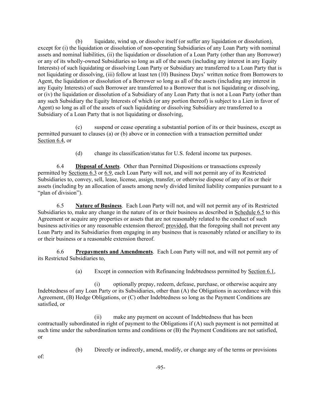 -95- (b) liquidate, wind up, or dissolve itself (or suffer any liquidation or dissolution), except for (i) the liquidation or dissolution of non-operating Subsidiaries of any Loan Party with nominal assets and nominal liabilities, (ii) the liquidation or dissolution of a Loan Party (other than any Borrower) or any of its wholly-owned Subsidiaries so long as all of the assets (including any interest in any Equity Interests) of such liquidating or dissolving Loan Party or Subsidiary are transferred to a Loan Party that is not liquidating or dissolving, (iii) follow at least ten (10) Business Days’ written notice from Borrowers to Agent, the liquidation or dissolution of a Borrower so long as all of the assets (including any interest in any Equity Interests) of such Borrower are transferred to a Borrower that is not liquidating or dissolving, or (iv) the liquidation or dissolution of a Subsidiary of any Loan Party that is not a Loan Party (other than any such Subsidiary the Equity Interests of which (or any portion thereof) is subject to a Lien in favor of Agent) so long as all of the assets of such liquidating or dissolving Subsidiary are transferred to a Subsidiary of a Loan Party that is not liquidating or dissolving, (c) suspend or cease operating a substantial portion of its or their business, except as permitted pursuant to clauses (a) or (b) above or in connection with a transaction permitted under Section 6.4, or (d) change its classification/status for U.S. federal income tax purposes. 6.4 Disposal of Assets. Other than Permitted Dispositions or transactions expressly permitted by Sections 6.3 or 6.9, each Loan Party will not, and will not permit any of its Restricted Subsidiaries to, convey, sell, lease, license, assign, transfer, or otherwise dispose of any of its or their assets (including by an allocation of assets among newly divided limited liability companies pursuant to a “plan of division”). 6.5 Nature of Business. Each Loan Party will not, and will not permit any of its Restricted Subsidiaries to, make any change in the nature of its or their business as described in Schedule 6.5 to this Agreement or acquire any properties or assets that are not reasonably related to the conduct of such business activities or any reasonable extension thereof; provided, that the foregoing shall not prevent any Loan Party and its Subsidiaries from engaging in any business that is reasonably related or ancillary to its or their business or a reasonable extension thereof. 6.6 Prepayments and Amendments. Each Loan Party will not, and will not permit any of its Restricted Subsidiaries to, (a) Except in connection with Refinancing Indebtedness permitted by Section 6.1, (i) optionally prepay, redeem, defease, purchase, or otherwise acquire any Indebtedness of any Loan Party or its Subsidiaries, other than (A) the Obligations in accordance with this Agreement, (B) Hedge Obligations, or (C) other Indebtedness so long as the Payment Conditions are satisfied, or (ii) make any payment on account of Indebtedness that has been contractually subordinated in right of payment to the Obligations if (A) such payment is not permitted at such time under the subordination terms and conditions or (B) the Payment Conditions are not satisfied, or (b) Directly or indirectly, amend, modify, or change any of the terms or provisions of: