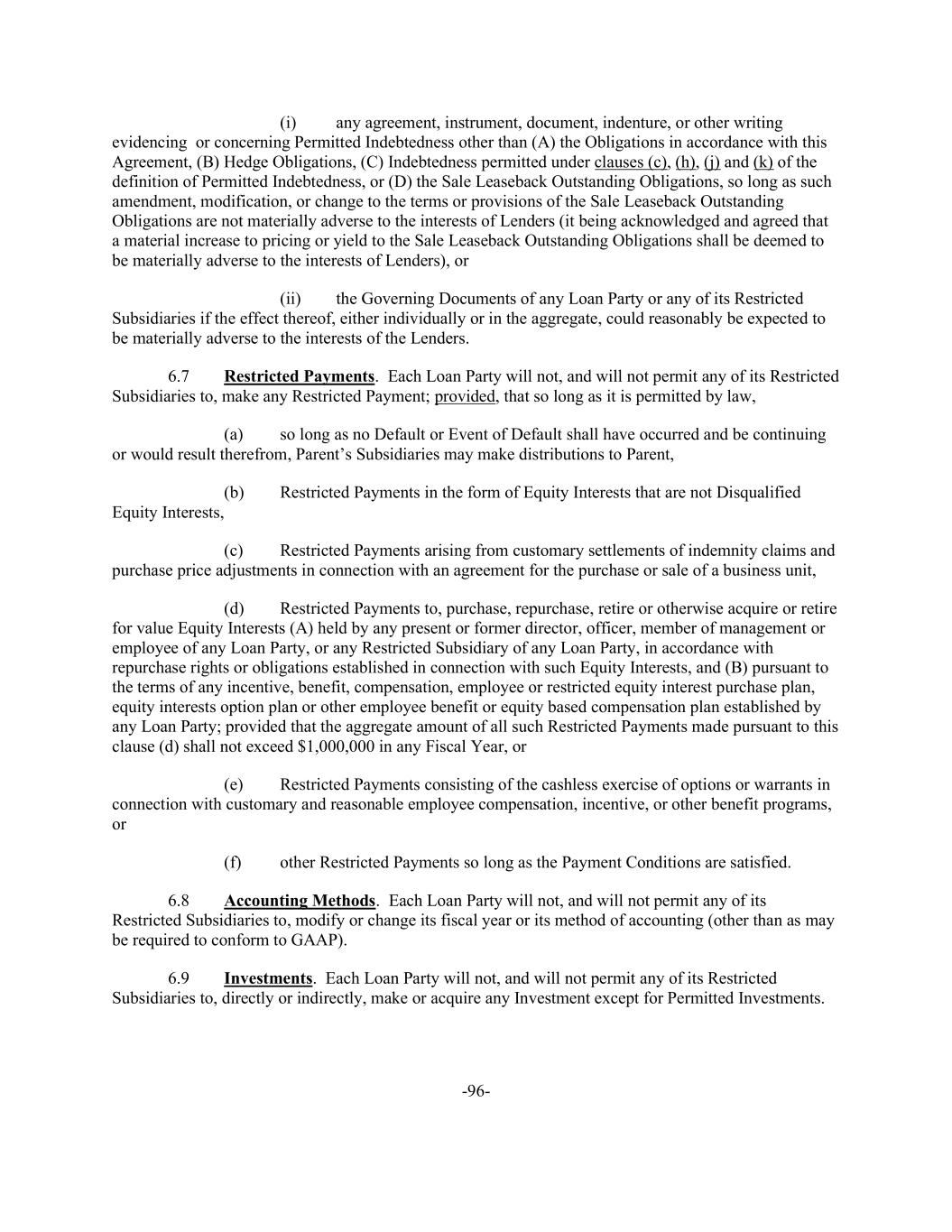 -96- (i) any agreement, instrument, document, indenture, or other writing evidencing or concerning Permitted Indebtedness other than (A) the Obligations in accordance with this Agreement, (B) Hedge Obligations, (C) Indebtedness permitted under clauses (c), (h), (j) and (k) of the definition of Permitted Indebtedness, or (D) the Sale Leaseback Outstanding Obligations, so long as such amendment, modification, or change to the terms or provisions of the Sale Leaseback Outstanding Obligations are not materially adverse to the interests of Lenders (it being acknowledged and agreed that a material increase to pricing or yield to the Sale Leaseback Outstanding Obligations shall be deemed to be materially adverse to the interests of Lenders), or (ii) the Governing Documents of any Loan Party or any of its Restricted Subsidiaries if the effect thereof, either individually or in the aggregate, could reasonably be expected to be materially adverse to the interests of the Lenders. 6.7 Restricted Payments. Each Loan Party will not, and will not permit any of its Restricted Subsidiaries to, make any Restricted Payment; provided, that so long as it is permitted by law, (a) so long as no Default or Event of Default shall have occurred and be continuing or would result therefrom, Parent’s Subsidiaries may make distributions to Parent, (b) Restricted Payments in the form of Equity Interests that are not Disqualified Equity Interests, (c) Restricted Payments arising from customary settlements of indemnity claims and purchase price adjustments in connection with an agreement for the purchase or sale of a business unit, (d) Restricted Payments to, purchase, repurchase, retire or otherwise acquire or retire for value Equity Interests (A) held by any present or former director, officer, member of management or employee of any Loan Party, or any Restricted Subsidiary of any Loan Party, in accordance with repurchase rights or obligations established in connection with such Equity Interests, and (B) pursuant to the terms of any incentive, benefit, compensation, employee or restricted equity interest purchase plan, equity interests option plan or other employee benefit or equity based compensation plan established by any Loan Party; provided that the aggregate amount of all such Restricted Payments made pursuant to this clause (d) shall not exceed $1,000,000 in any Fiscal Year, or (e) Restricted Payments consisting of the cashless exercise of options or warrants in connection with customary and reasonable employee compensation, incentive, or other benefit programs, or (f) other Restricted Payments so long as the Payment Conditions are satisfied. 6.8 Accounting Methods. Each Loan Party will not, and will not permit any of its Restricted Subsidiaries to, modify or change its fiscal year or its method of accounting (other than as may be required to conform to GAAP). 6.9 Investments. Each Loan Party will not, and will not permit any of its Restricted Subsidiaries to, directly or indirectly, make or acquire any Investment except for Permitted Investments.