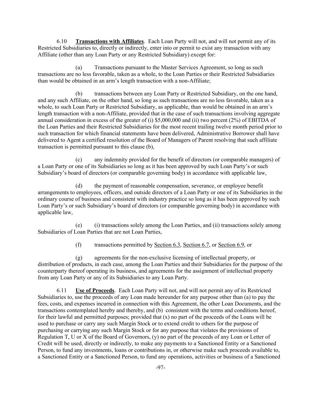 -97- 6.10 Transactions with Affiliates. Each Loan Party will not, and will not permit any of its Restricted Subsidiaries to, directly or indirectly, enter into or permit to exist any transaction with any Affiliate (other than any Loan Party or any Restricted Subsidiary) except for: (a) Transactions pursuant to the Master Services Agreement, so long as such transactions are no less favorable, taken as a whole, to the Loan Parties or their Restricted Subsidiaries than would be obtained in an arm’s length transaction with a non-Affiliate; (b) transactions between any Loan Party or Restricted Subsidiary, on the one hand, and any such Affiliate, on the other hand, so long as such transactions are no less favorable, taken as a whole, to such Loan Party or Restricted Subsidiary, as applicable, than would be obtained in an arm’s length transaction with a non-Affiliate, provided that in the case of such transactions involving aggregate annual consideration in excess of the greater of (i) $5,000,000 and (ii) two percent (2%) of EBITDA of the Loan Parties and their Restricted Subsidiaries for the most recent trailing twelve month period prior to such transaction for which financial statements have been delivered, Administrative Borrower shall have delivered to Agent a certified resolution of the Board of Managers of Parent resolving that such affiliate transaction is permitted pursuant to this clause (b), (c) any indemnity provided for the benefit of directors (or comparable managers) of a Loan Party or one of its Subsidiaries so long as it has been approved by such Loan Party’s or such Subsidiary’s board of directors (or comparable governing body) in accordance with applicable law, (d) the payment of reasonable compensation, severance, or employee benefit arrangements to employees, officers, and outside directors of a Loan Party or one of its Subsidiaries in the ordinary course of business and consistent with industry practice so long as it has been approved by such Loan Party’s or such Subsidiary’s board of directors (or comparable governing body) in accordance with applicable law, (e) (i) transactions solely among the Loan Parties, and (ii) transactions solely among Subsidiaries of Loan Parties that are not Loan Parties, (f) transactions permitted by Section 6.3, Section 6.7, or Section 6.9, or (g) agreements for the non-exclusive licensing of intellectual property, or distribution of products, in each case, among the Loan Parties and their Subsidiaries for the purpose of the counterparty thereof operating its business, and agreements for the assignment of intellectual property from any Loan Party or any of its Subsidiaries to any Loan Party. 6.11 Use of Proceeds. Each Loan Party will not, and will not permit any of its Restricted Subsidiaries to, use the proceeds of any Loan made hereunder for any purpose other than (a) to pay the fees, costs, and expenses incurred in connection with this Agreement, the other Loan Documents, and the transactions contemplated hereby and thereby, and (b) consistent with the terms and conditions hereof, for their lawful and permitted purposes; provided that (x) no part of the proceeds of the Loans will be used to purchase or carry any such Margin Stock or to extend credit to others for the purpose of purchasing or carrying any such Margin Stock or for any purpose that violates the provisions of Regulation T, U or X of the Board of Governors, (y) no part of the proceeds of any Loan or Letter of Credit will be used, directly or indirectly, to make any payments to a Sanctioned Entity or a Sanctioned Person, to fund any investments, loans or contributions in, or otherwise make such proceeds available to, a Sanctioned Entity or a Sanctioned Person, to fund any operations, activities or business of a Sanctioned