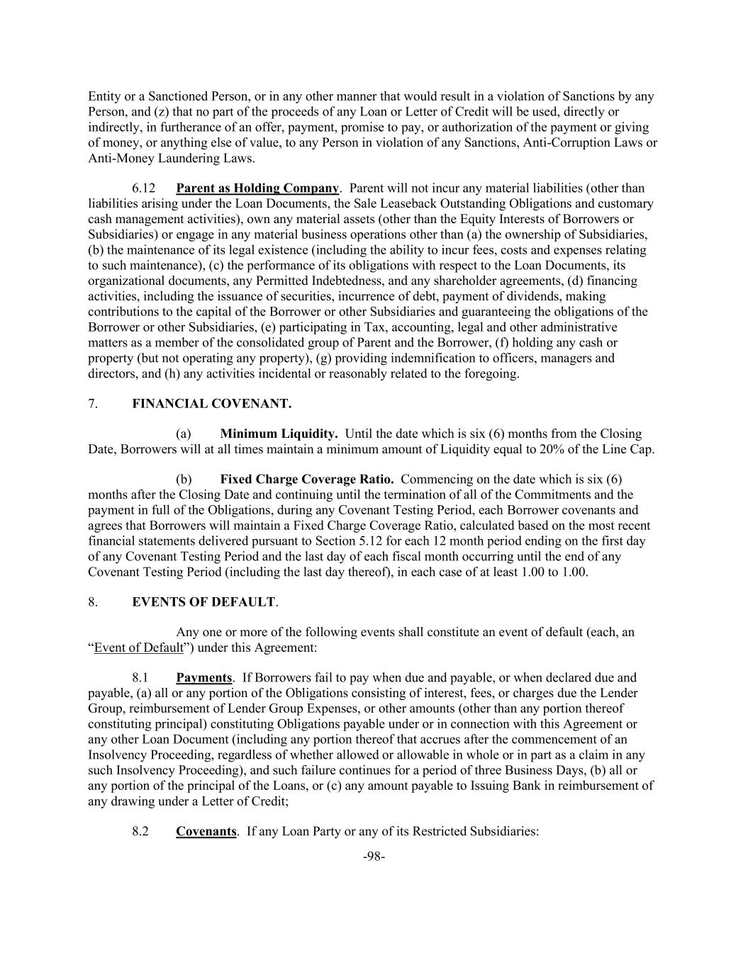 -98- Entity or a Sanctioned Person, or in any other manner that would result in a violation of Sanctions by any Person, and (z) that no part of the proceeds of any Loan or Letter of Credit will be used, directly or indirectly, in furtherance of an offer, payment, promise to pay, or authorization of the payment or giving of money, or anything else of value, to any Person in violation of any Sanctions, Anti-Corruption Laws or Anti-Money Laundering Laws. 6.12 Parent as Holding Company. Parent will not incur any material liabilities (other than liabilities arising under the Loan Documents, the Sale Leaseback Outstanding Obligations and customary cash management activities), own any material assets (other than the Equity Interests of Borrowers or Subsidiaries) or engage in any material business operations other than (a) the ownership of Subsidiaries, (b) the maintenance of its legal existence (including the ability to incur fees, costs and expenses relating to such maintenance), (c) the performance of its obligations with respect to the Loan Documents, its organizational documents, any Permitted Indebtedness, and any shareholder agreements, (d) financing activities, including the issuance of securities, incurrence of debt, payment of dividends, making contributions to the capital of the Borrower or other Subsidiaries and guaranteeing the obligations of the Borrower or other Subsidiaries, (e) participating in Tax, accounting, legal and other administrative matters as a member of the consolidated group of Parent and the Borrower, (f) holding any cash or property (but not operating any property), (g) providing indemnification to officers, managers and directors, and (h) any activities incidental or reasonably related to the foregoing. 7. FINANCIAL COVENANT. (a) Minimum Liquidity. Until the date which is six (6) months from the Closing Date, Borrowers will at all times maintain a minimum amount of Liquidity equal to 20% of the Line Cap. (b) Fixed Charge Coverage Ratio. Commencing on the date which is six (6) months after the Closing Date and continuing until the termination of all of the Commitments and the payment in full of the Obligations, during any Covenant Testing Period, each Borrower covenants and agrees that Borrowers will maintain a Fixed Charge Coverage Ratio, calculated based on the most recent financial statements delivered pursuant to Section 5.12 for each 12 month period ending on the first day of any Covenant Testing Period and the last day of each fiscal month occurring until the end of any Covenant Testing Period (including the last day thereof), in each case of at least 1.00 to 1.00. 8. EVENTS OF DEFAULT. Any one or more of the following events shall constitute an event of default (each, an “Event of Default”) under this Agreement: 8.1 Payments. If Borrowers fail to pay when due and payable, or when declared due and payable, (a) all or any portion of the Obligations consisting of interest, fees, or charges due the Lender Group, reimbursement of Lender Group Expenses, or other amounts (other than any portion thereof constituting principal) constituting Obligations payable under or in connection with this Agreement or any other Loan Document (including any portion thereof that accrues after the commencement of an Insolvency Proceeding, regardless of whether allowed or allowable in whole or in part as a claim in any such Insolvency Proceeding), and such failure continues for a period of three Business Days, (b) all or any portion of the principal of the Loans, or (c) any amount payable to Issuing Bank in reimbursement of any drawing under a Letter of Credit; 8.2 Covenants. If any Loan Party or any of its Restricted Subsidiaries:
