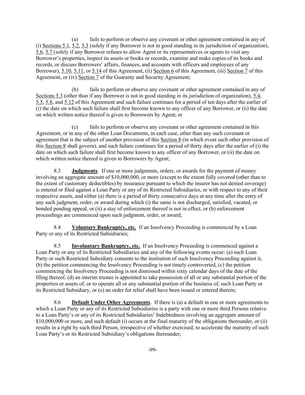-99- (a) fails to perform or observe any covenant or other agreement contained in any of (i) Sections 5.1, 5.2, 5.3 (solely if any Borrower is not in good standing in its jurisdiction of organization), 5.6, 5.7 (solely if any Borrower refuses to allow Agent or its representatives or agents to visit any Borrower’s properties, inspect its assets or books or records, examine and make copies of its books and records, or discuss Borrowers’ affairs, finances, and accounts with officers and employees of any Borrower), 5.10, 5.11, or 5.14 of this Agreement, (ii) Section 6 of this Agreement, (iii) Section 7 of this Agreement, or (iv) Section 7 of the Guaranty and Security Agreement; (b) fails to perform or observe any covenant or other agreement contained in any of Sections 5.3 (other than if any Borrower is not in good standing in its jurisdiction of organization), 5.4, 5.5, 5.8, and 5.12 of this Agreement and such failure continues for a period of ten days after the earlier of (i) the date on which such failure shall first become known to any officer of any Borrower, or (ii) the date on which written notice thereof is given to Borrowers by Agent; or (c) fails to perform or observe any covenant or other agreement contained in this Agreement, or in any of the other Loan Documents, in each case, other than any such covenant or agreement that is the subject of another provision of this Section 8 (in which event such other provision of this Section 8 shall govern), and such failure continues for a period of thirty days after the earlier of (i) the date on which such failure shall first become known to any officer of any Borrower, or (ii) the date on which written notice thereof is given to Borrowers by Agent; 8.3 Judgments. If one or more judgments, orders, or awards for the payment of money involving an aggregate amount of $10,000,000, or more (except to the extent fully covered (other than to the extent of customary deductibles) by insurance pursuant to which the insurer has not denied coverage) is entered or filed against a Loan Party or any of its Restricted Subsidiaries, or with respect to any of their respective assets, and either (a) there is a period of thirty consecutive days at any time after the entry of any such judgment, order, or award during which (i) the same is not discharged, satisfied, vacated, or bonded pending appeal, or (ii) a stay of enforcement thereof is not in effect, or (b) enforcement proceedings are commenced upon such judgment, order, or award; 8.4 Voluntary Bankruptcy, etc. If an Insolvency Proceeding is commenced by a Loan Party or any of its Restricted Subsidiaries; 8.5 Involuntary Bankruptcy, etc. If an Insolvency Proceeding is commenced against a Loan Party or any of its Restricted Subsidiaries and any of the following events occur: (a) such Loan Party or such Restricted Subsidiary consents to the institution of such Insolvency Proceeding against it, (b) the petition commencing the Insolvency Proceeding is not timely controverted, (c) the petition commencing the Insolvency Proceeding is not dismissed within sixty calendar days of the date of the filing thereof, (d) an interim trustee is appointed to take possession of all or any substantial portion of the properties or assets of, or to operate all or any substantial portion of the business of, such Loan Party or its Restricted Subsidiary, or (e) an order for relief shall have been issued or entered therein; 8.6 Default Under Other Agreements. If there is (a) a default in one or more agreements to which a Loan Party or any of its Restricted Subsidiaries is a party with one or more third Persons relative to a Loan Party’s or any of its Restricted Subsidiaries’ Indebtedness involving an aggregate amount of $10,000,000 or more, and such default (i) occurs at the final maturity of the obligations thereunder, or (ii) results in a right by such third Person, irrespective of whether exercised, to accelerate the maturity of such Loan Party’s or its Restricted Subsidiary’s obligations thereunder;