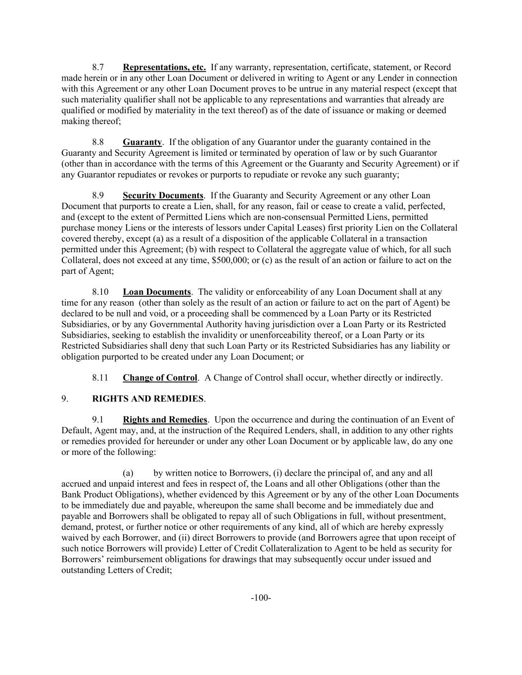 -100- 8.7 Representations, etc. If any warranty, representation, certificate, statement, or Record made herein or in any other Loan Document or delivered in writing to Agent or any Lender in connection with this Agreement or any other Loan Document proves to be untrue in any material respect (except that such materiality qualifier shall not be applicable to any representations and warranties that already are qualified or modified by materiality in the text thereof) as of the date of issuance or making or deemed making thereof; 8.8 Guaranty. If the obligation of any Guarantor under the guaranty contained in the Guaranty and Security Agreement is limited or terminated by operation of law or by such Guarantor (other than in accordance with the terms of this Agreement or the Guaranty and Security Agreement) or if any Guarantor repudiates or revokes or purports to repudiate or revoke any such guaranty; 8.9 Security Documents. If the Guaranty and Security Agreement or any other Loan Document that purports to create a Lien, shall, for any reason, fail or cease to create a valid, perfected, and (except to the extent of Permitted Liens which are non-consensual Permitted Liens, permitted purchase money Liens or the interests of lessors under Capital Leases) first priority Lien on the Collateral covered thereby, except (a) as a result of a disposition of the applicable Collateral in a transaction permitted under this Agreement; (b) with respect to Collateral the aggregate value of which, for all such Collateral, does not exceed at any time, $500,000; or (c) as the result of an action or failure to act on the part of Agent; 8.10 Loan Documents. The validity or enforceability of any Loan Document shall at any time for any reason (other than solely as the result of an action or failure to act on the part of Agent) be declared to be null and void, or a proceeding shall be commenced by a Loan Party or its Restricted Subsidiaries, or by any Governmental Authority having jurisdiction over a Loan Party or its Restricted Subsidiaries, seeking to establish the invalidity or unenforceability thereof, or a Loan Party or its Restricted Subsidiaries shall deny that such Loan Party or its Restricted Subsidiaries has any liability or obligation purported to be created under any Loan Document; or 8.11 Change of Control. A Change of Control shall occur, whether directly or indirectly. 9. RIGHTS AND REMEDIES. 9.1 Rights and Remedies. Upon the occurrence and during the continuation of an Event of Default, Agent may, and, at the instruction of the Required Lenders, shall, in addition to any other rights or remedies provided for hereunder or under any other Loan Document or by applicable law, do any one or more of the following: (a) by written notice to Borrowers, (i) declare the principal of, and any and all accrued and unpaid interest and fees in respect of, the Loans and all other Obligations (other than the Bank Product Obligations), whether evidenced by this Agreement or by any of the other Loan Documents to be immediately due and payable, whereupon the same shall become and be immediately due and payable and Borrowers shall be obligated to repay all of such Obligations in full, without presentment, demand, protest, or further notice or other requirements of any kind, all of which are hereby expressly waived by each Borrower, and (ii) direct Borrowers to provide (and Borrowers agree that upon receipt of such notice Borrowers will provide) Letter of Credit Collateralization to Agent to be held as security for Borrowers’ reimbursement obligations for drawings that may subsequently occur under issued and outstanding Letters of Credit;