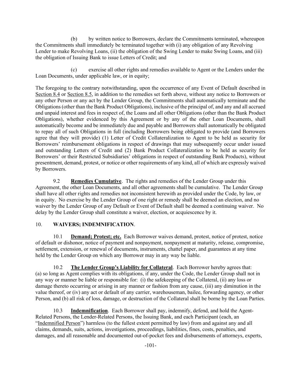 -101- (b) by written notice to Borrowers, declare the Commitments terminated, whereupon the Commitments shall immediately be terminated together with (i) any obligation of any Revolving Lender to make Revolving Loans, (ii) the obligation of the Swing Lender to make Swing Loans, and (iii) the obligation of Issuing Bank to issue Letters of Credit; and (c) exercise all other rights and remedies available to Agent or the Lenders under the Loan Documents, under applicable law, or in equity; The foregoing to the contrary notwithstanding, upon the occurrence of any Event of Default described in Section 8.4 or Section 8.5, in addition to the remedies set forth above, without any notice to Borrowers or any other Person or any act by the Lender Group, the Commitments shall automatically terminate and the Obligations (other than the Bank Product Obligations), inclusive of the principal of, and any and all accrued and unpaid interest and fees in respect of, the Loans and all other Obligations (other than the Bank Product Obligations), whether evidenced by this Agreement or by any of the other Loan Documents, shall automatically become and be immediately due and payable and Borrowers shall automatically be obligated to repay all of such Obligations in full (including Borrowers being obligated to provide (and Borrowers agree that they will provide) (1) Letter of Credit Collateralization to Agent to be held as security for Borrowers’ reimbursement obligations in respect of drawings that may subsequently occur under issued and outstanding Letters of Credit and (2) Bank Product Collateralization to be held as security for Borrowers’ or their Restricted Subsidiaries’ obligations in respect of outstanding Bank Products), without presentment, demand, protest, or notice or other requirements of any kind, all of which are expressly waived by Borrowers. 9.2 Remedies Cumulative. The rights and remedies of the Lender Group under this Agreement, the other Loan Documents, and all other agreements shall be cumulative. The Lender Group shall have all other rights and remedies not inconsistent herewith as provided under the Code, by law, or in equity. No exercise by the Lender Group of one right or remedy shall be deemed an election, and no waiver by the Lender Group of any Default or Event of Default shall be deemed a continuing waiver. No delay by the Lender Group shall constitute a waiver, election, or acquiescence by it. 10. WAIVERS; INDEMNIFICATION. 10.1 Demand; Protest; etc. Each Borrower waives demand, protest, notice of protest, notice of default or dishonor, notice of payment and nonpayment, nonpayment at maturity, release, compromise, settlement, extension, or renewal of documents, instruments, chattel paper, and guarantees at any time held by the Lender Group on which any Borrower may in any way be liable. 10.2 The Lender Group’s Liability for Collateral. Each Borrower hereby agrees that: (a) so long as Agent complies with its obligations, if any, under the Code, the Lender Group shall not in any way or manner be liable or responsible for: (i) the safekeeping of the Collateral, (ii) any loss or damage thereto occurring or arising in any manner or fashion from any cause, (iii) any diminution in the value thereof, or (iv) any act or default of any carrier, warehouseman, bailee, forwarding agency, or other Person, and (b) all risk of loss, damage, or destruction of the Collateral shall be borne by the Loan Parties. 10.3 Indemnification. Each Borrower shall pay, indemnify, defend, and hold the Agent- Related Persons, the Lender-Related Persons, the Issuing Bank, and each Participant (each, an “Indemnified Person”) harmless (to the fullest extent permitted by law) from and against any and all claims, demands, suits, actions, investigations, proceedings, liabilities, fines, costs, penalties, and damages, and all reasonable and documented out-of-pocket fees and disbursements of attorneys, experts,