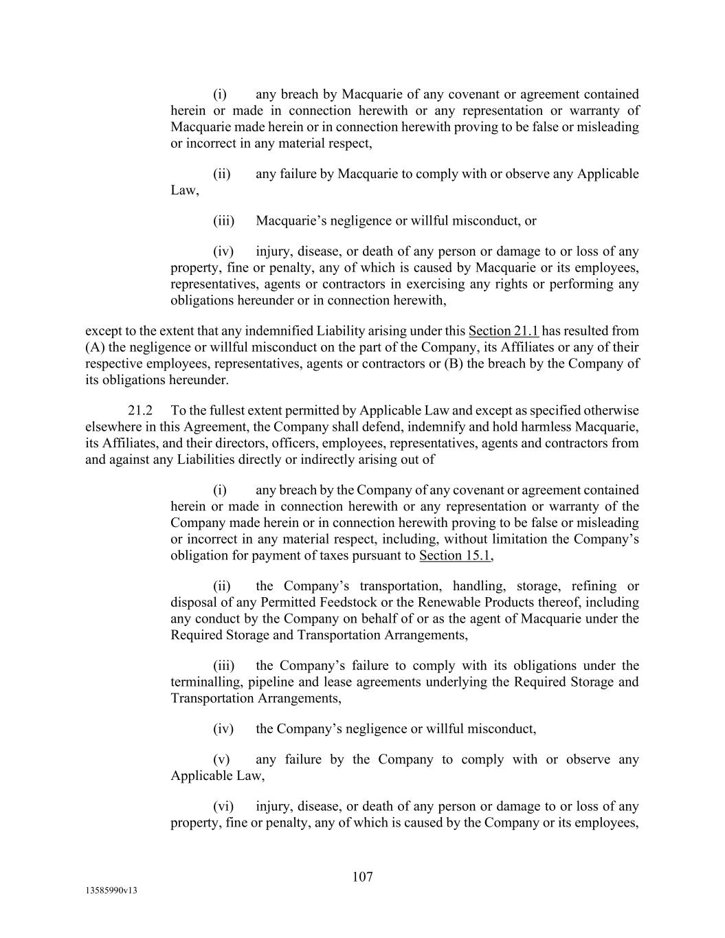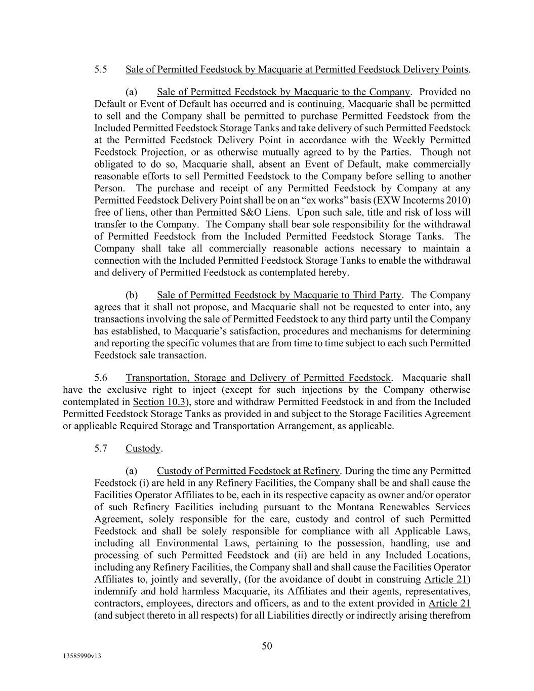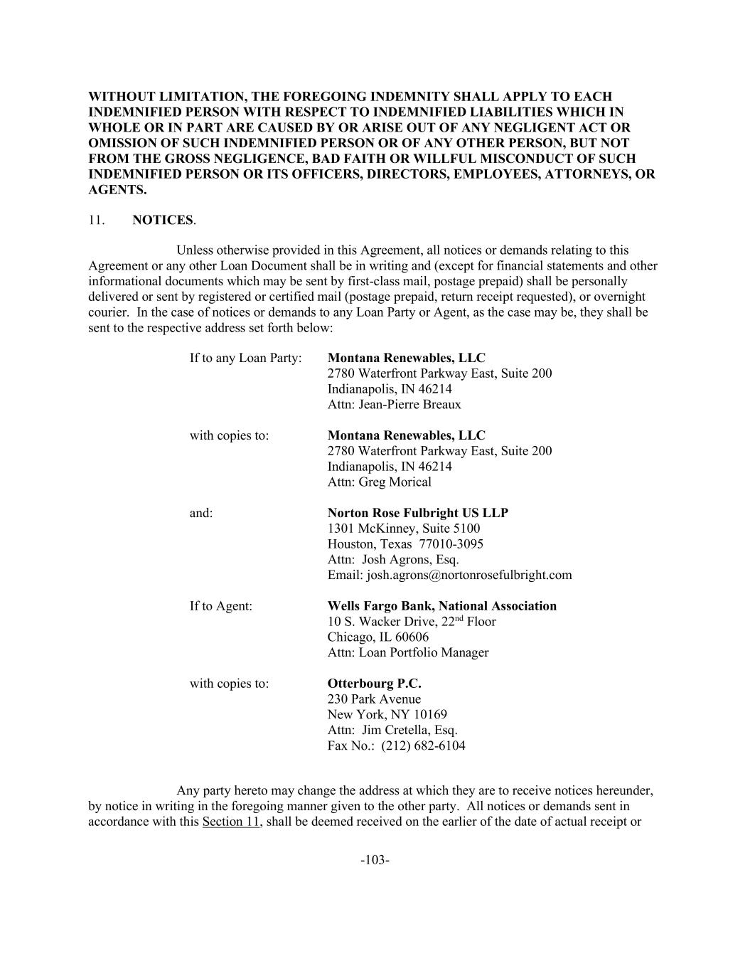 -103- WITHOUT LIMITATION, THE FOREGOING INDEMNITY SHALL APPLY TO EACH INDEMNIFIED PERSON WITH RESPECT TO INDEMNIFIED LIABILITIES WHICH IN WHOLE OR IN PART ARE CAUSED BY OR ARISE OUT OF ANY NEGLIGENT ACT OR OMISSION OF SUCH INDEMNIFIED PERSON OR OF ANY OTHER PERSON, BUT NOT FROM THE GROSS NEGLIGENCE, BAD FAITH OR WILLFUL MISCONDUCT OF SUCH INDEMNIFIED PERSON OR ITS OFFICERS, DIRECTORS, EMPLOYEES, ATTORNEYS, OR AGENTS. 11. NOTICES. Unless otherwise provided in this Agreement, all notices or demands relating to this Agreement or any other Loan Document shall be in writing and (except for financial statements and other informational documents which may be sent by first-class mail, postage prepaid) shall be personally delivered or sent by registered or certified mail (postage prepaid, return receipt requested), or overnight courier. In the case of notices or demands to any Loan Party or Agent, as the case may be, they shall be sent to the respective address set forth below: If to any Loan Party: Montana Renewables, LLC 2780 Waterfront Parkway East, Suite 200 Indianapolis, IN 46214 Attn: Jean-Pierre Breaux with copies to: Montana Renewables, LLC 2780 Waterfront Parkway East, Suite 200 Indianapolis, IN 46214 Attn: Greg Morical and: Norton Rose Fulbright US LLP 1301 McKinney, Suite 5100 Houston, Texas 77010-3095 Attn: Josh Agrons, Esq. Email: josh.agrons@nortonrosefulbright.com If to Agent: Wells Fargo Bank, National Association 10 S. Wacker Drive, 22nd Floor Chicago, IL 60606 Attn: Loan Portfolio Manager with copies to: Otterbourg P.C. 230 Park Avenue New York, NY 10169 Attn: Jim Cretella, Esq. Fax No.: (212) 682-6104 Any party hereto may change the address at which they are to receive notices hereunder, by notice in writing in the foregoing manner given to the other party. All notices or demands sent in accordance with this Section 11, shall be deemed received on the earlier of the date of actual receipt or