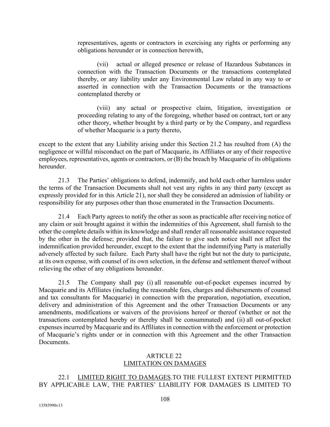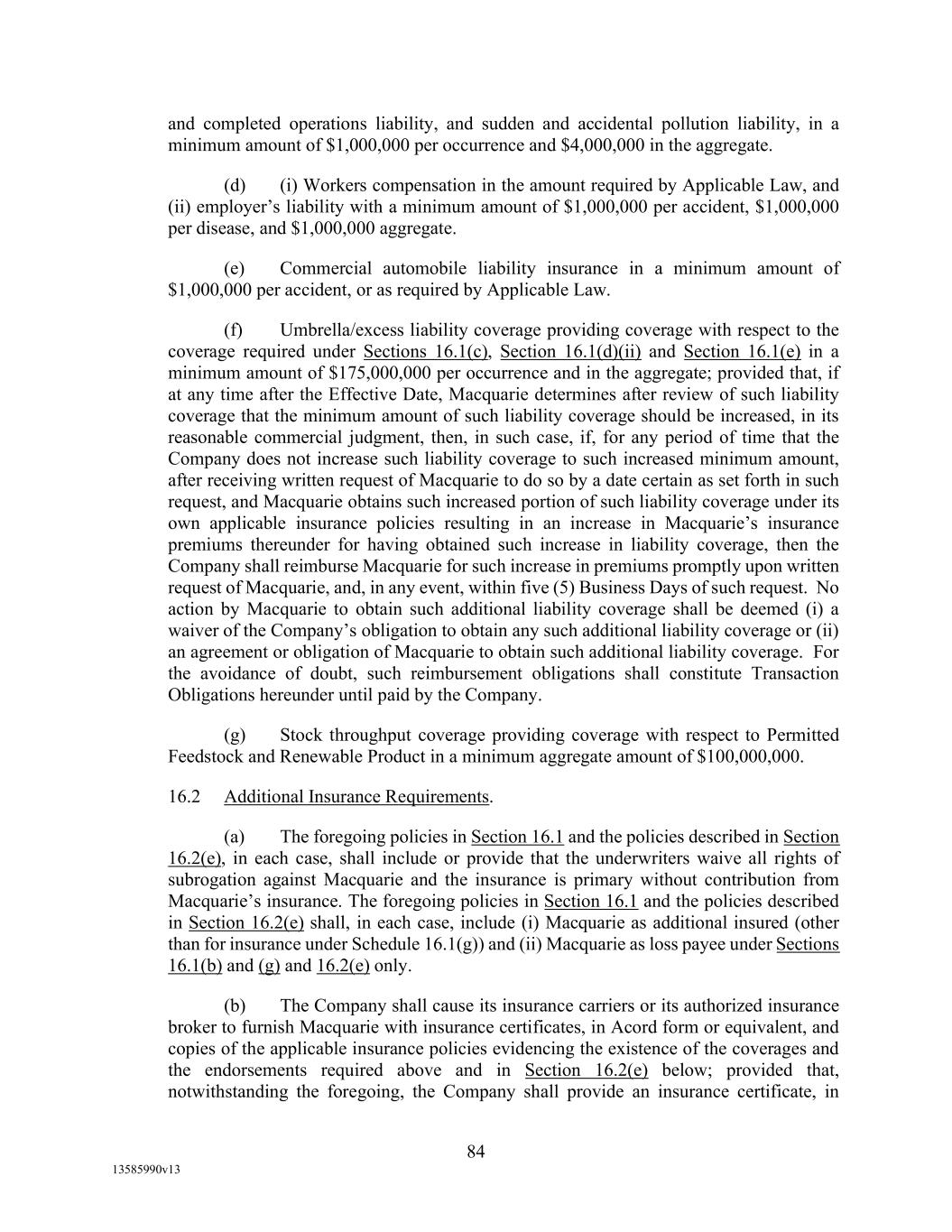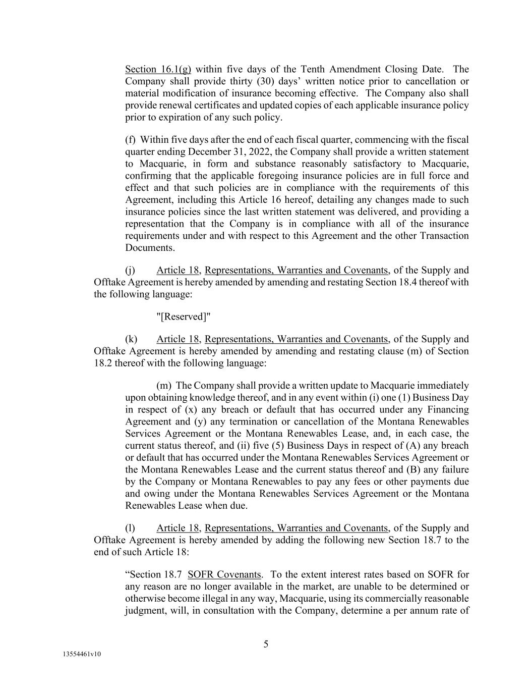 -103- WITHOUT LIMITATION, THE FOREGOING INDEMNITY SHALL APPLY TO EACH INDEMNIFIED PERSON WITH RESPECT TO INDEMNIFIED LIABILITIES WHICH IN WHOLE OR IN PART ARE CAUSED BY OR ARISE OUT OF ANY NEGLIGENT ACT OR OMISSION OF SUCH INDEMNIFIED PERSON OR OF ANY OTHER PERSON, BUT NOT FROM THE GROSS NEGLIGENCE, BAD FAITH OR WILLFUL MISCONDUCT OF SUCH INDEMNIFIED PERSON OR ITS OFFICERS, DIRECTORS, EMPLOYEES, ATTORNEYS, OR AGENTS. 11. NOTICES. Unless otherwise provided in this Agreement, all notices or demands relating to this Agreement or any other Loan Document shall be in writing and (except for financial statements and other informational documents which may be sent by first-class mail, postage prepaid) shall be personally delivered or sent by registered or certified mail (postage prepaid, return receipt requested), or overnight courier. In the case of notices or demands to any Loan Party or Agent, as the case may be, they shall be sent to the respective address set forth below: If to any Loan Party: Montana Renewables, LLC 2780 Waterfront Parkway East, Suite 200 Indianapolis, IN 46214 Attn: Jean-Pierre Breaux with copies to: Montana Renewables, LLC 2780 Waterfront Parkway East, Suite 200 Indianapolis, IN 46214 Attn: Greg Morical and: Norton Rose Fulbright US LLP 1301 McKinney, Suite 5100 Houston, Texas 77010-3095 Attn: Josh Agrons, Esq. Email: josh.agrons@nortonrosefulbright.com If to Agent: Wells Fargo Bank, National Association 10 S. Wacker Drive, 22nd Floor Chicago, IL 60606 Attn: Loan Portfolio Manager with copies to: Otterbourg P.C. 230 Park Avenue New York, NY 10169 Attn: Jim Cretella, Esq. Fax No.: (212) 682-6104 Any party hereto may change the address at which they are to receive notices hereunder, by notice in writing in the foregoing manner given to the other party. All notices or demands sent in accordance with this Section 11, shall be deemed received on the earlier of the date of actual receipt or