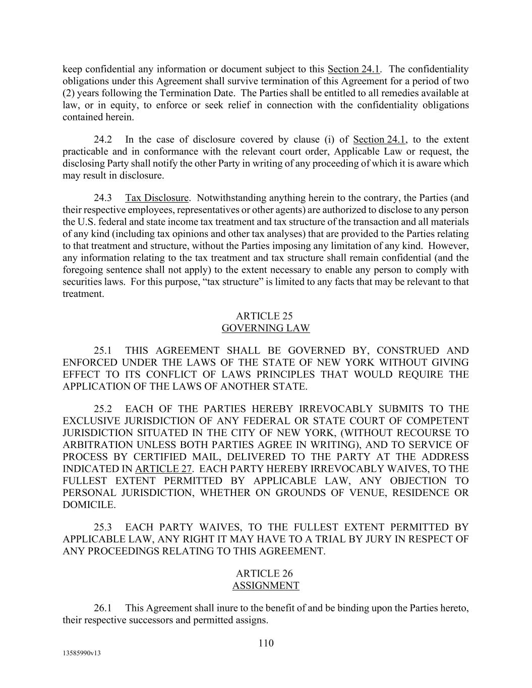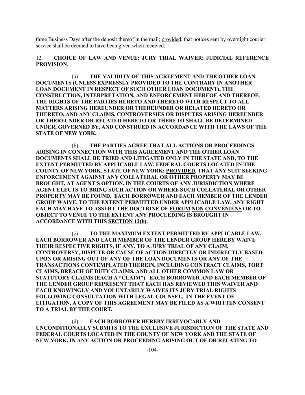 -104- three Business Days after the deposit thereof in the mail; provided, that notices sent by overnight courier service shall be deemed to have been given when received. 12. CHOICE OF LAW AND VENUE; JURY TRIAL WAIVER; JUDICIAL REFERENCE PROVISION. (a) THE VALIDITY OF THIS AGREEMENT AND THE OTHER LOAN DOCUMENTS (UNLESS EXPRESSLY PROVIDED TO THE CONTRARY IN ANOTHER LOAN DOCUMENT IN RESPECT OF SUCH OTHER LOAN DOCUMENT), THE CONSTRUCTION, INTERPRETATION, AND ENFORCEMENT HEREOF AND THEREOF, THE RIGHTS OF THE PARTIES HERETO AND THERETO WITH RESPECT TO ALL MATTERS ARISING HEREUNDER OR THEREUNDER OR RELATED HERETO OR THERETO, AND ANY CLAIMS, CONTROVERSIES OR DISPUTES ARISING HEREUNDER OR THEREUNDER OR RELATED HERETO OR THERETO SHALL BE DETERMINED UNDER, GOVERNED BY, AND CONSTRUED IN ACCORDANCE WITH THE LAWS OF THE STATE OF NEW YORK. (b) THE PARTIES AGREE THAT ALL ACTIONS OR PROCEEDINGS ARISING IN CONNECTION WITH THIS AGREEMENT AND THE OTHER LOAN DOCUMENTS SHALL BE TRIED AND LITIGATED ONLY IN THE STATE AND, TO THE EXTENT PERMITTED BY APPLICABLE LAW, FEDERAL COURTS LOCATED IN THE COUNTY OF NEW YORK, STATE OF NEW YORK; PROVIDED, THAT ANY SUIT SEEKING ENFORCEMENT AGAINST ANY COLLATERAL OR OTHER PROPERTY MAY BE BROUGHT, AT AGENT’S OPTION, IN THE COURTS OF ANY JURISDICTION WHERE AGENT ELECTS TO BRING SUCH ACTION OR WHERE SUCH COLLATERAL OR OTHER PROPERTY MAY BE FOUND. EACH BORROWER AND EACH MEMBER OF THE LENDER GROUP WAIVE, TO THE EXTENT PERMITTED UNDER APPLICABLE LAW, ANY RIGHT EACH MAY HAVE TO ASSERT THE DOCTRINE OF FORUM NON CONVENIENS OR TO OBJECT TO VENUE TO THE EXTENT ANY PROCEEDING IS BROUGHT IN ACCORDANCE WITH THIS SECTION 12(b). (c) TO THE MAXIMUM EXTENT PERMITTED BY APPLICABLE LAW, EACH BORROWER AND EACH MEMBER OF THE LENDER GROUP HEREBY WAIVE THEIR RESPECTIVE RIGHTS, IF ANY, TO A JURY TRIAL OF ANY CLAIM, CONTROVERSY, DISPUTE OR CAUSE OF ACTION DIRECTLY OR INDIRECTLY BASED UPON OR ARISING OUT OF ANY OF THE LOAN DOCUMENTS OR ANY OF THE TRANSACTIONS CONTEMPLATED THEREIN, INCLUDING CONTRACT CLAIMS, TORT CLAIMS, BREACH OF DUTY CLAIMS, AND ALL OTHER COMMON LAW OR STATUTORY CLAIMS (EACH A “CLAIM”). EACH BORROWER AND EACH MEMBER OF THE LENDER GROUP REPRESENT THAT EACH HAS REVIEWED THIS WAIVER AND EACH KNOWINGLY AND VOLUNTARILY WAIVES ITS JURY TRIAL RIGHTS FOLLOWING CONSULTATION WITH LEGAL COUNSEL. IN THE EVENT OF LITIGATION, A COPY OF THIS AGREEMENT MAY BE FILED AS A WRITTEN CONSENT TO A TRIAL BY THE COURT. (d) EACH BORROWER HEREBY IRREVOCABLY AND UNCONDITIONALLY SUBMITS TO THE EXCLUSIVE JURISDICTION OF THE STATE AND FEDERAL COURTS LOCATED IN THE COUNTY OF NEW YORK AND THE STATE OF NEW YORK, IN ANY ACTION OR PROCEEDING ARISING OUT OF OR RELATING TO