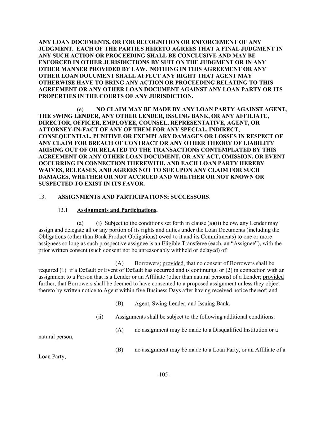 -105- ANY LOAN DOCUMENTS, OR FOR RECOGNITION OR ENFORCEMENT OF ANY JUDGMENT. EACH OF THE PARTIES HERETO AGREES THAT A FINAL JUDGMENT IN ANY SUCH ACTION OR PROCEEDING SHALL BE CONCLUSIVE AND MAY BE ENFORCED IN OTHER JURISDICTIONS BY SUIT ON THE JUDGMENT OR IN ANY OTHER MANNER PROVIDED BY LAW. NOTHING IN THIS AGREEMENT OR ANY OTHER LOAN DOCUMENT SHALL AFFECT ANY RIGHT THAT AGENT MAY OTHERWISE HAVE TO BRING ANY ACTION OR PROCEEDING RELATING TO THIS AGREEMENT OR ANY OTHER LOAN DOCUMENT AGAINST ANY LOAN PARTY OR ITS PROPERTIES IN THE COURTS OF ANY JURISDICTION. (e) NO CLAIM MAY BE MADE BY ANY LOAN PARTY AGAINST AGENT, THE SWING LENDER, ANY OTHER LENDER, ISSUING BANK, OR ANY AFFILIATE, DIRECTOR, OFFICER, EMPLOYEE, COUNSEL, REPRESENTATIVE, AGENT, OR ATTORNEY-IN-FACT OF ANY OF THEM FOR ANY SPECIAL, INDIRECT, CONSEQUENTIAL, PUNITIVE OR EXEMPLARY DAMAGES OR LOSSES IN RESPECT OF ANY CLAIM FOR BREACH OF CONTRACT OR ANY OTHER THEORY OF LIABILITY ARISING OUT OF OR RELATED TO THE TRANSACTIONS CONTEMPLATED BY THIS AGREEMENT OR ANY OTHER LOAN DOCUMENT, OR ANY ACT, OMISSION, OR EVENT OCCURRING IN CONNECTION THEREWITH, AND EACH LOAN PARTY HEREBY WAIVES, RELEASES, AND AGREES NOT TO SUE UPON ANY CLAIM FOR SUCH DAMAGES, WHETHER OR NOT ACCRUED AND WHETHER OR NOT KNOWN OR SUSPECTED TO EXIST IN ITS FAVOR. 13. ASSIGNMENTS AND PARTICIPATIONS; SUCCESSORS. 13.1 Assignments and Participations. (a) (i) Subject to the conditions set forth in clause (a)(ii) below, any Lender may assign and delegate all or any portion of its rights and duties under the Loan Documents (including the Obligations (other than Bank Product Obligations) owed to it and its Commitments) to one or more assignees so long as such prospective assignee is an Eligible Transferee (each, an “Assignee”), with the prior written consent (such consent not be unreasonably withheld or delayed) of: (A) Borrowers; provided, that no consent of Borrowers shall be required (1) if a Default or Event of Default has occurred and is continuing, or (2) in connection with an assignment to a Person that is a Lender or an Affiliate (other than natural persons) of a Lender; provided further, that Borrowers shall be deemed to have consented to a proposed assignment unless they object thereto by written notice to Agent within five Business Days after having received notice thereof; and (B) Agent, Swing Lender, and Issuing Bank. (ii) Assignments shall be subject to the following additional conditions: (A) no assignment may be made to a Disqualified Institution or a natural person, (B) no assignment may be made to a Loan Party, or an Affiliate of a Loan Party,