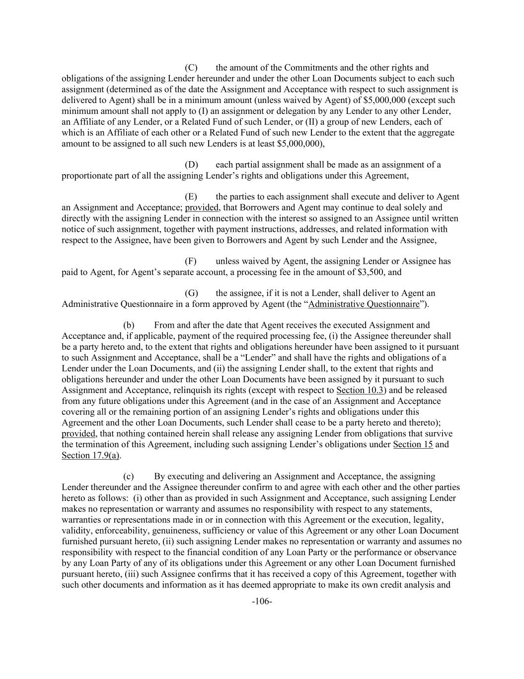 -106- (C) the amount of the Commitments and the other rights and obligations of the assigning Lender hereunder and under the other Loan Documents subject to each such assignment (determined as of the date the Assignment and Acceptance with respect to such assignment is delivered to Agent) shall be in a minimum amount (unless waived by Agent) of $5,000,000 (except such minimum amount shall not apply to (I) an assignment or delegation by any Lender to any other Lender, an Affiliate of any Lender, or a Related Fund of such Lender, or (II) a group of new Lenders, each of which is an Affiliate of each other or a Related Fund of such new Lender to the extent that the aggregate amount to be assigned to all such new Lenders is at least $5,000,000), (D) each partial assignment shall be made as an assignment of a proportionate part of all the assigning Lender’s rights and obligations under this Agreement, (E) the parties to each assignment shall execute and deliver to Agent an Assignment and Acceptance; provided, that Borrowers and Agent may continue to deal solely and directly with the assigning Lender in connection with the interest so assigned to an Assignee until written notice of such assignment, together with payment instructions, addresses, and related information with respect to the Assignee, have been given to Borrowers and Agent by such Lender and the Assignee, (F) unless waived by Agent, the assigning Lender or Assignee has paid to Agent, for Agent’s separate account, a processing fee in the amount of $3,500, and (G) the assignee, if it is not a Lender, shall deliver to Agent an Administrative Questionnaire in a form approved by Agent (the “Administrative Questionnaire”). (b) From and after the date that Agent receives the executed Assignment and Acceptance and, if applicable, payment of the required processing fee, (i) the Assignee thereunder shall be a party hereto and, to the extent that rights and obligations hereunder have been assigned to it pursuant to such Assignment and Acceptance, shall be a “Lender” and shall have the rights and obligations of a Lender under the Loan Documents, and (ii) the assigning Lender shall, to the extent that rights and obligations hereunder and under the other Loan Documents have been assigned by it pursuant to such Assignment and Acceptance, relinquish its rights (except with respect to Section 10.3) and be released from any future obligations under this Agreement (and in the case of an Assignment and Acceptance covering all or the remaining portion of an assigning Lender’s rights and obligations under this Agreement and the other Loan Documents, such Lender shall cease to be a party hereto and thereto); provided, that nothing contained herein shall release any assigning Lender from obligations that survive the termination of this Agreement, including such assigning Lender’s obligations under Section 15 and Section 17.9(a). (c) By executing and delivering an Assignment and Acceptance, the assigning Lender thereunder and the Assignee thereunder confirm to and agree with each other and the other parties hereto as follows: (i) other than as provided in such Assignment and Acceptance, such assigning Lender makes no representation or warranty and assumes no responsibility with respect to any statements, warranties or representations made in or in connection with this Agreement or the execution, legality, validity, enforceability, genuineness, sufficiency or value of this Agreement or any other Loan Document furnished pursuant hereto, (ii) such assigning Lender makes no representation or warranty and assumes no responsibility with respect to the financial condition of any Loan Party or the performance or observance by any Loan Party of any of its obligations under this Agreement or any other Loan Document furnished pursuant hereto, (iii) such Assignee confirms that it has received a copy of this Agreement, together with such other documents and information as it has deemed appropriate to make its own credit analysis and