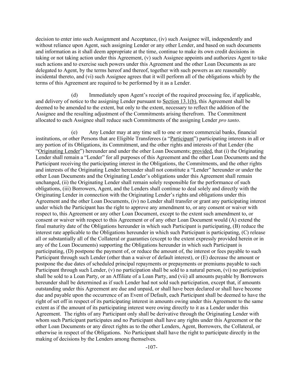 -107- decision to enter into such Assignment and Acceptance, (iv) such Assignee will, independently and without reliance upon Agent, such assigning Lender or any other Lender, and based on such documents and information as it shall deem appropriate at the time, continue to make its own credit decisions in taking or not taking action under this Agreement, (v) such Assignee appoints and authorizes Agent to take such actions and to exercise such powers under this Agreement and the other Loan Documents as are delegated to Agent, by the terms hereof and thereof, together with such powers as are reasonably incidental thereto, and (vi) such Assignee agrees that it will perform all of the obligations which by the terms of this Agreement are required to be performed by it as a Lender. (d) Immediately upon Agent’s receipt of the required processing fee, if applicable, and delivery of notice to the assigning Lender pursuant to Section 13.1(b), this Agreement shall be deemed to be amended to the extent, but only to the extent, necessary to reflect the addition of the Assignee and the resulting adjustment of the Commitments arising therefrom. The Commitment allocated to each Assignee shall reduce such Commitments of the assigning Lender pro tanto. (e) Any Lender may at any time sell to one or more commercial banks, financial institutions, or other Persons that are Eligible Transferees (a “Participant”) participating interests in all or any portion of its Obligations, its Commitment, and the other rights and interests of that Lender (the “Originating Lender”) hereunder and under the other Loan Documents; provided, that (i) the Originating Lender shall remain a “Lender” for all purposes of this Agreement and the other Loan Documents and the Participant receiving the participating interest in the Obligations, the Commitments, and the other rights and interests of the Originating Lender hereunder shall not constitute a “Lender” hereunder or under the other Loan Documents and the Originating Lender’s obligations under this Agreement shall remain unchanged, (ii) the Originating Lender shall remain solely responsible for the performance of such obligations, (iii) Borrowers, Agent, and the Lenders shall continue to deal solely and directly with the Originating Lender in connection with the Originating Lender’s rights and obligations under this Agreement and the other Loan Documents, (iv) no Lender shall transfer or grant any participating interest under which the Participant has the right to approve any amendment to, or any consent or waiver with respect to, this Agreement or any other Loan Document, except to the extent such amendment to, or consent or waiver with respect to this Agreement or of any other Loan Document would (A) extend the final maturity date of the Obligations hereunder in which such Participant is participating, (B) reduce the interest rate applicable to the Obligations hereunder in which such Participant is participating, (C) release all or substantially all of the Collateral or guaranties (except to the extent expressly provided herein or in any of the Loan Documents) supporting the Obligations hereunder in which such Participant is participating, (D) postpone the payment of, or reduce the amount of, the interest or fees payable to such Participant through such Lender (other than a waiver of default interest), or (E) decrease the amount or postpone the due dates of scheduled principal repayments or prepayments or premiums payable to such Participant through such Lender, (v) no participation shall be sold to a natural person, (vi) no participation shall be sold to a Loan Party, or an Affiliate of a Loan Party, and (vii) all amounts payable by Borrowers hereunder shall be determined as if such Lender had not sold such participation, except that, if amounts outstanding under this Agreement are due and unpaid, or shall have been declared or shall have become due and payable upon the occurrence of an Event of Default, each Participant shall be deemed to have the right of set off in respect of its participating interest in amounts owing under this Agreement to the same extent as if the amount of its participating interest were owing directly to it as a Lender under this Agreement. The rights of any Participant only shall be derivative through the Originating Lender with whom such Participant participates and no Participant shall have any rights under this Agreement or the other Loan Documents or any direct rights as to the other Lenders, Agent, Borrowers, the Collateral, or otherwise in respect of the Obligations. No Participant shall have the right to participate directly in the making of decisions by the Lenders among themselves.