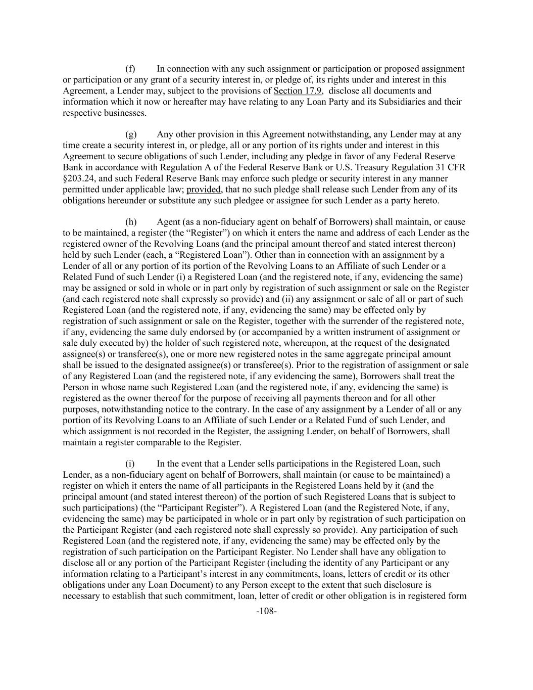 -108- (f) In connection with any such assignment or participation or proposed assignment or participation or any grant of a security interest in, or pledge of, its rights under and interest in this Agreement, a Lender may, subject to the provisions of Section 17.9, disclose all documents and information which it now or hereafter may have relating to any Loan Party and its Subsidiaries and their respective businesses. (g) Any other provision in this Agreement notwithstanding, any Lender may at any time create a security interest in, or pledge, all or any portion of its rights under and interest in this Agreement to secure obligations of such Lender, including any pledge in favor of any Federal Reserve Bank in accordance with Regulation A of the Federal Reserve Bank or U.S. Treasury Regulation 31 CFR §203.24, and such Federal Reserve Bank may enforce such pledge or security interest in any manner permitted under applicable law; provided, that no such pledge shall release such Lender from any of its obligations hereunder or substitute any such pledgee or assignee for such Lender as a party hereto. (h) Agent (as a non-fiduciary agent on behalf of Borrowers) shall maintain, or cause to be maintained, a register (the “Register”) on which it enters the name and address of each Lender as the registered owner of the Revolving Loans (and the principal amount thereof and stated interest thereon) held by such Lender (each, a “Registered Loan”). Other than in connection with an assignment by a Lender of all or any portion of its portion of the Revolving Loans to an Affiliate of such Lender or a Related Fund of such Lender (i) a Registered Loan (and the registered note, if any, evidencing the same) may be assigned or sold in whole or in part only by registration of such assignment or sale on the Register (and each registered note shall expressly so provide) and (ii) any assignment or sale of all or part of such Registered Loan (and the registered note, if any, evidencing the same) may be effected only by registration of such assignment or sale on the Register, together with the surrender of the registered note, if any, evidencing the same duly endorsed by (or accompanied by a written instrument of assignment or sale duly executed by) the holder of such registered note, whereupon, at the request of the designated assignee(s) or transferee(s), one or more new registered notes in the same aggregate principal amount shall be issued to the designated assignee(s) or transferee(s). Prior to the registration of assignment or sale of any Registered Loan (and the registered note, if any evidencing the same), Borrowers shall treat the Person in whose name such Registered Loan (and the registered note, if any, evidencing the same) is registered as the owner thereof for the purpose of receiving all payments thereon and for all other purposes, notwithstanding notice to the contrary. In the case of any assignment by a Lender of all or any portion of its Revolving Loans to an Affiliate of such Lender or a Related Fund of such Lender, and which assignment is not recorded in the Register, the assigning Lender, on behalf of Borrowers, shall maintain a register comparable to the Register. (i) In the event that a Lender sells participations in the Registered Loan, such Lender, as a non-fiduciary agent on behalf of Borrowers, shall maintain (or cause to be maintained) a register on which it enters the name of all participants in the Registered Loans held by it (and the principal amount (and stated interest thereon) of the portion of such Registered Loans that is subject to such participations) (the “Participant Register”). A Registered Loan (and the Registered Note, if any, evidencing the same) may be participated in whole or in part only by registration of such participation on the Participant Register (and each registered note shall expressly so provide). Any participation of such Registered Loan (and the registered note, if any, evidencing the same) may be effected only by the registration of such participation on the Participant Register. No Lender shall have any obligation to disclose all or any portion of the Participant Register (including the identity of any Participant or any information relating to a Participant’s interest in any commitments, loans, letters of credit or its other obligations under any Loan Document) to any Person except to the extent that such disclosure is necessary to establish that such commitment, loan, letter of credit or other obligation is in registered form