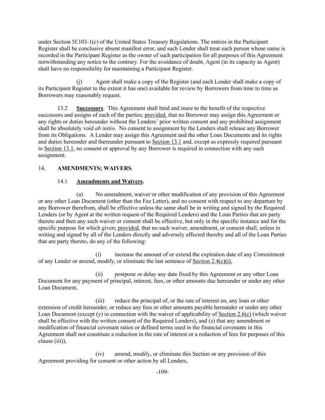 -109- under Section 5f.103-1(c) of the United States Treasury Regulations. The entries in the Participant Register shall be conclusive absent manifest error, and such Lender shall treat each person whose name is recorded in the Participant Register as the owner of such participation for all purposes of this Agreement notwithstanding any notice to the contrary. For the avoidance of doubt, Agent (in its capacity as Agent) shall have no responsibility for maintaining a Participant Register. (j) Agent shall make a copy of the Register (and each Lender shall make a copy of its Participant Register to the extent it has one) available for review by Borrowers from time to time as Borrowers may reasonably request. 13.2 Successors. This Agreement shall bind and inure to the benefit of the respective successors and assigns of each of the parties; provided, that no Borrower may assign this Agreement or any rights or duties hereunder without the Lenders’ prior written consent and any prohibited assignment shall be absolutely void ab initio. No consent to assignment by the Lenders shall release any Borrower from its Obligations. A Lender may assign this Agreement and the other Loan Documents and its rights and duties hereunder and thereunder pursuant to Section 13.1 and, except as expressly required pursuant to Section 13.1, no consent or approval by any Borrower is required in connection with any such assignment. 14. AMENDMENTS; WAIVERS. 14.1 Amendments and Waivers. (a) No amendment, waiver or other modification of any provision of this Agreement or any other Loan Document (other than the Fee Letter), and no consent with respect to any departure by any Borrower therefrom, shall be effective unless the same shall be in writing and signed by the Required Lenders (or by Agent at the written request of the Required Lenders) and the Loan Parties that are party thereto and then any such waiver or consent shall be effective, but only in the specific instance and for the specific purpose for which given; provided, that no such waiver, amendment, or consent shall, unless in writing and signed by all of the Lenders directly and adversely affected thereby and all of the Loan Parties that are party thereto, do any of the following: (i) increase the amount of or extend the expiration date of any Commitment of any Lender or amend, modify, or eliminate the last sentence of Section 2.4(c)(i), (ii) postpone or delay any date fixed by this Agreement or any other Loan Document for any payment of principal, interest, fees, or other amounts due hereunder or under any other Loan Document, (iii) reduce the principal of, or the rate of interest on, any loan or other extension of credit hereunder, or reduce any fees or other amounts payable hereunder or under any other Loan Document (except (y) in connection with the waiver of applicability of Section 2.6(c) (which waiver shall be effective with the written consent of the Required Lenders), and (z) that any amendment or modification of financial covenant ratios or defined terms used in the financial covenants in this Agreement shall not constitute a reduction in the rate of interest or a reduction of fees for purposes of this clause (iii)), (iv) amend, modify, or eliminate this Section or any provision of this Agreement providing for consent or other action by all Lenders,