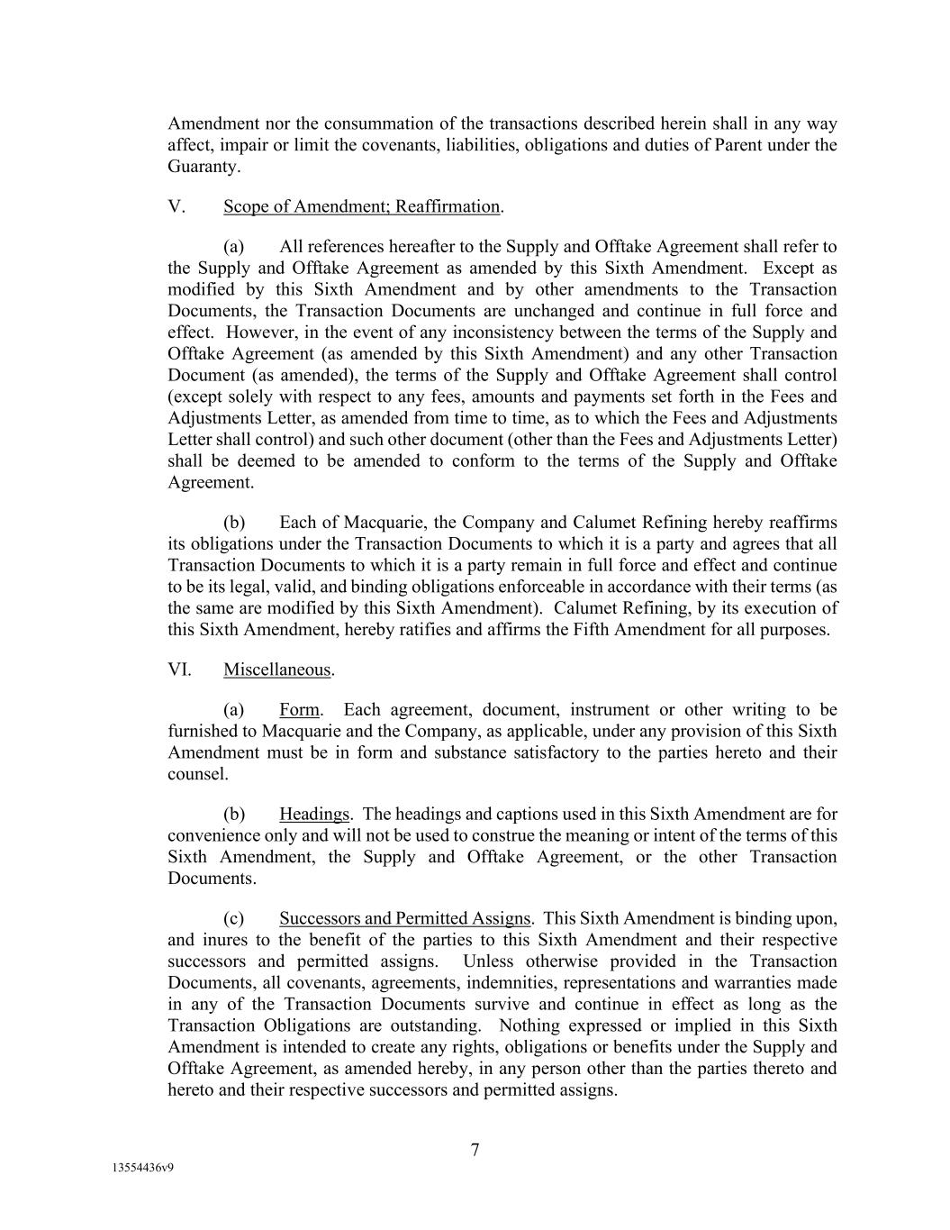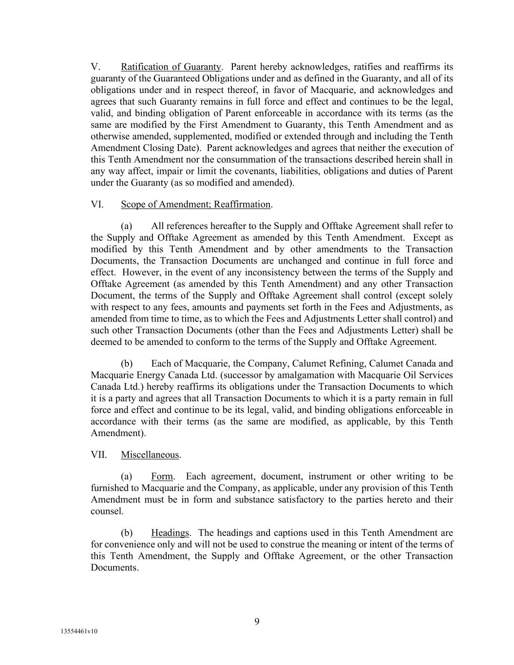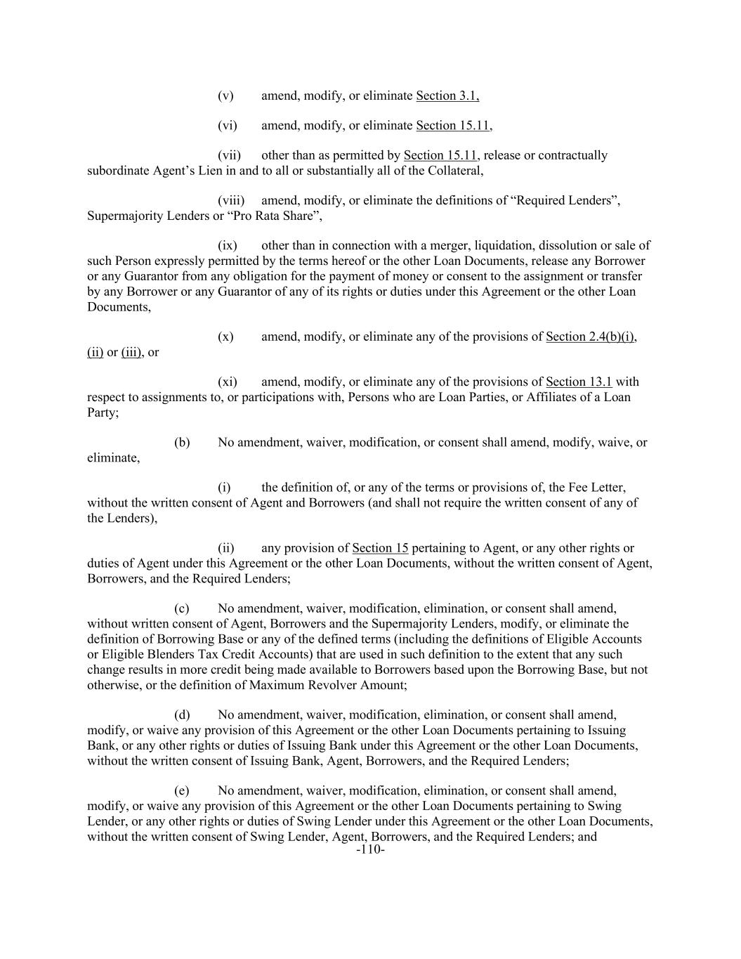 -110- (v) amend, modify, or eliminate Section 3.1, (vi) amend, modify, or eliminate Section 15.11, (vii) other than as permitted by Section 15.11, release or contractually subordinate Agent’s Lien in and to all or substantially all of the Collateral, (viii) amend, modify, or eliminate the definitions of “Required Lenders”, Supermajority Lenders or “Pro Rata Share”, (ix) other than in connection with a merger, liquidation, dissolution or sale of such Person expressly permitted by the terms hereof or the other Loan Documents, release any Borrower or any Guarantor from any obligation for the payment of money or consent to the assignment or transfer by any Borrower or any Guarantor of any of its rights or duties under this Agreement or the other Loan Documents, (x) amend, modify, or eliminate any of the provisions of Section 2.4(b)(i), (ii) or (iii), or (xi) amend, modify, or eliminate any of the provisions of Section 13.1 with respect to assignments to, or participations with, Persons who are Loan Parties, or Affiliates of a Loan Party; (b) No amendment, waiver, modification, or consent shall amend, modify, waive, or eliminate, (i) the definition of, or any of the terms or provisions of, the Fee Letter, without the written consent of Agent and Borrowers (and shall not require the written consent of any of the Lenders), (ii) any provision of Section 15 pertaining to Agent, or any other rights or duties of Agent under this Agreement or the other Loan Documents, without the written consent of Agent, Borrowers, and the Required Lenders; (c) No amendment, waiver, modification, elimination, or consent shall amend, without written consent of Agent, Borrowers and the Supermajority Lenders, modify, or eliminate the definition of Borrowing Base or any of the defined terms (including the definitions of Eligible Accounts or Eligible Blenders Tax Credit Accounts) that are used in such definition to the extent that any such change results in more credit being made available to Borrowers based upon the Borrowing Base, but not otherwise, or the definition of Maximum Revolver Amount; (d) No amendment, waiver, modification, elimination, or consent shall amend, modify, or waive any provision of this Agreement or the other Loan Documents pertaining to Issuing Bank, or any other rights or duties of Issuing Bank under this Agreement or the other Loan Documents, without the written consent of Issuing Bank, Agent, Borrowers, and the Required Lenders; (e) No amendment, waiver, modification, elimination, or consent shall amend, modify, or waive any provision of this Agreement or the other Loan Documents pertaining to Swing Lender, or any other rights or duties of Swing Lender under this Agreement or the other Loan Documents, without the written consent of Swing Lender, Agent, Borrowers, and the Required Lenders; and