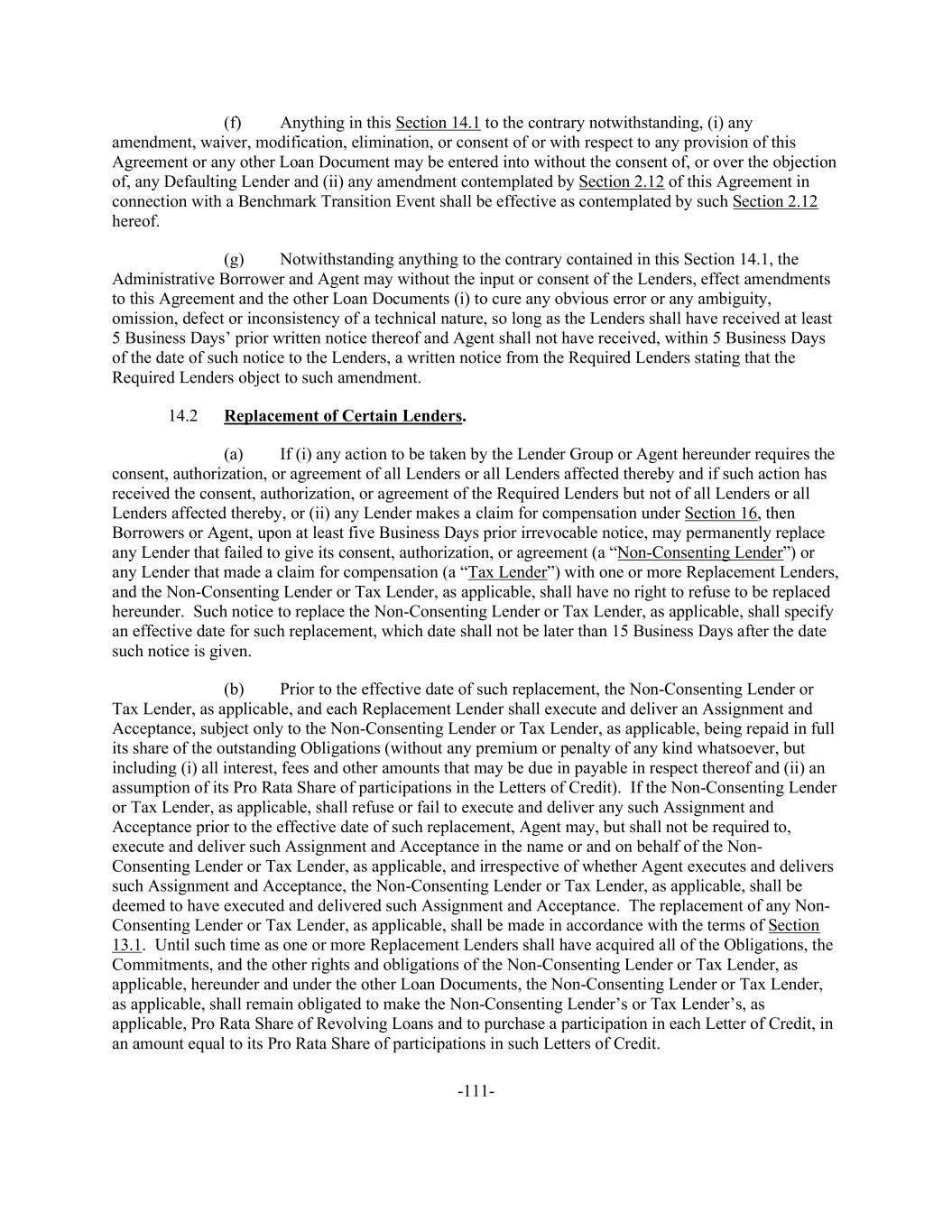 -111- (f) Anything in this Section 14.1 to the contrary notwithstanding, (i) any amendment, waiver, modification, elimination, or consent of or with respect to any provision of this Agreement or any other Loan Document may be entered into without the consent of, or over the objection of, any Defaulting Lender and (ii) any amendment contemplated by Section 2.12 of this Agreement in connection with a Benchmark Transition Event shall be effective as contemplated by such Section 2.12 hereof. (g) Notwithstanding anything to the contrary contained in this Section 14.1, the Administrative Borrower and Agent may without the input or consent of the Lenders, effect amendments to this Agreement and the other Loan Documents (i) to cure any obvious error or any ambiguity, omission, defect or inconsistency of a technical nature, so long as the Lenders shall have received at least 5 Business Days’ prior written notice thereof and Agent shall not have received, within 5 Business Days of the date of such notice to the Lenders, a written notice from the Required Lenders stating that the Required Lenders object to such amendment. 14.2 Replacement of Certain Lenders. (a) If (i) any action to be taken by the Lender Group or Agent hereunder requires the consent, authorization, or agreement of all Lenders or all Lenders affected thereby and if such action has received the consent, authorization, or agreement of the Required Lenders but not of all Lenders or all Lenders affected thereby, or (ii) any Lender makes a claim for compensation under Section 16, then Borrowers or Agent, upon at least five Business Days prior irrevocable notice, may permanently replace any Lender that failed to give its consent, authorization, or agreement (a “Non-Consenting Lender”) or any Lender that made a claim for compensation (a “Tax Lender”) with one or more Replacement Lenders, and the Non-Consenting Lender or Tax Lender, as applicable, shall have no right to refuse to be replaced hereunder. Such notice to replace the Non-Consenting Lender or Tax Lender, as applicable, shall specify an effective date for such replacement, which date shall not be later than 15 Business Days after the date such notice is given. (b) Prior to the effective date of such replacement, the Non-Consenting Lender or Tax Lender, as applicable, and each Replacement Lender shall execute and deliver an Assignment and Acceptance, subject only to the Non-Consenting Lender or Tax Lender, as applicable, being repaid in full its share of the outstanding Obligations (without any premium or penalty of any kind whatsoever, but including (i) all interest, fees and other amounts that may be due in payable in respect thereof and (ii) an assumption of its Pro Rata Share of participations in the Letters of Credit). If the Non-Consenting Lender or Tax Lender, as applicable, shall refuse or fail to execute and deliver any such Assignment and Acceptance prior to the effective date of such replacement, Agent may, but shall not be required to, execute and deliver such Assignment and Acceptance in the name or and on behalf of the Non- Consenting Lender or Tax Lender, as applicable, and irrespective of whether Agent executes and delivers such Assignment and Acceptance, the Non-Consenting Lender or Tax Lender, as applicable, shall be deemed to have executed and delivered such Assignment and Acceptance. The replacement of any Non- Consenting Lender or Tax Lender, as applicable, shall be made in accordance with the terms of Section 13.1. Until such time as one or more Replacement Lenders shall have acquired all of the Obligations, the Commitments, and the other rights and obligations of the Non-Consenting Lender or Tax Lender, as applicable, hereunder and under the other Loan Documents, the Non-Consenting Lender or Tax Lender, as applicable, shall remain obligated to make the Non-Consenting Lender’s or Tax Lender’s, as applicable, Pro Rata Share of Revolving Loans and to purchase a participation in each Letter of Credit, in an amount equal to its Pro Rata Share of participations in such Letters of Credit.