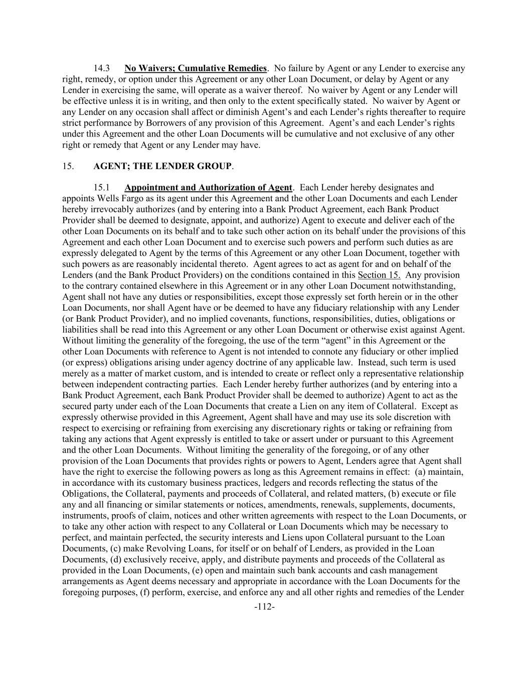 -112- 14.3 No Waivers; Cumulative Remedies. No failure by Agent or any Lender to exercise any right, remedy, or option under this Agreement or any other Loan Document, or delay by Agent or any Lender in exercising the same, will operate as a waiver thereof. No waiver by Agent or any Lender will be effective unless it is in writing, and then only to the extent specifically stated. No waiver by Agent or any Lender on any occasion shall affect or diminish Agent’s and each Lender’s rights thereafter to require strict performance by Borrowers of any provision of this Agreement. Agent’s and each Lender’s rights under this Agreement and the other Loan Documents will be cumulative and not exclusive of any other right or remedy that Agent or any Lender may have. 15. AGENT; THE LENDER GROUP. 15.1 Appointment and Authorization of Agent. Each Lender hereby designates and appoints Wells Fargo as its agent under this Agreement and the other Loan Documents and each Lender hereby irrevocably authorizes (and by entering into a Bank Product Agreement, each Bank Product Provider shall be deemed to designate, appoint, and authorize) Agent to execute and deliver each of the other Loan Documents on its behalf and to take such other action on its behalf under the provisions of this Agreement and each other Loan Document and to exercise such powers and perform such duties as are expressly delegated to Agent by the terms of this Agreement or any other Loan Document, together with such powers as are reasonably incidental thereto. Agent agrees to act as agent for and on behalf of the Lenders (and the Bank Product Providers) on the conditions contained in this Section 15. Any provision to the contrary contained elsewhere in this Agreement or in any other Loan Document notwithstanding, Agent shall not have any duties or responsibilities, except those expressly set forth herein or in the other Loan Documents, nor shall Agent have or be deemed to have any fiduciary relationship with any Lender (or Bank Product Provider), and no implied covenants, functions, responsibilities, duties, obligations or liabilities shall be read into this Agreement or any other Loan Document or otherwise exist against Agent. Without limiting the generality of the foregoing, the use of the term “agent” in this Agreement or the other Loan Documents with reference to Agent is not intended to connote any fiduciary or other implied (or express) obligations arising under agency doctrine of any applicable law. Instead, such term is used merely as a matter of market custom, and is intended to create or reflect only a representative relationship between independent contracting parties. Each Lender hereby further authorizes (and by entering into a Bank Product Agreement, each Bank Product Provider shall be deemed to authorize) Agent to act as the secured party under each of the Loan Documents that create a Lien on any item of Collateral. Except as expressly otherwise provided in this Agreement, Agent shall have and may use its sole discretion with respect to exercising or refraining from exercising any discretionary rights or taking or refraining from taking any actions that Agent expressly is entitled to take or assert under or pursuant to this Agreement and the other Loan Documents. Without limiting the generality of the foregoing, or of any other provision of the Loan Documents that provides rights or powers to Agent, Lenders agree that Agent shall have the right to exercise the following powers as long as this Agreement remains in effect: (a) maintain, in accordance with its customary business practices, ledgers and records reflecting the status of the Obligations, the Collateral, payments and proceeds of Collateral, and related matters, (b) execute or file any and all financing or similar statements or notices, amendments, renewals, supplements, documents, instruments, proofs of claim, notices and other written agreements with respect to the Loan Documents, or to take any other action with respect to any Collateral or Loan Documents which may be necessary to perfect, and maintain perfected, the security interests and Liens upon Collateral pursuant to the Loan Documents, (c) make Revolving Loans, for itself or on behalf of Lenders, as provided in the Loan Documents, (d) exclusively receive, apply, and distribute payments and proceeds of the Collateral as provided in the Loan Documents, (e) open and maintain such bank accounts and cash management arrangements as Agent deems necessary and appropriate in accordance with the Loan Documents for the foregoing purposes, (f) perform, exercise, and enforce any and all other rights and remedies of the Lender
