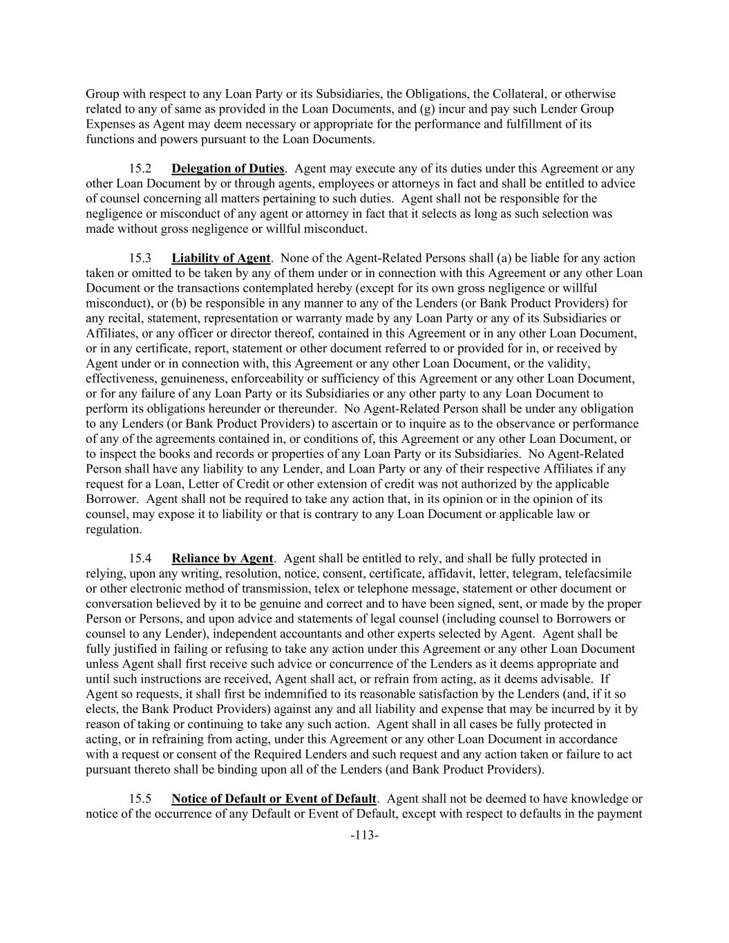 -113- Group with respect to any Loan Party or its Subsidiaries, the Obligations, the Collateral, or otherwise related to any of same as provided in the Loan Documents, and (g) incur and pay such Lender Group Expenses as Agent may deem necessary or appropriate for the performance and fulfillment of its functions and powers pursuant to the Loan Documents. 15.2 Delegation of Duties. Agent may execute any of its duties under this Agreement or any other Loan Document by or through agents, employees or attorneys in fact and shall be entitled to advice of counsel concerning all matters pertaining to such duties. Agent shall not be responsible for the negligence or misconduct of any agent or attorney in fact that it selects as long as such selection was made without gross negligence or willful misconduct. 15.3 Liability of Agent. None of the Agent-Related Persons shall (a) be liable for any action taken or omitted to be taken by any of them under or in connection with this Agreement or any other Loan Document or the transactions contemplated hereby (except for its own gross negligence or willful misconduct), or (b) be responsible in any manner to any of the Lenders (or Bank Product Providers) for any recital, statement, representation or warranty made by any Loan Party or any of its Subsidiaries or Affiliates, or any officer or director thereof, contained in this Agreement or in any other Loan Document, or in any certificate, report, statement or other document referred to or provided for in, or received by Agent under or in connection with, this Agreement or any other Loan Document, or the validity, effectiveness, genuineness, enforceability or sufficiency of this Agreement or any other Loan Document, or for any failure of any Loan Party or its Subsidiaries or any other party to any Loan Document to perform its obligations hereunder or thereunder. No Agent-Related Person shall be under any obligation to any Lenders (or Bank Product Providers) to ascertain or to inquire as to the observance or performance of any of the agreements contained in, or conditions of, this Agreement or any other Loan Document, or to inspect the books and records or properties of any Loan Party or its Subsidiaries. No Agent-Related Person shall have any liability to any Lender, and Loan Party or any of their respective Affiliates if any request for a Loan, Letter of Credit or other extension of credit was not authorized by the applicable Borrower. Agent shall not be required to take any action that, in its opinion or in the opinion of its counsel, may expose it to liability or that is contrary to any Loan Document or applicable law or regulation. 15.4 Reliance by Agent. Agent shall be entitled to rely, and shall be fully protected in relying, upon any writing, resolution, notice, consent, certificate, affidavit, letter, telegram, telefacsimile or other electronic method of transmission, telex or telephone message, statement or other document or conversation believed by it to be genuine and correct and to have been signed, sent, or made by the proper Person or Persons, and upon advice and statements of legal counsel (including counsel to Borrowers or counsel to any Lender), independent accountants and other experts selected by Agent. Agent shall be fully justified in failing or refusing to take any action under this Agreement or any other Loan Document unless Agent shall first receive such advice or concurrence of the Lenders as it deems appropriate and until such instructions are received, Agent shall act, or refrain from acting, as it deems advisable. If Agent so requests, it shall first be indemnified to its reasonable satisfaction by the Lenders (and, if it so elects, the Bank Product Providers) against any and all liability and expense that may be incurred by it by reason of taking or continuing to take any such action. Agent shall in all cases be fully protected in acting, or in refraining from acting, under this Agreement or any other Loan Document in accordance with a request or consent of the Required Lenders and such request and any action taken or failure to act pursuant thereto shall be binding upon all of the Lenders (and Bank Product Providers). 15.5 Notice of Default or Event of Default. Agent shall not be deemed to have knowledge or notice of the occurrence of any Default or Event of Default, except with respect to defaults in the payment
