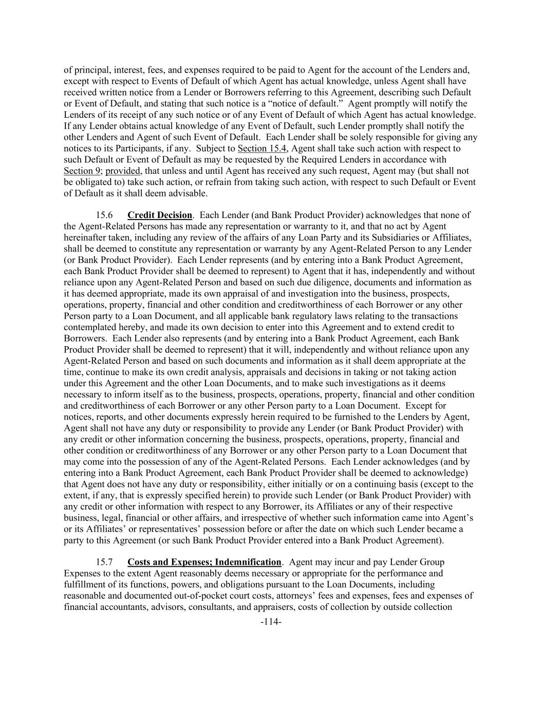 -114- of principal, interest, fees, and expenses required to be paid to Agent for the account of the Lenders and, except with respect to Events of Default of which Agent has actual knowledge, unless Agent shall have received written notice from a Lender or Borrowers referring to this Agreement, describing such Default or Event of Default, and stating that such notice is a “notice of default.” Agent promptly will notify the Lenders of its receipt of any such notice or of any Event of Default of which Agent has actual knowledge. If any Lender obtains actual knowledge of any Event of Default, such Lender promptly shall notify the other Lenders and Agent of such Event of Default. Each Lender shall be solely responsible for giving any notices to its Participants, if any. Subject to Section 15.4, Agent shall take such action with respect to such Default or Event of Default as may be requested by the Required Lenders in accordance with Section 9; provided, that unless and until Agent has received any such request, Agent may (but shall not be obligated to) take such action, or refrain from taking such action, with respect to such Default or Event of Default as it shall deem advisable. 15.6 Credit Decision. Each Lender (and Bank Product Provider) acknowledges that none of the Agent-Related Persons has made any representation or warranty to it, and that no act by Agent hereinafter taken, including any review of the affairs of any Loan Party and its Subsidiaries or Affiliates, shall be deemed to constitute any representation or warranty by any Agent-Related Person to any Lender (or Bank Product Provider). Each Lender represents (and by entering into a Bank Product Agreement, each Bank Product Provider shall be deemed to represent) to Agent that it has, independently and without reliance upon any Agent-Related Person and based on such due diligence, documents and information as it has deemed appropriate, made its own appraisal of and investigation into the business, prospects, operations, property, financial and other condition and creditworthiness of each Borrower or any other Person party to a Loan Document, and all applicable bank regulatory laws relating to the transactions contemplated hereby, and made its own decision to enter into this Agreement and to extend credit to Borrowers. Each Lender also represents (and by entering into a Bank Product Agreement, each Bank Product Provider shall be deemed to represent) that it will, independently and without reliance upon any Agent-Related Person and based on such documents and information as it shall deem appropriate at the time, continue to make its own credit analysis, appraisals and decisions in taking or not taking action under this Agreement and the other Loan Documents, and to make such investigations as it deems necessary to inform itself as to the business, prospects, operations, property, financial and other condition and creditworthiness of each Borrower or any other Person party to a Loan Document. Except for notices, reports, and other documents expressly herein required to be furnished to the Lenders by Agent, Agent shall not have any duty or responsibility to provide any Lender (or Bank Product Provider) with any credit or other information concerning the business, prospects, operations, property, financial and other condition or creditworthiness of any Borrower or any other Person party to a Loan Document that may come into the possession of any of the Agent-Related Persons. Each Lender acknowledges (and by entering into a Bank Product Agreement, each Bank Product Provider shall be deemed to acknowledge) that Agent does not have any duty or responsibility, either initially or on a continuing basis (except to the extent, if any, that is expressly specified herein) to provide such Lender (or Bank Product Provider) with any credit or other information with respect to any Borrower, its Affiliates or any of their respective business, legal, financial or other affairs, and irrespective of whether such information came into Agent’s or its Affiliates’ or representatives’ possession before or after the date on which such Lender became a party to this Agreement (or such Bank Product Provider entered into a Bank Product Agreement). 15.7 Costs and Expenses; Indemnification. Agent may incur and pay Lender Group Expenses to the extent Agent reasonably deems necessary or appropriate for the performance and fulfillment of its functions, powers, and obligations pursuant to the Loan Documents, including reasonable and documented out-of-pocket court costs, attorneys’ fees and expenses, fees and expenses of financial accountants, advisors, consultants, and appraisers, costs of collection by outside collection