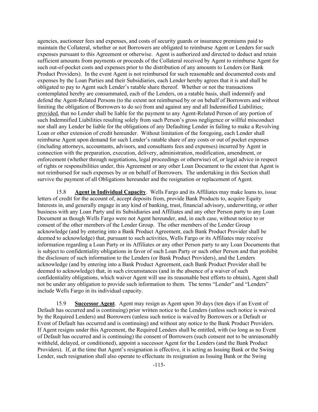 -115- agencies, auctioneer fees and expenses, and costs of security guards or insurance premiums paid to maintain the Collateral, whether or not Borrowers are obligated to reimburse Agent or Lenders for such expenses pursuant to this Agreement or otherwise. Agent is authorized and directed to deduct and retain sufficient amounts from payments or proceeds of the Collateral received by Agent to reimburse Agent for such out-of-pocket costs and expenses prior to the distribution of any amounts to Lenders (or Bank Product Providers). In the event Agent is not reimbursed for such reasonable and documented costs and expenses by the Loan Parties and their Subsidiaries, each Lender hereby agrees that it is and shall be obligated to pay to Agent such Lender’s ratable share thereof. Whether or not the transactions contemplated hereby are consummated, each of the Lenders, on a ratable basis, shall indemnify and defend the Agent-Related Persons (to the extent not reimbursed by or on behalf of Borrowers and without limiting the obligation of Borrowers to do so) from and against any and all Indemnified Liabilities; provided, that no Lender shall be liable for the payment to any Agent-Related Person of any portion of such Indemnified Liabilities resulting solely from such Person’s gross negligence or willful misconduct nor shall any Lender be liable for the obligations of any Defaulting Lender in failing to make a Revolving Loan or other extension of credit hereunder. Without limitation of the foregoing, each Lender shall reimburse Agent upon demand for such Lender’s ratable share of any costs or out of pocket expenses (including attorneys, accountants, advisors, and consultants fees and expenses) incurred by Agent in connection with the preparation, execution, delivery, administration, modification, amendment, or enforcement (whether through negotiations, legal proceedings or otherwise) of, or legal advice in respect of rights or responsibilities under, this Agreement or any other Loan Document to the extent that Agent is not reimbursed for such expenses by or on behalf of Borrowers. The undertaking in this Section shall survive the payment of all Obligations hereunder and the resignation or replacement of Agent. 15.8 Agent in Individual Capacity. Wells Fargo and its Affiliates may make loans to, issue letters of credit for the account of, accept deposits from, provide Bank Products to, acquire Equity Interests in, and generally engage in any kind of banking, trust, financial advisory, underwriting, or other business with any Loan Party and its Subsidiaries and Affiliates and any other Person party to any Loan Document as though Wells Fargo were not Agent hereunder, and, in each case, without notice to or consent of the other members of the Lender Group. The other members of the Lender Group acknowledge (and by entering into a Bank Product Agreement, each Bank Product Provider shall be deemed to acknowledge) that, pursuant to such activities, Wells Fargo or its Affiliates may receive information regarding a Loan Party or its Affiliates or any other Person party to any Loan Documents that is subject to confidentiality obligations in favor of such Loan Party or such other Person and that prohibit the disclosure of such information to the Lenders (or Bank Product Providers), and the Lenders acknowledge (and by entering into a Bank Product Agreement, each Bank Product Provider shall be deemed to acknowledge) that, in such circumstances (and in the absence of a waiver of such confidentiality obligations, which waiver Agent will use its reasonable best efforts to obtain), Agent shall not be under any obligation to provide such information to them. The terms “Lender” and “Lenders” include Wells Fargo in its individual capacity. 15.9 Successor Agent. Agent may resign as Agent upon 30 days (ten days if an Event of Default has occurred and is continuing) prior written notice to the Lenders (unless such notice is waived by the Required Lenders) and Borrowers (unless such notice is waived by Borrowers or a Default or Event of Default has occurred and is continuing) and without any notice to the Bank Product Providers. If Agent resigns under this Agreement, the Required Lenders shall be entitled, with (so long as no Event of Default has occurred and is continuing) the consent of Borrowers (such consent not to be unreasonably withheld, delayed, or conditioned), appoint a successor Agent for the Lenders (and the Bank Product Providers). If, at the time that Agent’s resignation is effective, it is acting as Issuing Bank or the Swing Lender, such resignation shall also operate to effectuate its resignation as Issuing Bank or the Swing