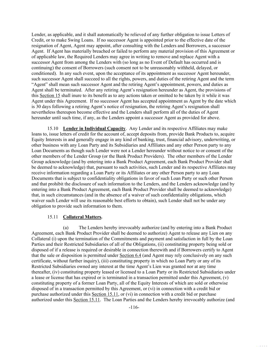 -116- Lender, as applicable, and it shall automatically be relieved of any further obligation to issue Letters of Credit, or to make Swing Loans. If no successor Agent is appointed prior to the effective date of the resignation of Agent, Agent may appoint, after consulting with the Lenders and Borrowers, a successor Agent. If Agent has materially breached or failed to perform any material provision of this Agreement or of applicable law, the Required Lenders may agree in writing to remove and replace Agent with a successor Agent from among the Lenders with (so long as no Event of Default has occurred and is continuing) the consent of Borrowers (such consent not to be unreasonably withheld, delayed, or conditioned). In any such event, upon the acceptance of its appointment as successor Agent hereunder, such successor Agent shall succeed to all the rights, powers, and duties of the retiring Agent and the term “Agent” shall mean such successor Agent and the retiring Agent’s appointment, powers, and duties as Agent shall be terminated. After any retiring Agent’s resignation hereunder as Agent, the provisions of this Section 15 shall inure to its benefit as to any actions taken or omitted to be taken by it while it was Agent under this Agreement. If no successor Agent has accepted appointment as Agent by the date which is 30 days following a retiring Agent’s notice of resignation, the retiring Agent’s resignation shall nevertheless thereupon become effective and the Lenders shall perform all of the duties of Agent hereunder until such time, if any, as the Lenders appoint a successor Agent as provided for above. 15.10 Lender in Individual Capacity. Any Lender and its respective Affiliates may make loans to, issue letters of credit for the account of, accept deposits from, provide Bank Products to, acquire Equity Interests in and generally engage in any kind of banking, trust, financial advisory, underwriting, or other business with any Loan Party and its Subsidiaries and Affiliates and any other Person party to any Loan Documents as though such Lender were not a Lender hereunder without notice to or consent of the other members of the Lender Group (or the Bank Product Providers). The other members of the Lender Group acknowledge (and by entering into a Bank Product Agreement, each Bank Product Provider shall be deemed to acknowledge) that, pursuant to such activities, such Lender and its respective Affiliates may receive information regarding a Loan Party or its Affiliates or any other Person party to any Loan Documents that is subject to confidentiality obligations in favor of such Loan Party or such other Person and that prohibit the disclosure of such information to the Lenders, and the Lenders acknowledge (and by entering into a Bank Product Agreement, each Bank Product Provider shall be deemed to acknowledge) that, in such circumstances (and in the absence of a waiver of such confidentiality obligations, which waiver such Lender will use its reasonable best efforts to obtain), such Lender shall not be under any obligation to provide such information to them. 15.11 Collateral Matters. (a) The Lenders hereby irrevocably authorize (and by entering into a Bank Product Agreement, each Bank Product Provider shall be deemed to authorize) Agent to release any Lien on any Collateral (i) upon the termination of the Commitments and payment and satisfaction in full by the Loan Parties and their Restricted Subsidiaries of all of the Obligations, (ii) constituting property being sold or disposed of if a release is required or desirable in connection therewith and if Borrowers certify to Agent that the sale or disposition is permitted under Section 6.4 (and Agent may rely conclusively on any such certificate, without further inquiry), (iii) constituting property in which no Loan Party or any of its Restricted Subsidiaries owned any interest at the time Agent’s Lien was granted nor at any time thereafter, (iv) constituting property leased or licensed to a Loan Party or its Restricted Subsidiaries under a lease or license that has expired or is terminated in a transaction permitted under this Agreement, (v) constituting property of a former Loan Party, all of the Equity Interests of which are sold or otherwise disposed of in a transaction permitted by this Agreement, or (vi) in connection with a credit bid or purchase authorized under this Section 15.11, or (vi) in connection with a credit bid or purchase authorized under this Section 15.11. The Loan Parties and the Lenders hereby irrevocably authorize (and