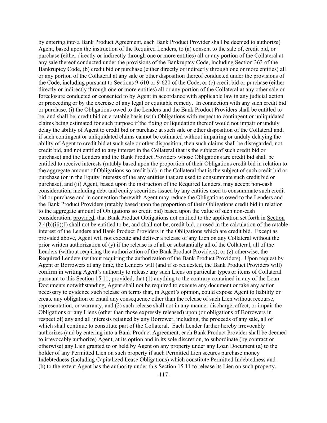 -117- by entering into a Bank Product Agreement, each Bank Product Provider shall be deemed to authorize) Agent, based upon the instruction of the Required Lenders, to (a) consent to the sale of, credit bid, or purchase (either directly or indirectly through one or more entities) all or any portion of the Collateral at any sale thereof conducted under the provisions of the Bankruptcy Code, including Section 363 of the Bankruptcy Code, (b) credit bid or purchase (either directly or indirectly through one or more entities) all or any portion of the Collateral at any sale or other disposition thereof conducted under the provisions of the Code, including pursuant to Sections 9-610 or 9-620 of the Code, or (c) credit bid or purchase (either directly or indirectly through one or more entities) all or any portion of the Collateral at any other sale or foreclosure conducted or consented to by Agent in accordance with applicable law in any judicial action or proceeding or by the exercise of any legal or equitable remedy. In connection with any such credit bid or purchase, (i) the Obligations owed to the Lenders and the Bank Product Providers shall be entitled to be, and shall be, credit bid on a ratable basis (with Obligations with respect to contingent or unliquidated claims being estimated for such purpose if the fixing or liquidation thereof would not impair or unduly delay the ability of Agent to credit bid or purchase at such sale or other disposition of the Collateral and, if such contingent or unliquidated claims cannot be estimated without impairing or unduly delaying the ability of Agent to credit bid at such sale or other disposition, then such claims shall be disregarded, not credit bid, and not entitled to any interest in the Collateral that is the subject of such credit bid or purchase) and the Lenders and the Bank Product Providers whose Obligations are credit bid shall be entitled to receive interests (ratably based upon the proportion of their Obligations credit bid in relation to the aggregate amount of Obligations so credit bid) in the Collateral that is the subject of such credit bid or purchase (or in the Equity Interests of the any entities that are used to consummate such credit bid or purchase), and (ii) Agent, based upon the instruction of the Required Lenders, may accept non-cash consideration, including debt and equity securities issued by any entities used to consummate such credit bid or purchase and in connection therewith Agent may reduce the Obligations owed to the Lenders and the Bank Product Providers (ratably based upon the proportion of their Obligations credit bid in relation to the aggregate amount of Obligations so credit bid) based upon the value of such non-cash consideration; provided, that Bank Product Obligations not entitled to the application set forth in Section 2.4(b)(iii)(J) shall not be entitled to be, and shall not be, credit bid, or used in the calculation of the ratable interest of the Lenders and Bank Product Providers in the Obligations which are credit bid. Except as provided above, Agent will not execute and deliver a release of any Lien on any Collateral without the prior written authorization of (y) if the release is of all or substantially all of the Collateral, all of the Lenders (without requiring the authorization of the Bank Product Providers), or (z) otherwise, the Required Lenders (without requiring the authorization of the Bank Product Providers). Upon request by Agent or Borrowers at any time, the Lenders will (and if so requested, the Bank Product Providers will) confirm in writing Agent’s authority to release any such Liens on particular types or items of Collateral pursuant to this Section 15.11; provided, that (1) anything to the contrary contained in any of the Loan Documents notwithstanding, Agent shall not be required to execute any document or take any action necessary to evidence such release on terms that, in Agent’s opinion, could expose Agent to liability or create any obligation or entail any consequence other than the release of such Lien without recourse, representation, or warranty, and (2) such release shall not in any manner discharge, affect, or impair the Obligations or any Liens (other than those expressly released) upon (or obligations of Borrowers in respect of) any and all interests retained by any Borrower, including, the proceeds of any sale, all of which shall continue to constitute part of the Collateral. Each Lender further hereby irrevocably authorizes (and by entering into a Bank Product Agreement, each Bank Product Provider shall be deemed to irrevocably authorize) Agent, at its option and in its sole discretion, to subordinate (by contract or otherwise) any Lien granted to or held by Agent on any property under any Loan Document (a) to the holder of any Permitted Lien on such property if such Permitted Lien secures purchase money Indebtedness (including Capitalized Lease Obligations) which constitute Permitted Indebtedness and (b) to the extent Agent has the authority under this Section 15.11 to release its Lien on such property.
