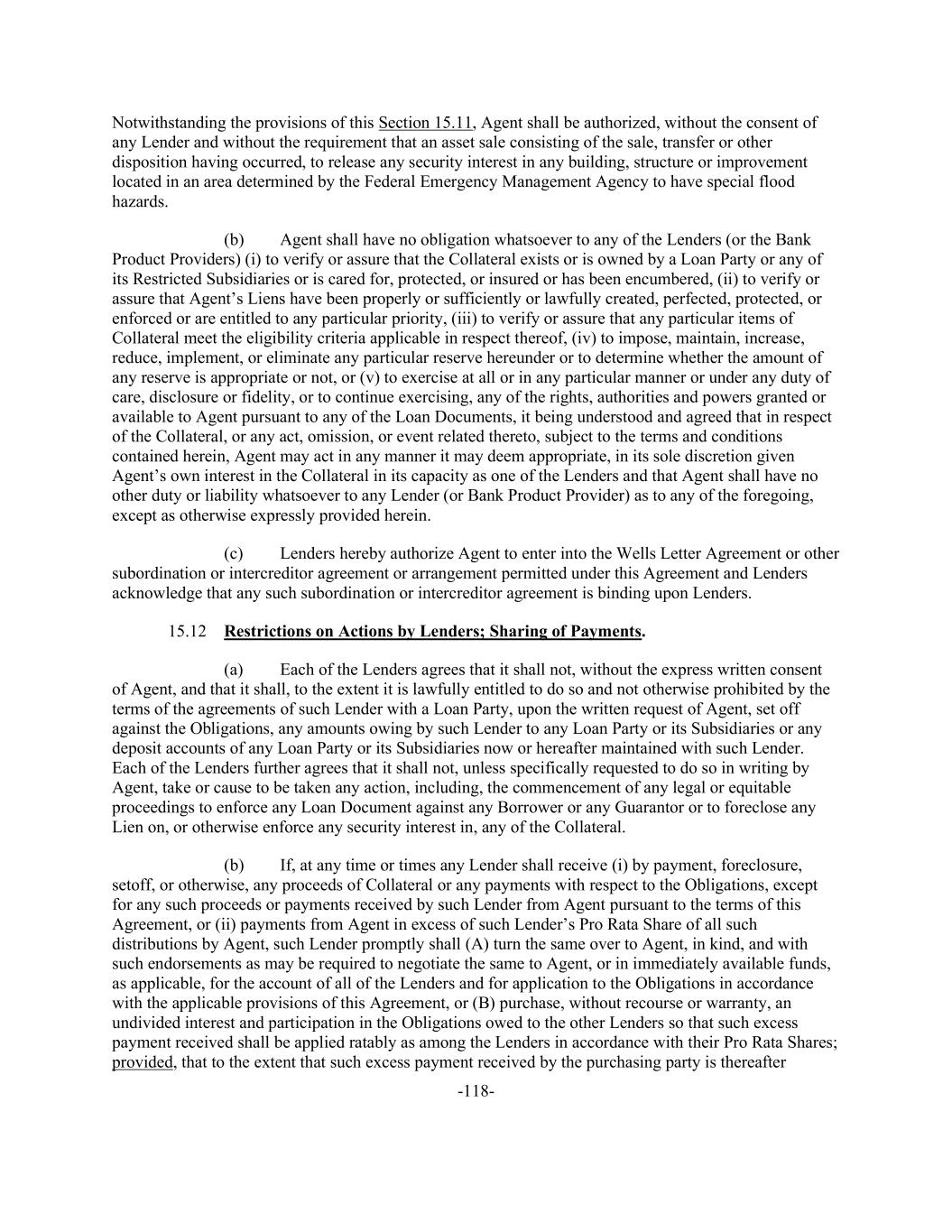 -118- Notwithstanding the provisions of this Section 15.11, Agent shall be authorized, without the consent of any Lender and without the requirement that an asset sale consisting of the sale, transfer or other disposition having occurred, to release any security interest in any building, structure or improvement located in an area determined by the Federal Emergency Management Agency to have special flood hazards. (b) Agent shall have no obligation whatsoever to any of the Lenders (or the Bank Product Providers) (i) to verify or assure that the Collateral exists or is owned by a Loan Party or any of its Restricted Subsidiaries or is cared for, protected, or insured or has been encumbered, (ii) to verify or assure that Agent’s Liens have been properly or sufficiently or lawfully created, perfected, protected, or enforced or are entitled to any particular priority, (iii) to verify or assure that any particular items of Collateral meet the eligibility criteria applicable in respect thereof, (iv) to impose, maintain, increase, reduce, implement, or eliminate any particular reserve hereunder or to determine whether the amount of any reserve is appropriate or not, or (v) to exercise at all or in any particular manner or under any duty of care, disclosure or fidelity, or to continue exercising, any of the rights, authorities and powers granted or available to Agent pursuant to any of the Loan Documents, it being understood and agreed that in respect of the Collateral, or any act, omission, or event related thereto, subject to the terms and conditions contained herein, Agent may act in any manner it may deem appropriate, in its sole discretion given Agent’s own interest in the Collateral in its capacity as one of the Lenders and that Agent shall have no other duty or liability whatsoever to any Lender (or Bank Product Provider) as to any of the foregoing, except as otherwise expressly provided herein. (c) Lenders hereby authorize Agent to enter into the Wells Letter Agreement or other subordination or intercreditor agreement or arrangement permitted under this Agreement and Lenders acknowledge that any such subordination or intercreditor agreement is binding upon Lenders. 15.12 Restrictions on Actions by Lenders; Sharing of Payments. (a) Each of the Lenders agrees that it shall not, without the express written consent of Agent, and that it shall, to the extent it is lawfully entitled to do so and not otherwise prohibited by the terms of the agreements of such Lender with a Loan Party, upon the written request of Agent, set off against the Obligations, any amounts owing by such Lender to any Loan Party or its Subsidiaries or any deposit accounts of any Loan Party or its Subsidiaries now or hereafter maintained with such Lender. Each of the Lenders further agrees that it shall not, unless specifically requested to do so in writing by Agent, take or cause to be taken any action, including, the commencement of any legal or equitable proceedings to enforce any Loan Document against any Borrower or any Guarantor or to foreclose any Lien on, or otherwise enforce any security interest in, any of the Collateral. (b) If, at any time or times any Lender shall receive (i) by payment, foreclosure, setoff, or otherwise, any proceeds of Collateral or any payments with respect to the Obligations, except for any such proceeds or payments received by such Lender from Agent pursuant to the terms of this Agreement, or (ii) payments from Agent in excess of such Lender’s Pro Rata Share of all such distributions by Agent, such Lender promptly shall (A) turn the same over to Agent, in kind, and with such endorsements as may be required to negotiate the same to Agent, or in immediately available funds, as applicable, for the account of all of the Lenders and for application to the Obligations in accordance with the applicable provisions of this Agreement, or (B) purchase, without recourse or warranty, an undivided interest and participation in the Obligations owed to the other Lenders so that such excess payment received shall be applied ratably as among the Lenders in accordance with their Pro Rata Shares; provided, that to the extent that such excess payment received by the purchasing party is thereafter