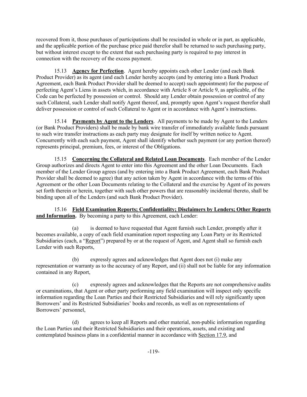 -119- recovered from it, those purchases of participations shall be rescinded in whole or in part, as applicable, and the applicable portion of the purchase price paid therefor shall be returned to such purchasing party, but without interest except to the extent that such purchasing party is required to pay interest in connection with the recovery of the excess payment. 15.13 Agency for Perfection. Agent hereby appoints each other Lender (and each Bank Product Provider) as its agent (and each Lender hereby accepts (and by entering into a Bank Product Agreement, each Bank Product Provider shall be deemed to accept) such appointment) for the purpose of perfecting Agent’s Liens in assets which, in accordance with Article 8 or Article 9, as applicable, of the Code can be perfected by possession or control. Should any Lender obtain possession or control of any such Collateral, such Lender shall notify Agent thereof, and, promptly upon Agent’s request therefor shall deliver possession or control of such Collateral to Agent or in accordance with Agent’s instructions. 15.14 Payments by Agent to the Lenders. All payments to be made by Agent to the Lenders (or Bank Product Providers) shall be made by bank wire transfer of immediately available funds pursuant to such wire transfer instructions as each party may designate for itself by written notice to Agent. Concurrently with each such payment, Agent shall identify whether such payment (or any portion thereof) represents principal, premium, fees, or interest of the Obligations. 15.15 Concerning the Collateral and Related Loan Documents. Each member of the Lender Group authorizes and directs Agent to enter into this Agreement and the other Loan Documents. Each member of the Lender Group agrees (and by entering into a Bank Product Agreement, each Bank Product Provider shall be deemed to agree) that any action taken by Agent in accordance with the terms of this Agreement or the other Loan Documents relating to the Collateral and the exercise by Agent of its powers set forth therein or herein, together with such other powers that are reasonably incidental thereto, shall be binding upon all of the Lenders (and such Bank Product Provider). 15.16 Field Examination Reports; Confidentiality; Disclaimers by Lenders; Other Reports and Information. By becoming a party to this Agreement, each Lender: (a) is deemed to have requested that Agent furnish such Lender, promptly after it becomes available, a copy of each field examination report respecting any Loan Party or its Restricted Subsidiaries (each, a “Report”) prepared by or at the request of Agent, and Agent shall so furnish each Lender with such Reports, (b) expressly agrees and acknowledges that Agent does not (i) make any representation or warranty as to the accuracy of any Report, and (ii) shall not be liable for any information contained in any Report, (c) expressly agrees and acknowledges that the Reports are not comprehensive audits or examinations, that Agent or other party performing any field examination will inspect only specific information regarding the Loan Parties and their Restricted Subsidiaries and will rely significantly upon Borrowers’ and its Restricted Subsidiaries’ books and records, as well as on representations of Borrowers’ personnel, (d) agrees to keep all Reports and other material, non-public information regarding the Loan Parties and their Restricted Subsidiaries and their operations, assets, and existing and contemplated business plans in a confidential manner in accordance with Section 17.9, and
