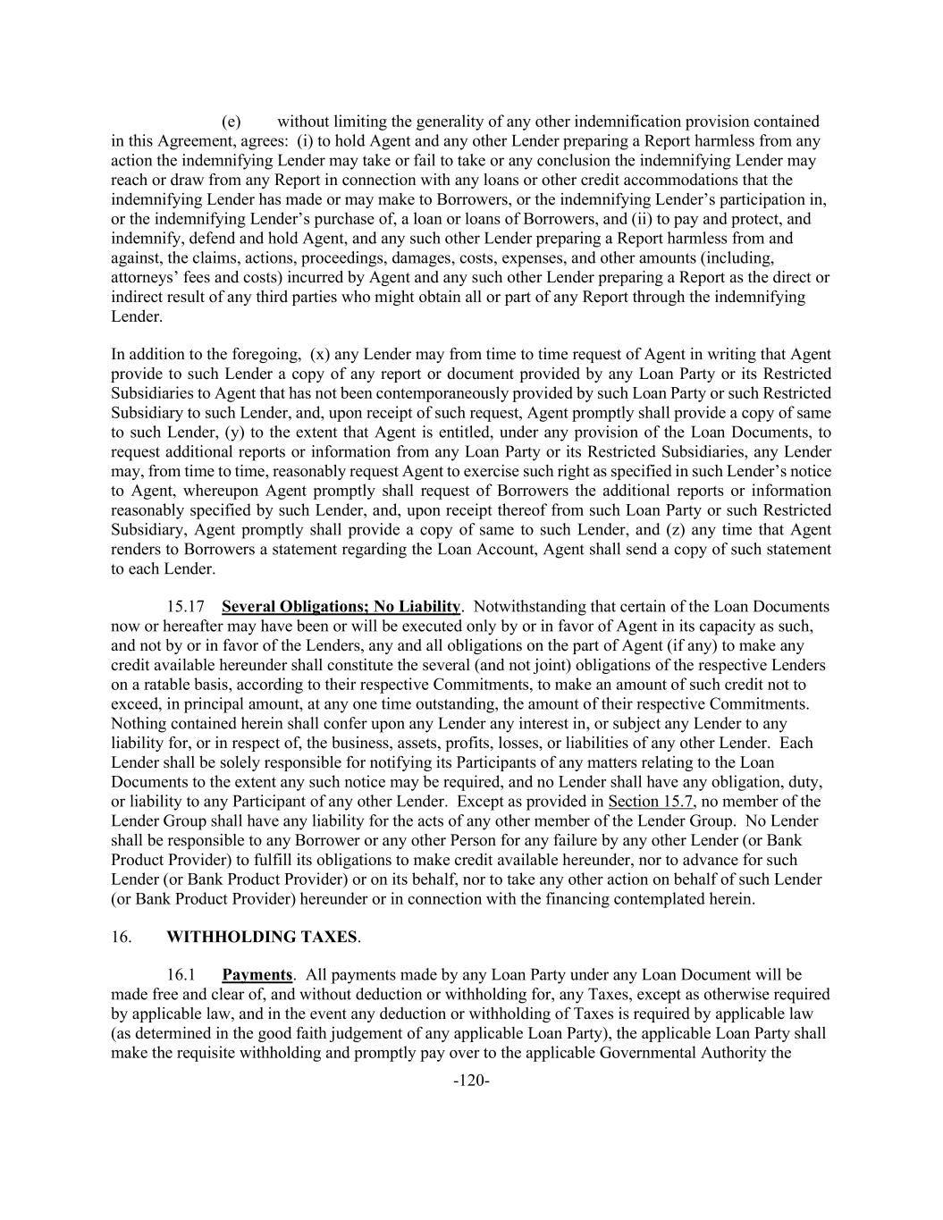 -120- (e) without limiting the generality of any other indemnification provision contained in this Agreement, agrees: (i) to hold Agent and any other Lender preparing a Report harmless from any action the indemnifying Lender may take or fail to take or any conclusion the indemnifying Lender may reach or draw from any Report in connection with any loans or other credit accommodations that the indemnifying Lender has made or may make to Borrowers, or the indemnifying Lender’s participation in, or the indemnifying Lender’s purchase of, a loan or loans of Borrowers, and (ii) to pay and protect, and indemnify, defend and hold Agent, and any such other Lender preparing a Report harmless from and against, the claims, actions, proceedings, damages, costs, expenses, and other amounts (including, attorneys’ fees and costs) incurred by Agent and any such other Lender preparing a Report as the direct or indirect result of any third parties who might obtain all or part of any Report through the indemnifying Lender. In addition to the foregoing, (x) any Lender may from time to time request of Agent in writing that Agent provide to such Lender a copy of any report or document provided by any Loan Party or its Restricted Subsidiaries to Agent that has not been contemporaneously provided by such Loan Party or such Restricted Subsidiary to such Lender, and, upon receipt of such request, Agent promptly shall provide a copy of same to such Lender, (y) to the extent that Agent is entitled, under any provision of the Loan Documents, to request additional reports or information from any Loan Party or its Restricted Subsidiaries, any Lender may, from time to time, reasonably request Agent to exercise such right as specified in such Lender’s notice to Agent, whereupon Agent promptly shall request of Borrowers the additional reports or information reasonably specified by such Lender, and, upon receipt thereof from such Loan Party or such Restricted Subsidiary, Agent promptly shall provide a copy of same to such Lender, and (z) any time that Agent renders to Borrowers a statement regarding the Loan Account, Agent shall send a copy of such statement to each Lender. 15.17 Several Obligations; No Liability. Notwithstanding that certain of the Loan Documents now or hereafter may have been or will be executed only by or in favor of Agent in its capacity as such, and not by or in favor of the Lenders, any and all obligations on the part of Agent (if any) to make any credit available hereunder shall constitute the several (and not joint) obligations of the respective Lenders on a ratable basis, according to their respective Commitments, to make an amount of such credit not to exceed, in principal amount, at any one time outstanding, the amount of their respective Commitments. Nothing contained herein shall confer upon any Lender any interest in, or subject any Lender to any liability for, or in respect of, the business, assets, profits, losses, or liabilities of any other Lender. Each Lender shall be solely responsible for notifying its Participants of any matters relating to the Loan Documents to the extent any such notice may be required, and no Lender shall have any obligation, duty, or liability to any Participant of any other Lender. Except as provided in Section 15.7, no member of the Lender Group shall have any liability for the acts of any other member of the Lender Group. No Lender shall be responsible to any Borrower or any other Person for any failure by any other Lender (or Bank Product Provider) to fulfill its obligations to make credit available hereunder, nor to advance for such Lender (or Bank Product Provider) or on its behalf, nor to take any other action on behalf of such Lender (or Bank Product Provider) hereunder or in connection with the financing contemplated herein. 16. WITHHOLDING TAXES. 16.1 Payments. All payments made by any Loan Party under any Loan Document will be made free and clear of, and without deduction or withholding for, any Taxes, except as otherwise required by applicable law, and in the event any deduction or withholding of Taxes is required by applicable law (as determined in the good faith judgement of any applicable Loan Party), the applicable Loan Party shall make the requisite withholding and promptly pay over to the applicable Governmental Authority the