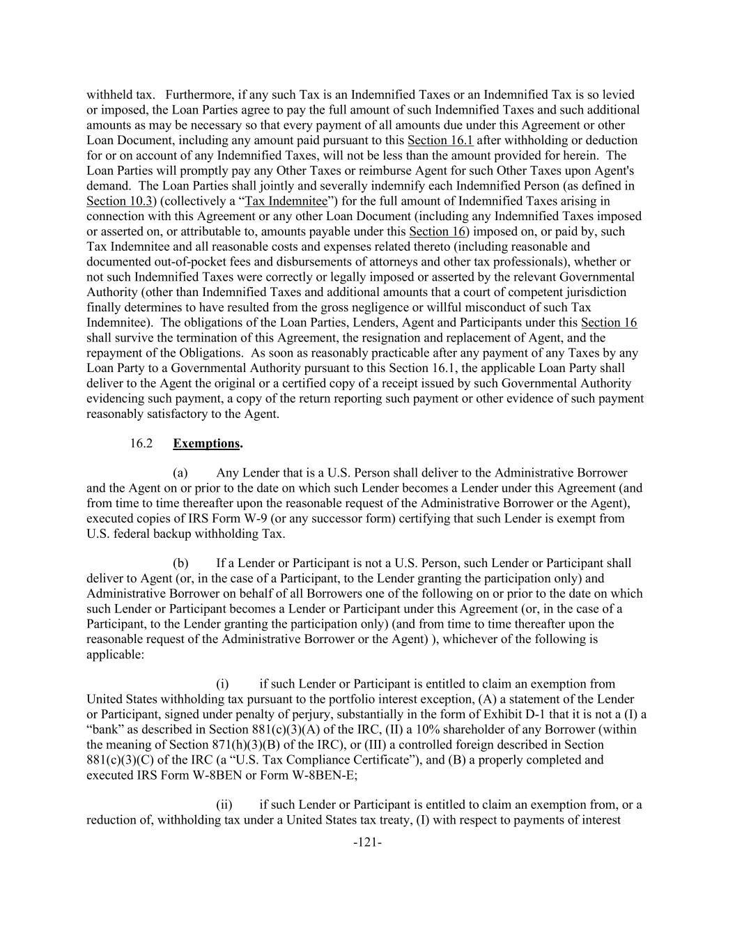 -121- withheld tax. Furthermore, if any such Tax is an Indemnified Taxes or an Indemnified Tax is so levied or imposed, the Loan Parties agree to pay the full amount of such Indemnified Taxes and such additional amounts as may be necessary so that every payment of all amounts due under this Agreement or other Loan Document, including any amount paid pursuant to this Section 16.1 after withholding or deduction for or on account of any Indemnified Taxes, will not be less than the amount provided for herein. The Loan Parties will promptly pay any Other Taxes or reimburse Agent for such Other Taxes upon Agent's demand. The Loan Parties shall jointly and severally indemnify each Indemnified Person (as defined in Section 10.3) (collectively a “Tax Indemnitee”) for the full amount of Indemnified Taxes arising in connection with this Agreement or any other Loan Document (including any Indemnified Taxes imposed or asserted on, or attributable to, amounts payable under this Section 16) imposed on, or paid by, such Tax Indemnitee and all reasonable costs and expenses related thereto (including reasonable and documented out-of-pocket fees and disbursements of attorneys and other tax professionals), whether or not such Indemnified Taxes were correctly or legally imposed or asserted by the relevant Governmental Authority (other than Indemnified Taxes and additional amounts that a court of competent jurisdiction finally determines to have resulted from the gross negligence or willful misconduct of such Tax Indemnitee). The obligations of the Loan Parties, Lenders, Agent and Participants under this Section 16 shall survive the termination of this Agreement, the resignation and replacement of Agent, and the repayment of the Obligations. As soon as reasonably practicable after any payment of any Taxes by any Loan Party to a Governmental Authority pursuant to this Section 16.1, the applicable Loan Party shall deliver to the Agent the original or a certified copy of a receipt issued by such Governmental Authority evidencing such payment, a copy of the return reporting such payment or other evidence of such payment reasonably satisfactory to the Agent. 16.2 Exemptions. (a) Any Lender that is a U.S. Person shall deliver to the Administrative Borrower and the Agent on or prior to the date on which such Lender becomes a Lender under this Agreement (and from time to time thereafter upon the reasonable request of the Administrative Borrower or the Agent), executed copies of IRS Form W-9 (or any successor form) certifying that such Lender is exempt from U.S. federal backup withholding Tax. (b) If a Lender or Participant is not a U.S. Person, such Lender or Participant shall deliver to Agent (or, in the case of a Participant, to the Lender granting the participation only) and Administrative Borrower on behalf of all Borrowers one of the following on or prior to the date on which such Lender or Participant becomes a Lender or Participant under this Agreement (or, in the case of a Participant, to the Lender granting the participation only) (and from time to time thereafter upon the reasonable request of the Administrative Borrower or the Agent) ), whichever of the following is applicable: (i) if such Lender or Participant is entitled to claim an exemption from United States withholding tax pursuant to the portfolio interest exception, (A) a statement of the Lender or Participant, signed under penalty of perjury, substantially in the form of Exhibit D-1 that it is not a (I) a “bank” as described in Section 881(c)(3)(A) of the IRC, (II) a 10% shareholder of any Borrower (within the meaning of Section 871(h)(3)(B) of the IRC), or (III) a controlled foreign described in Section 881(c)(3)(C) of the IRC (a “U.S. Tax Compliance Certificate”), and (B) a properly completed and executed IRS Form W-8BEN or Form W-8BEN-E; (ii) if such Lender or Participant is entitled to claim an exemption from, or a reduction of, withholding tax under a United States tax treaty, (I) with respect to payments of interest