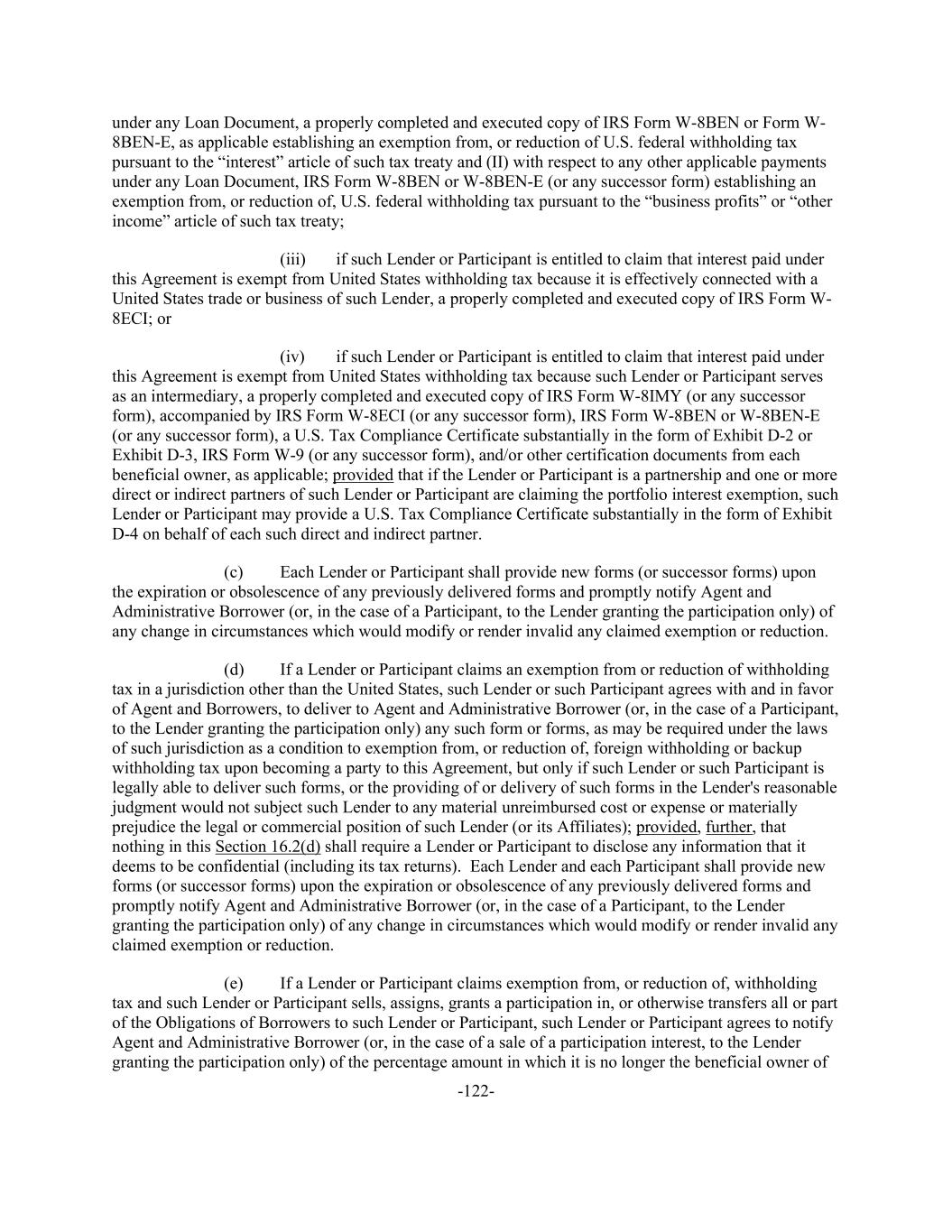 -122- under any Loan Document, a properly completed and executed copy of IRS Form W-8BEN or Form W- 8BEN-E, as applicable establishing an exemption from, or reduction of U.S. federal withholding tax pursuant to the “interest” article of such tax treaty and (II) with respect to any other applicable payments under any Loan Document, IRS Form W-8BEN or W-8BEN-E (or any successor form) establishing an exemption from, or reduction of, U.S. federal withholding tax pursuant to the “business profits” or “other income” article of such tax treaty; (iii) if such Lender or Participant is entitled to claim that interest paid under this Agreement is exempt from United States withholding tax because it is effectively connected with a United States trade or business of such Lender, a properly completed and executed copy of IRS Form W- 8ECI; or (iv) if such Lender or Participant is entitled to claim that interest paid under this Agreement is exempt from United States withholding tax because such Lender or Participant serves as an intermediary, a properly completed and executed copy of IRS Form W-8IMY (or any successor form), accompanied by IRS Form W-8ECI (or any successor form), IRS Form W-8BEN or W-8BEN-E (or any successor form), a U.S. Tax Compliance Certificate substantially in the form of Exhibit D-2 or Exhibit D-3, IRS Form W-9 (or any successor form), and/or other certification documents from each beneficial owner, as applicable; provided that if the Lender or Participant is a partnership and one or more direct or indirect partners of such Lender or Participant are claiming the portfolio interest exemption, such Lender or Participant may provide a U.S. Tax Compliance Certificate substantially in the form of Exhibit D-4 on behalf of each such direct and indirect partner. (c) Each Lender or Participant shall provide new forms (or successor forms) upon the expiration or obsolescence of any previously delivered forms and promptly notify Agent and Administrative Borrower (or, in the case of a Participant, to the Lender granting the participation only) of any change in circumstances which would modify or render invalid any claimed exemption or reduction. (d) If a Lender or Participant claims an exemption from or reduction of withholding tax in a jurisdiction other than the United States, such Lender or such Participant agrees with and in favor of Agent and Borrowers, to deliver to Agent and Administrative Borrower (or, in the case of a Participant, to the Lender granting the participation only) any such form or forms, as may be required under the laws of such jurisdiction as a condition to exemption from, or reduction of, foreign withholding or backup withholding tax upon becoming a party to this Agreement, but only if such Lender or such Participant is legally able to deliver such forms, or the providing of or delivery of such forms in the Lender's reasonable judgment would not subject such Lender to any material unreimbursed cost or expense or materially prejudice the legal or commercial position of such Lender (or its Affiliates); provided, further, that nothing in this Section 16.2(d) shall require a Lender or Participant to disclose any information that it deems to be confidential (including its tax returns). Each Lender and each Participant shall provide new forms (or successor forms) upon the expiration or obsolescence of any previously delivered forms and promptly notify Agent and Administrative Borrower (or, in the case of a Participant, to the Lender granting the participation only) of any change in circumstances which would modify or render invalid any claimed exemption or reduction. (e) If a Lender or Participant claims exemption from, or reduction of, withholding tax and such Lender or Participant sells, assigns, grants a participation in, or otherwise transfers all or part of the Obligations of Borrowers to such Lender or Participant, such Lender or Participant agrees to notify Agent and Administrative Borrower (or, in the case of a sale of a participation interest, to the Lender granting the participation only) of the percentage amount in which it is no longer the beneficial owner of