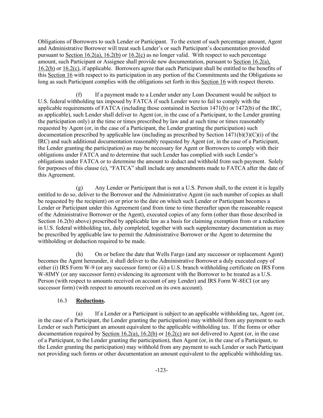 -123- Obligations of Borrowers to such Lender or Participant. To the extent of such percentage amount, Agent and Administrative Borrower will treat such Lender’s or such Participant’s documentation provided pursuant to Section 16.2(a), 16.2(b) or 16.2(c) as no longer valid. With respect to such percentage amount, such Participant or Assignee shall provide new documentation, pursuant to Section 16.2(a), 16.2(b) or 16.2(c), if applicable. Borrowers agree that each Participant shall be entitled to the benefits of this Section 16 with respect to its participation in any portion of the Commitments and the Obligations so long as such Participant complies with the obligations set forth in this Section 16 with respect thereto. (f) If a payment made to a Lender under any Loan Document would be subject to U.S. federal withholding tax imposed by FATCA if such Lender were to fail to comply with the applicable requirements of FATCA (including those contained in Section 1471(b) or 1472(b) of the IRC, as applicable), such Lender shall deliver to Agent (or, in the case of a Participant, to the Lender granting the participation only) at the time or times prescribed by law and at such time or times reasonably requested by Agent (or, in the case of a Participant, the Lender granting the participation) such documentation prescribed by applicable law (including as prescribed by Section 1471(b)(3)(C)(i) of the IRC) and such additional documentation reasonably requested by Agent (or, in the case of a Participant, the Lender granting the participation) as may be necessary for Agent or Borrowers to comply with their obligations under FATCA and to determine that such Lender has complied with such Lender’s obligations under FATCA or to determine the amount to deduct and withhold from such payment. Solely for purposes of this clause (e), “FATCA” shall include any amendments made to FATCA after the date of this Agreement. (g) Any Lender or Participant that is not a U.S. Person shall, to the extent it is legally entitled to do so, deliver to the Borrower and the Administrative Agent (in such number of copies as shall be requested by the recipient) on or prior to the date on which such Lender or Participant becomes a Lender or Participant under this Agreement (and from time to time thereafter upon the reasonable request of the Administrative Borrower or the Agent), executed copies of any form (other than those described in Section 16.2(b) above) prescribed by applicable law as a basis for claiming exemption from or a reduction in U.S. federal withholding tax, duly completed, together with such supplementary documentation as may be prescribed by applicable law to permit the Administrative Borrower or the Agent to determine the withholding or deduction required to be made. (h) On or before the date that Wells Fargo (and any successor or replacement Agent) becomes the Agent hereunder, it shall deliver to the Administrative Borrower a duly executed copy of either (i) IRS Form W-9 (or any successor form) or (ii) a U.S. branch withholding certificate on IRS Form W-8IMY (or any successor form) evidencing its agreement with the Borrower to be treated as a U.S. Person (with respect to amounts received on account of any Lender) and IRS Form W-8ECI (or any successor form) (with respect to amounts received on its own account). 16.3 Reductions. (a) If a Lender or a Participant is subject to an applicable withholding tax, Agent (or, in the case of a Participant, the Lender granting the participation) may withhold from any payment to such Lender or such Participant an amount equivalent to the applicable withholding tax. If the forms or other documentation required by Section 16.2(a), 16.2(b) or 16.2(c) are not delivered to Agent (or, in the case of a Participant, to the Lender granting the participation), then Agent (or, in the case of a Participant, to the Lender granting the participation) may withhold from any payment to such Lender or such Participant not providing such forms or other documentation an amount equivalent to the applicable withholding tax.