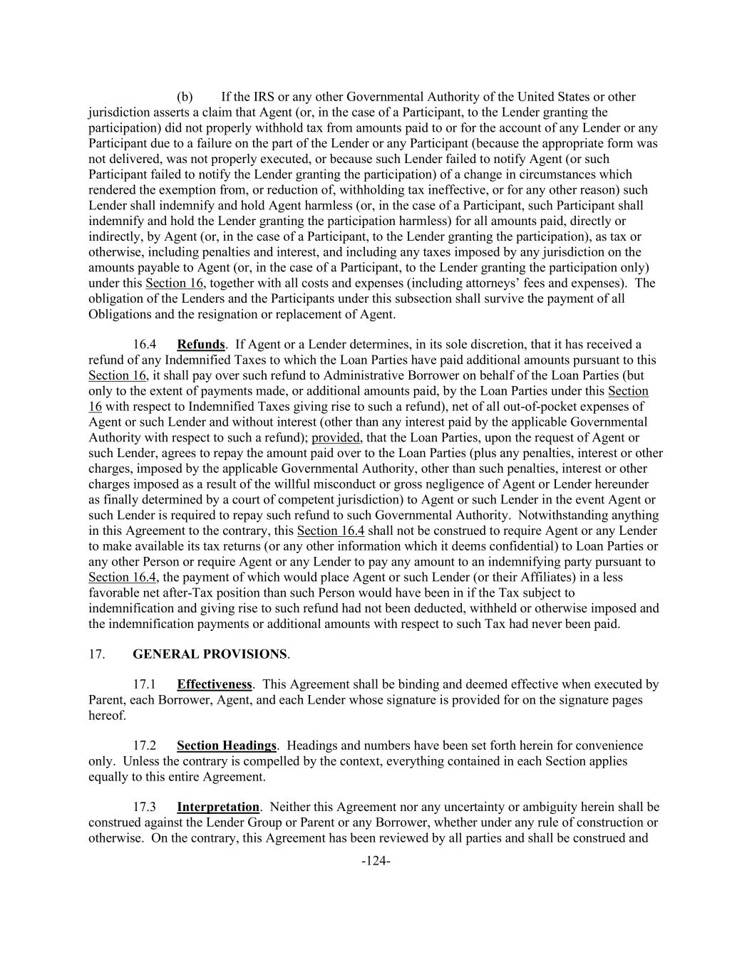 -124- (b) If the IRS or any other Governmental Authority of the United States or other jurisdiction asserts a claim that Agent (or, in the case of a Participant, to the Lender granting the participation) did not properly withhold tax from amounts paid to or for the account of any Lender or any Participant due to a failure on the part of the Lender or any Participant (because the appropriate form was not delivered, was not properly executed, or because such Lender failed to notify Agent (or such Participant failed to notify the Lender granting the participation) of a change in circumstances which rendered the exemption from, or reduction of, withholding tax ineffective, or for any other reason) such Lender shall indemnify and hold Agent harmless (or, in the case of a Participant, such Participant shall indemnify and hold the Lender granting the participation harmless) for all amounts paid, directly or indirectly, by Agent (or, in the case of a Participant, to the Lender granting the participation), as tax or otherwise, including penalties and interest, and including any taxes imposed by any jurisdiction on the amounts payable to Agent (or, in the case of a Participant, to the Lender granting the participation only) under this Section 16, together with all costs and expenses (including attorneys’ fees and expenses). The obligation of the Lenders and the Participants under this subsection shall survive the payment of all Obligations and the resignation or replacement of Agent. 16.4 Refunds. If Agent or a Lender determines, in its sole discretion, that it has received a refund of any Indemnified Taxes to which the Loan Parties have paid additional amounts pursuant to this Section 16, it shall pay over such refund to Administrative Borrower on behalf of the Loan Parties (but only to the extent of payments made, or additional amounts paid, by the Loan Parties under this Section 16 with respect to Indemnified Taxes giving rise to such a refund), net of all out-of-pocket expenses of Agent or such Lender and without interest (other than any interest paid by the applicable Governmental Authority with respect to such a refund); provided, that the Loan Parties, upon the request of Agent or such Lender, agrees to repay the amount paid over to the Loan Parties (plus any penalties, interest or other charges, imposed by the applicable Governmental Authority, other than such penalties, interest or other charges imposed as a result of the willful misconduct or gross negligence of Agent or Lender hereunder as finally determined by a court of competent jurisdiction) to Agent or such Lender in the event Agent or such Lender is required to repay such refund to such Governmental Authority. Notwithstanding anything in this Agreement to the contrary, this Section 16.4 shall not be construed to require Agent or any Lender to make available its tax returns (or any other information which it deems confidential) to Loan Parties or any other Person or require Agent or any Lender to pay any amount to an indemnifying party pursuant to Section 16.4, the payment of which would place Agent or such Lender (or their Affiliates) in a less favorable net after-Tax position than such Person would have been in if the Tax subject to indemnification and giving rise to such refund had not been deducted, withheld or otherwise imposed and the indemnification payments or additional amounts with respect to such Tax had never been paid. 17. GENERAL PROVISIONS. 17.1 Effectiveness. This Agreement shall be binding and deemed effective when executed by Parent, each Borrower, Agent, and each Lender whose signature is provided for on the signature pages hereof. 17.2 Section Headings. Headings and numbers have been set forth herein for convenience only. Unless the contrary is compelled by the context, everything contained in each Section applies equally to this entire Agreement. 17.3 Interpretation. Neither this Agreement nor any uncertainty or ambiguity herein shall be construed against the Lender Group or Parent or any Borrower, whether under any rule of construction or otherwise. On the contrary, this Agreement has been reviewed by all parties and shall be construed and