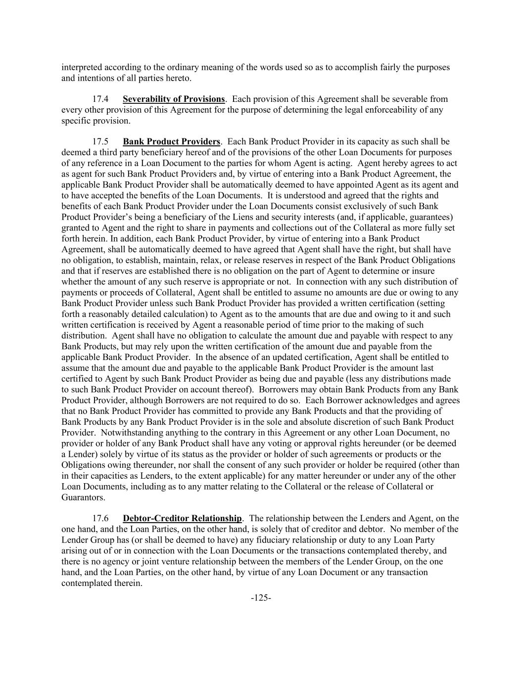 -125- interpreted according to the ordinary meaning of the words used so as to accomplish fairly the purposes and intentions of all parties hereto. 17.4 Severability of Provisions. Each provision of this Agreement shall be severable from every other provision of this Agreement for the purpose of determining the legal enforceability of any specific provision. 17.5 Bank Product Providers. Each Bank Product Provider in its capacity as such shall be deemed a third party beneficiary hereof and of the provisions of the other Loan Documents for purposes of any reference in a Loan Document to the parties for whom Agent is acting. Agent hereby agrees to act as agent for such Bank Product Providers and, by virtue of entering into a Bank Product Agreement, the applicable Bank Product Provider shall be automatically deemed to have appointed Agent as its agent and to have accepted the benefits of the Loan Documents. It is understood and agreed that the rights and benefits of each Bank Product Provider under the Loan Documents consist exclusively of such Bank Product Provider’s being a beneficiary of the Liens and security interests (and, if applicable, guarantees) granted to Agent and the right to share in payments and collections out of the Collateral as more fully set forth herein. In addition, each Bank Product Provider, by virtue of entering into a Bank Product Agreement, shall be automatically deemed to have agreed that Agent shall have the right, but shall have no obligation, to establish, maintain, relax, or release reserves in respect of the Bank Product Obligations and that if reserves are established there is no obligation on the part of Agent to determine or insure whether the amount of any such reserve is appropriate or not. In connection with any such distribution of payments or proceeds of Collateral, Agent shall be entitled to assume no amounts are due or owing to any Bank Product Provider unless such Bank Product Provider has provided a written certification (setting forth a reasonably detailed calculation) to Agent as to the amounts that are due and owing to it and such written certification is received by Agent a reasonable period of time prior to the making of such distribution. Agent shall have no obligation to calculate the amount due and payable with respect to any Bank Products, but may rely upon the written certification of the amount due and payable from the applicable Bank Product Provider. In the absence of an updated certification, Agent shall be entitled to assume that the amount due and payable to the applicable Bank Product Provider is the amount last certified to Agent by such Bank Product Provider as being due and payable (less any distributions made to such Bank Product Provider on account thereof). Borrowers may obtain Bank Products from any Bank Product Provider, although Borrowers are not required to do so. Each Borrower acknowledges and agrees that no Bank Product Provider has committed to provide any Bank Products and that the providing of Bank Products by any Bank Product Provider is in the sole and absolute discretion of such Bank Product Provider. Notwithstanding anything to the contrary in this Agreement or any other Loan Document, no provider or holder of any Bank Product shall have any voting or approval rights hereunder (or be deemed a Lender) solely by virtue of its status as the provider or holder of such agreements or products or the Obligations owing thereunder, nor shall the consent of any such provider or holder be required (other than in their capacities as Lenders, to the extent applicable) for any matter hereunder or under any of the other Loan Documents, including as to any matter relating to the Collateral or the release of Collateral or Guarantors. 17.6 Debtor-Creditor Relationship. The relationship between the Lenders and Agent, on the one hand, and the Loan Parties, on the other hand, is solely that of creditor and debtor. No member of the Lender Group has (or shall be deemed to have) any fiduciary relationship or duty to any Loan Party arising out of or in connection with the Loan Documents or the transactions contemplated thereby, and there is no agency or joint venture relationship between the members of the Lender Group, on the one hand, and the Loan Parties, on the other hand, by virtue of any Loan Document or any transaction contemplated therein.