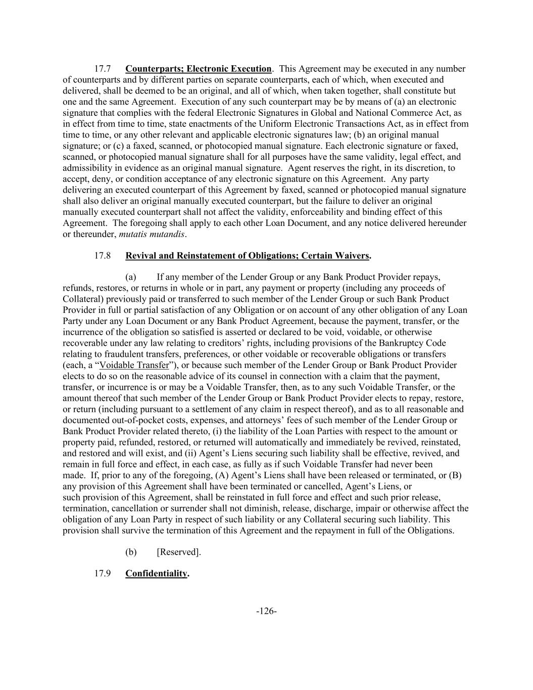 -126- 17.7 Counterparts; Electronic Execution. This Agreement may be executed in any number of counterparts and by different parties on separate counterparts, each of which, when executed and delivered, shall be deemed to be an original, and all of which, when taken together, shall constitute but one and the same Agreement. Execution of any such counterpart may be by means of (a) an electronic signature that complies with the federal Electronic Signatures in Global and National Commerce Act, as in effect from time to time, state enactments of the Uniform Electronic Transactions Act, as in effect from time to time, or any other relevant and applicable electronic signatures law; (b) an original manual signature; or (c) a faxed, scanned, or photocopied manual signature. Each electronic signature or faxed, scanned, or photocopied manual signature shall for all purposes have the same validity, legal effect, and admissibility in evidence as an original manual signature. Agent reserves the right, in its discretion, to accept, deny, or condition acceptance of any electronic signature on this Agreement. Any party delivering an executed counterpart of this Agreement by faxed, scanned or photocopied manual signature shall also deliver an original manually executed counterpart, but the failure to deliver an original manually executed counterpart shall not affect the validity, enforceability and binding effect of this Agreement. The foregoing shall apply to each other Loan Document, and any notice delivered hereunder or thereunder, mutatis mutandis. 17.8 Revival and Reinstatement of Obligations; Certain Waivers. (a) If any member of the Lender Group or any Bank Product Provider repays, refunds, restores, or returns in whole or in part, any payment or property (including any proceeds of Collateral) previously paid or transferred to such member of the Lender Group or such Bank Product Provider in full or partial satisfaction of any Obligation or on account of any other obligation of any Loan Party under any Loan Document or any Bank Product Agreement, because the payment, transfer, or the incurrence of the obligation so satisfied is asserted or declared to be void, voidable, or otherwise recoverable under any law relating to creditors’ rights, including provisions of the Bankruptcy Code relating to fraudulent transfers, preferences, or other voidable or recoverable obligations or transfers (each, a “Voidable Transfer”), or because such member of the Lender Group or Bank Product Provider elects to do so on the reasonable advice of its counsel in connection with a claim that the payment, transfer, or incurrence is or may be a Voidable Transfer, then, as to any such Voidable Transfer, or the amount thereof that such member of the Lender Group or Bank Product Provider elects to repay, restore, or return (including pursuant to a settlement of any claim in respect thereof), and as to all reasonable and documented out-of-pocket costs, expenses, and attorneys’ fees of such member of the Lender Group or Bank Product Provider related thereto, (i) the liability of the Loan Parties with respect to the amount or property paid, refunded, restored, or returned will automatically and immediately be revived, reinstated, and restored and will exist, and (ii) Agent’s Liens securing such liability shall be effective, revived, and remain in full force and effect, in each case, as fully as if such Voidable Transfer had never been made. If, prior to any of the foregoing, (A) Agent’s Liens shall have been released or terminated, or (B) any provision of this Agreement shall have been terminated or cancelled, Agent’s Liens, or such provision of this Agreement, shall be reinstated in full force and effect and such prior release, termination, cancellation or surrender shall not diminish, release, discharge, impair or otherwise affect the obligation of any Loan Party in respect of such liability or any Collateral securing such liability. This provision shall survive the termination of this Agreement and the repayment in full of the Obligations. (b) [Reserved]. 17.9 Confidentiality.