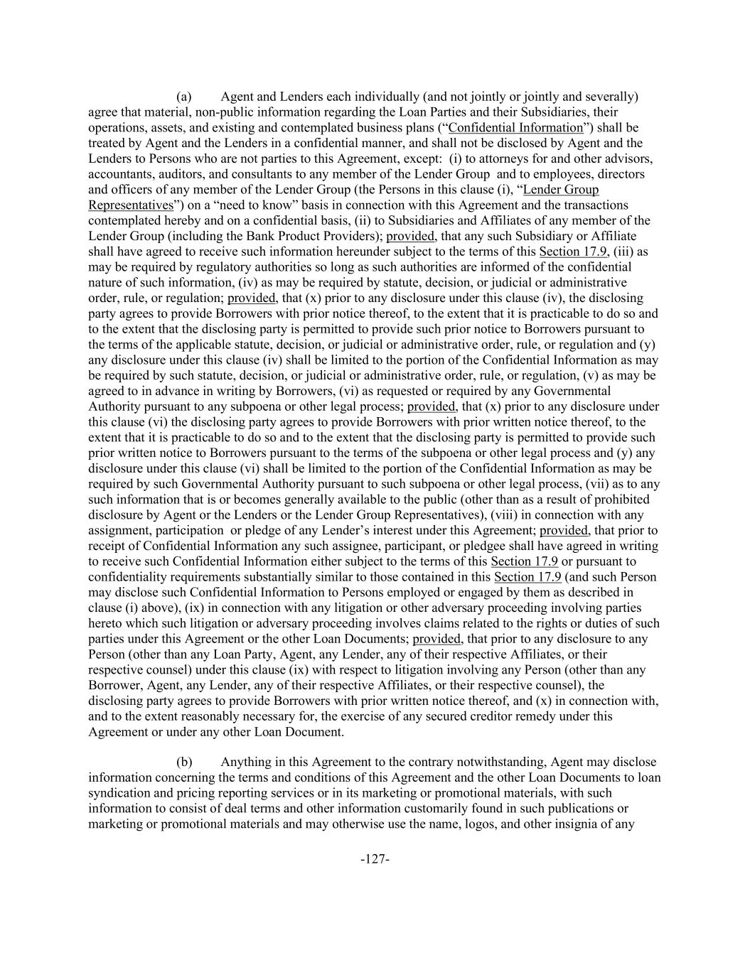 -127- (a) Agent and Lenders each individually (and not jointly or jointly and severally) agree that material, non-public information regarding the Loan Parties and their Subsidiaries, their operations, assets, and existing and contemplated business plans (“Confidential Information”) shall be treated by Agent and the Lenders in a confidential manner, and shall not be disclosed by Agent and the Lenders to Persons who are not parties to this Agreement, except: (i) to attorneys for and other advisors, accountants, auditors, and consultants to any member of the Lender Group and to employees, directors and officers of any member of the Lender Group (the Persons in this clause (i), “Lender Group Representatives”) on a “need to know” basis in connection with this Agreement and the transactions contemplated hereby and on a confidential basis, (ii) to Subsidiaries and Affiliates of any member of the Lender Group (including the Bank Product Providers); provided, that any such Subsidiary or Affiliate shall have agreed to receive such information hereunder subject to the terms of this Section 17.9, (iii) as may be required by regulatory authorities so long as such authorities are informed of the confidential nature of such information, (iv) as may be required by statute, decision, or judicial or administrative order, rule, or regulation; provided, that (x) prior to any disclosure under this clause (iv), the disclosing party agrees to provide Borrowers with prior notice thereof, to the extent that it is practicable to do so and to the extent that the disclosing party is permitted to provide such prior notice to Borrowers pursuant to the terms of the applicable statute, decision, or judicial or administrative order, rule, or regulation and (y) any disclosure under this clause (iv) shall be limited to the portion of the Confidential Information as may be required by such statute, decision, or judicial or administrative order, rule, or regulation, (v) as may be agreed to in advance in writing by Borrowers, (vi) as requested or required by any Governmental Authority pursuant to any subpoena or other legal process; provided, that (x) prior to any disclosure under this clause (vi) the disclosing party agrees to provide Borrowers with prior written notice thereof, to the extent that it is practicable to do so and to the extent that the disclosing party is permitted to provide such prior written notice to Borrowers pursuant to the terms of the subpoena or other legal process and (y) any disclosure under this clause (vi) shall be limited to the portion of the Confidential Information as may be required by such Governmental Authority pursuant to such subpoena or other legal process, (vii) as to any such information that is or becomes generally available to the public (other than as a result of prohibited disclosure by Agent or the Lenders or the Lender Group Representatives), (viii) in connection with any assignment, participation or pledge of any Lender’s interest under this Agreement; provided, that prior to receipt of Confidential Information any such assignee, participant, or pledgee shall have agreed in writing to receive such Confidential Information either subject to the terms of this Section 17.9 or pursuant to confidentiality requirements substantially similar to those contained in this Section 17.9 (and such Person may disclose such Confidential Information to Persons employed or engaged by them as described in clause (i) above), (ix) in connection with any litigation or other adversary proceeding involving parties hereto which such litigation or adversary proceeding involves claims related to the rights or duties of such parties under this Agreement or the other Loan Documents; provided, that prior to any disclosure to any Person (other than any Loan Party, Agent, any Lender, any of their respective Affiliates, or their respective counsel) under this clause (ix) with respect to litigation involving any Person (other than any Borrower, Agent, any Lender, any of their respective Affiliates, or their respective counsel), the disclosing party agrees to provide Borrowers with prior written notice thereof, and (x) in connection with, and to the extent reasonably necessary for, the exercise of any secured creditor remedy under this Agreement or under any other Loan Document. (b) Anything in this Agreement to the contrary notwithstanding, Agent may disclose information concerning the terms and conditions of this Agreement and the other Loan Documents to loan syndication and pricing reporting services or in its marketing or promotional materials, with such information to consist of deal terms and other information customarily found in such publications or marketing or promotional materials and may otherwise use the name, logos, and other insignia of any