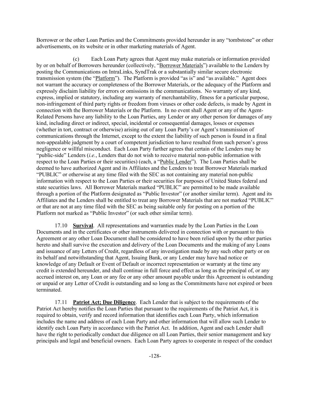-128- Borrower or the other Loan Parties and the Commitments provided hereunder in any “tombstone” or other advertisements, on its website or in other marketing materials of Agent. (c) Each Loan Party agrees that Agent may make materials or information provided by or on behalf of Borrowers hereunder (collectively, “Borrower Materials”) available to the Lenders by posting the Communications on IntraLinks, SyndTrak or a substantially similar secure electronic transmission system (the “Platform”). The Platform is provided “as is” and “as available.” Agent does not warrant the accuracy or completeness of the Borrower Materials, or the adequacy of the Platform and expressly disclaim liability for errors or omissions in the communications. No warranty of any kind, express, implied or statutory, including any warranty of merchantability, fitness for a particular purpose, non-infringement of third party rights or freedom from viruses or other code defects, is made by Agent in connection with the Borrower Materials or the Platform. In no event shall Agent or any of the Agent- Related Persons have any liability to the Loan Parties, any Lender or any other person for damages of any kind, including direct or indirect, special, incidental or consequential damages, losses or expenses (whether in tort, contract or otherwise) arising out of any Loan Party’s or Agent’s transmission of communications through the Internet, except to the extent the liability of such person is found in a final non-appealable judgment by a court of competent jurisdiction to have resulted from such person’s gross negligence or willful misconduct. Each Loan Party further agrees that certain of the Lenders may be “public-side” Lenders (i.e., Lenders that do not wish to receive material non-public information with respect to the Loan Parties or their securities) (each, a “Public Lender”). The Loan Parties shall be deemed to have authorized Agent and its Affiliates and the Lenders to treat Borrower Materials marked “PUBLIC” or otherwise at any time filed with the SEC as not containing any material non-public information with respect to the Loan Parties or their securities for purposes of United States federal and state securities laws. All Borrower Materials marked “PUBLIC” are permitted to be made available through a portion of the Platform designated as “Public Investor” (or another similar term). Agent and its Affiliates and the Lenders shall be entitled to treat any Borrower Materials that are not marked “PUBLIC” or that are not at any time filed with the SEC as being suitable only for posting on a portion of the Platform not marked as “Public Investor” (or such other similar term). 17.10 Survival. All representations and warranties made by the Loan Parties in the Loan Documents and in the certificates or other instruments delivered in connection with or pursuant to this Agreement or any other Loan Document shall be considered to have been relied upon by the other parties hereto and shall survive the execution and delivery of the Loan Documents and the making of any Loans and issuance of any Letters of Credit, regardless of any investigation made by any such other party or on its behalf and notwithstanding that Agent, Issuing Bank, or any Lender may have had notice or knowledge of any Default or Event of Default or incorrect representation or warranty at the time any credit is extended hereunder, and shall continue in full force and effect as long as the principal of, or any accrued interest on, any Loan or any fee or any other amount payable under this Agreement is outstanding or unpaid or any Letter of Credit is outstanding and so long as the Commitments have not expired or been terminated. 17.11 Patriot Act; Due Diligence. Each Lender that is subject to the requirements of the Patriot Act hereby notifies the Loan Parties that pursuant to the requirements of the Patriot Act, it is required to obtain, verify and record information that identifies each Loan Party, which information includes the name and address of each Loan Party and other information that will allow such Lender to identify each Loan Party in accordance with the Patriot Act. In addition, Agent and each Lender shall have the right to periodically conduct due diligence on all Loan Parties, their senior management and key principals and legal and beneficial owners. Each Loan Party agrees to cooperate in respect of the conduct