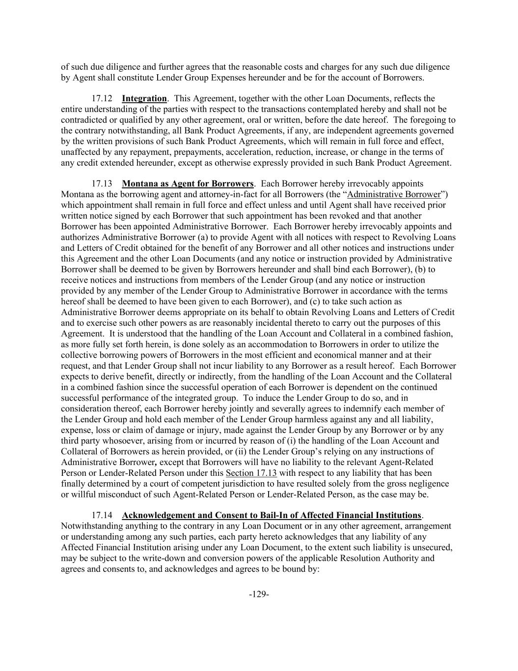 -129- of such due diligence and further agrees that the reasonable costs and charges for any such due diligence by Agent shall constitute Lender Group Expenses hereunder and be for the account of Borrowers. 17.12 Integration. This Agreement, together with the other Loan Documents, reflects the entire understanding of the parties with respect to the transactions contemplated hereby and shall not be contradicted or qualified by any other agreement, oral or written, before the date hereof. The foregoing to the contrary notwithstanding, all Bank Product Agreements, if any, are independent agreements governed by the written provisions of such Bank Product Agreements, which will remain in full force and effect, unaffected by any repayment, prepayments, acceleration, reduction, increase, or change in the terms of any credit extended hereunder, except as otherwise expressly provided in such Bank Product Agreement. 17.13 Montana as Agent for Borrowers. Each Borrower hereby irrevocably appoints Montana as the borrowing agent and attorney-in-fact for all Borrowers (the “Administrative Borrower”) which appointment shall remain in full force and effect unless and until Agent shall have received prior written notice signed by each Borrower that such appointment has been revoked and that another Borrower has been appointed Administrative Borrower. Each Borrower hereby irrevocably appoints and authorizes Administrative Borrower (a) to provide Agent with all notices with respect to Revolving Loans and Letters of Credit obtained for the benefit of any Borrower and all other notices and instructions under this Agreement and the other Loan Documents (and any notice or instruction provided by Administrative Borrower shall be deemed to be given by Borrowers hereunder and shall bind each Borrower), (b) to receive notices and instructions from members of the Lender Group (and any notice or instruction provided by any member of the Lender Group to Administrative Borrower in accordance with the terms hereof shall be deemed to have been given to each Borrower), and (c) to take such action as Administrative Borrower deems appropriate on its behalf to obtain Revolving Loans and Letters of Credit and to exercise such other powers as are reasonably incidental thereto to carry out the purposes of this Agreement. It is understood that the handling of the Loan Account and Collateral in a combined fashion, as more fully set forth herein, is done solely as an accommodation to Borrowers in order to utilize the collective borrowing powers of Borrowers in the most efficient and economical manner and at their request, and that Lender Group shall not incur liability to any Borrower as a result hereof. Each Borrower expects to derive benefit, directly or indirectly, from the handling of the Loan Account and the Collateral in a combined fashion since the successful operation of each Borrower is dependent on the continued successful performance of the integrated group. To induce the Lender Group to do so, and in consideration thereof, each Borrower hereby jointly and severally agrees to indemnify each member of the Lender Group and hold each member of the Lender Group harmless against any and all liability, expense, loss or claim of damage or injury, made against the Lender Group by any Borrower or by any third party whosoever, arising from or incurred by reason of (i) the handling of the Loan Account and Collateral of Borrowers as herein provided, or (ii) the Lender Group’s relying on any instructions of Administrative Borrower, except that Borrowers will have no liability to the relevant Agent-Related Person or Lender-Related Person under this Section 17.13 with respect to any liability that has been finally determined by a court of competent jurisdiction to have resulted solely from the gross negligence or willful misconduct of such Agent-Related Person or Lender-Related Person, as the case may be. 17.14 Acknowledgement and Consent to Bail-In of Affected Financial Institutions. Notwithstanding anything to the contrary in any Loan Document or in any other agreement, arrangement or understanding among any such parties, each party hereto acknowledges that any liability of any Affected Financial Institution arising under any Loan Document, to the extent such liability is unsecured, may be subject to the write-down and conversion powers of the applicable Resolution Authority and agrees and consents to, and acknowledges and agrees to be bound by: