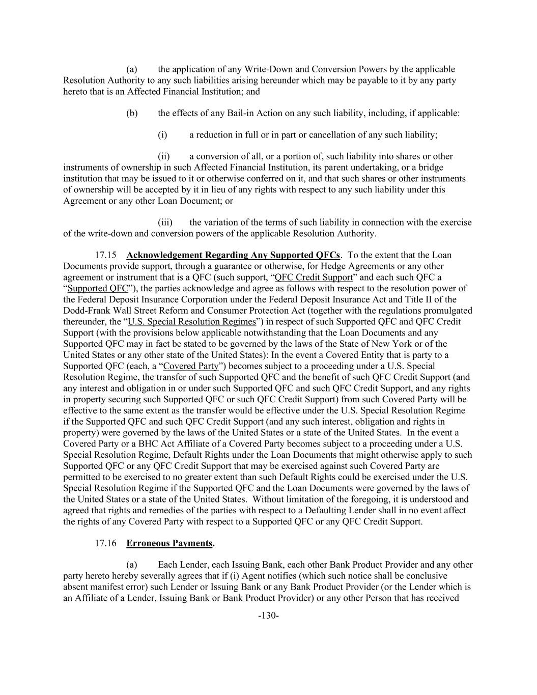 -130- (a) the application of any Write-Down and Conversion Powers by the applicable Resolution Authority to any such liabilities arising hereunder which may be payable to it by any party hereto that is an Affected Financial Institution; and (b) the effects of any Bail-in Action on any such liability, including, if applicable: (i) a reduction in full or in part or cancellation of any such liability; (ii) a conversion of all, or a portion of, such liability into shares or other instruments of ownership in such Affected Financial Institution, its parent undertaking, or a bridge institution that may be issued to it or otherwise conferred on it, and that such shares or other instruments of ownership will be accepted by it in lieu of any rights with respect to any such liability under this Agreement or any other Loan Document; or (iii) the variation of the terms of such liability in connection with the exercise of the write-down and conversion powers of the applicable Resolution Authority. 17.15 Acknowledgement Regarding Any Supported QFCs. To the extent that the Loan Documents provide support, through a guarantee or otherwise, for Hedge Agreements or any other agreement or instrument that is a QFC (such support, “QFC Credit Support” and each such QFC a “Supported QFC”), the parties acknowledge and agree as follows with respect to the resolution power of the Federal Deposit Insurance Corporation under the Federal Deposit Insurance Act and Title II of the Dodd-Frank Wall Street Reform and Consumer Protection Act (together with the regulations promulgated thereunder, the “U.S. Special Resolution Regimes”) in respect of such Supported QFC and QFC Credit Support (with the provisions below applicable notwithstanding that the Loan Documents and any Supported QFC may in fact be stated to be governed by the laws of the State of New York or of the United States or any other state of the United States): In the event a Covered Entity that is party to a Supported QFC (each, a “Covered Party”) becomes subject to a proceeding under a U.S. Special Resolution Regime, the transfer of such Supported QFC and the benefit of such QFC Credit Support (and any interest and obligation in or under such Supported QFC and such QFC Credit Support, and any rights in property securing such Supported QFC or such QFC Credit Support) from such Covered Party will be effective to the same extent as the transfer would be effective under the U.S. Special Resolution Regime if the Supported QFC and such QFC Credit Support (and any such interest, obligation and rights in property) were governed by the laws of the United States or a state of the United States. In the event a Covered Party or a BHC Act Affiliate of a Covered Party becomes subject to a proceeding under a U.S. Special Resolution Regime, Default Rights under the Loan Documents that might otherwise apply to such Supported QFC or any QFC Credit Support that may be exercised against such Covered Party are permitted to be exercised to no greater extent than such Default Rights could be exercised under the U.S. Special Resolution Regime if the Supported QFC and the Loan Documents were governed by the laws of the United States or a state of the United States. Without limitation of the foregoing, it is understood and agreed that rights and remedies of the parties with respect to a Defaulting Lender shall in no event affect the rights of any Covered Party with respect to a Supported QFC or any QFC Credit Support. 17.16 Erroneous Payments. (a) Each Lender, each Issuing Bank, each other Bank Product Provider and any other party hereto hereby severally agrees that if (i) Agent notifies (which such notice shall be conclusive absent manifest error) such Lender or Issuing Bank or any Bank Product Provider (or the Lender which is an Affiliate of a Lender, Issuing Bank or Bank Product Provider) or any other Person that has received