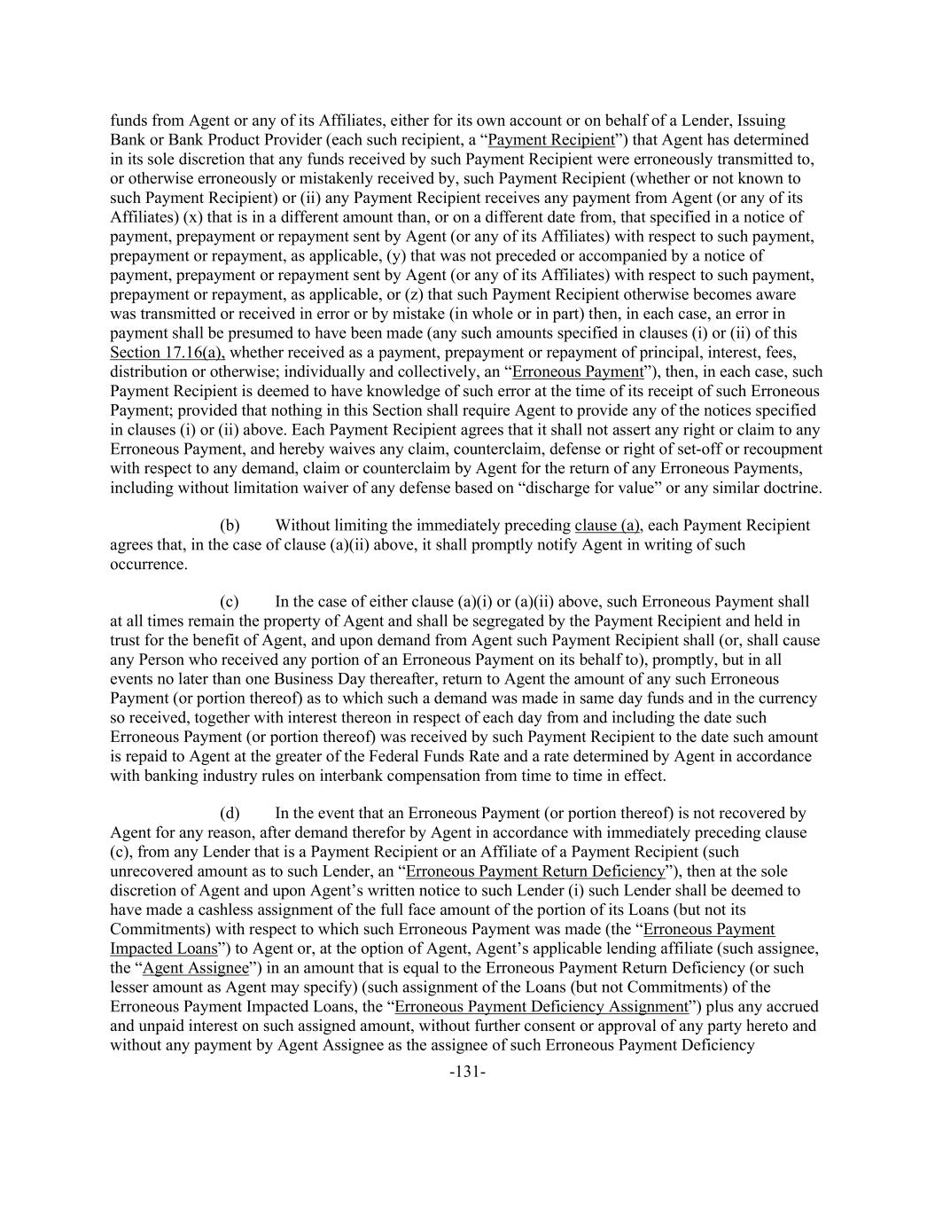 -131- funds from Agent or any of its Affiliates, either for its own account or on behalf of a Lender, Issuing Bank or Bank Product Provider (each such recipient, a “Payment Recipient”) that Agent has determined in its sole discretion that any funds received by such Payment Recipient were erroneously transmitted to, or otherwise erroneously or mistakenly received by, such Payment Recipient (whether or not known to such Payment Recipient) or (ii) any Payment Recipient receives any payment from Agent (or any of its Affiliates) (x) that is in a different amount than, or on a different date from, that specified in a notice of payment, prepayment or repayment sent by Agent (or any of its Affiliates) with respect to such payment, prepayment or repayment, as applicable, (y) that was not preceded or accompanied by a notice of payment, prepayment or repayment sent by Agent (or any of its Affiliates) with respect to such payment, prepayment or repayment, as applicable, or (z) that such Payment Recipient otherwise becomes aware was transmitted or received in error or by mistake (in whole or in part) then, in each case, an error in payment shall be presumed to have been made (any such amounts specified in clauses (i) or (ii) of this Section 17.16(a), whether received as a payment, prepayment or repayment of principal, interest, fees, distribution or otherwise; individually and collectively, an “Erroneous Payment”), then, in each case, such Payment Recipient is deemed to have knowledge of such error at the time of its receipt of such Erroneous Payment; provided that nothing in this Section shall require Agent to provide any of the notices specified in clauses (i) or (ii) above. Each Payment Recipient agrees that it shall not assert any right or claim to any Erroneous Payment, and hereby waives any claim, counterclaim, defense or right of set-off or recoupment with respect to any demand, claim or counterclaim by Agent for the return of any Erroneous Payments, including without limitation waiver of any defense based on “discharge for value” or any similar doctrine. (b) Without limiting the immediately preceding clause (a), each Payment Recipient agrees that, in the case of clause (a)(ii) above, it shall promptly notify Agent in writing of such occurrence. (c) In the case of either clause (a)(i) or (a)(ii) above, such Erroneous Payment shall at all times remain the property of Agent and shall be segregated by the Payment Recipient and held in trust for the benefit of Agent, and upon demand from Agent such Payment Recipient shall (or, shall cause any Person who received any portion of an Erroneous Payment on its behalf to), promptly, but in all events no later than one Business Day thereafter, return to Agent the amount of any such Erroneous Payment (or portion thereof) as to which such a demand was made in same day funds and in the currency so received, together with interest thereon in respect of each day from and including the date such Erroneous Payment (or portion thereof) was received by such Payment Recipient to the date such amount is repaid to Agent at the greater of the Federal Funds Rate and a rate determined by Agent in accordance with banking industry rules on interbank compensation from time to time in effect. (d) In the event that an Erroneous Payment (or portion thereof) is not recovered by Agent for any reason, after demand therefor by Agent in accordance with immediately preceding clause (c), from any Lender that is a Payment Recipient or an Affiliate of a Payment Recipient (such unrecovered amount as to such Lender, an “Erroneous Payment Return Deficiency”), then at the sole discretion of Agent and upon Agent’s written notice to such Lender (i) such Lender shall be deemed to have made a cashless assignment of the full face amount of the portion of its Loans (but not its Commitments) with respect to which such Erroneous Payment was made (the “Erroneous Payment Impacted Loans”) to Agent or, at the option of Agent, Agent’s applicable lending affiliate (such assignee, the “Agent Assignee”) in an amount that is equal to the Erroneous Payment Return Deficiency (or such lesser amount as Agent may specify) (such assignment of the Loans (but not Commitments) of the Erroneous Payment Impacted Loans, the “Erroneous Payment Deficiency Assignment”) plus any accrued and unpaid interest on such assigned amount, without further consent or approval of any party hereto and without any payment by Agent Assignee as the assignee of such Erroneous Payment Deficiency
