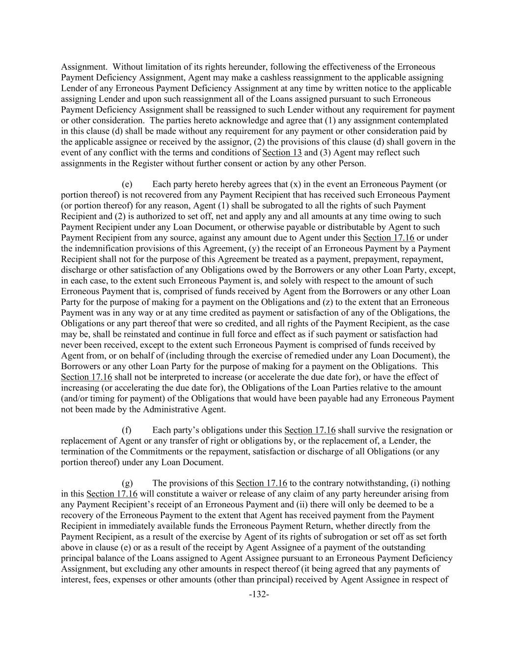 -132- Assignment. Without limitation of its rights hereunder, following the effectiveness of the Erroneous Payment Deficiency Assignment, Agent may make a cashless reassignment to the applicable assigning Lender of any Erroneous Payment Deficiency Assignment at any time by written notice to the applicable assigning Lender and upon such reassignment all of the Loans assigned pursuant to such Erroneous Payment Deficiency Assignment shall be reassigned to such Lender without any requirement for payment or other consideration. The parties hereto acknowledge and agree that (1) any assignment contemplated in this clause (d) shall be made without any requirement for any payment or other consideration paid by the applicable assignee or received by the assignor, (2) the provisions of this clause (d) shall govern in the event of any conflict with the terms and conditions of Section 13 and (3) Agent may reflect such assignments in the Register without further consent or action by any other Person. (e) Each party hereto hereby agrees that (x) in the event an Erroneous Payment (or portion thereof) is not recovered from any Payment Recipient that has received such Erroneous Payment (or portion thereof) for any reason, Agent (1) shall be subrogated to all the rights of such Payment Recipient and (2) is authorized to set off, net and apply any and all amounts at any time owing to such Payment Recipient under any Loan Document, or otherwise payable or distributable by Agent to such Payment Recipient from any source, against any amount due to Agent under this Section 17.16 or under the indemnification provisions of this Agreement, (y) the receipt of an Erroneous Payment by a Payment Recipient shall not for the purpose of this Agreement be treated as a payment, prepayment, repayment, discharge or other satisfaction of any Obligations owed by the Borrowers or any other Loan Party, except, in each case, to the extent such Erroneous Payment is, and solely with respect to the amount of such Erroneous Payment that is, comprised of funds received by Agent from the Borrowers or any other Loan Party for the purpose of making for a payment on the Obligations and (z) to the extent that an Erroneous Payment was in any way or at any time credited as payment or satisfaction of any of the Obligations, the Obligations or any part thereof that were so credited, and all rights of the Payment Recipient, as the case may be, shall be reinstated and continue in full force and effect as if such payment or satisfaction had never been received, except to the extent such Erroneous Payment is comprised of funds received by Agent from, or on behalf of (including through the exercise of remedied under any Loan Document), the Borrowers or any other Loan Party for the purpose of making for a payment on the Obligations. This Section 17.16 shall not be interpreted to increase (or accelerate the due date for), or have the effect of increasing (or accelerating the due date for), the Obligations of the Loan Parties relative to the amount (and/or timing for payment) of the Obligations that would have been payable had any Erroneous Payment not been made by the Administrative Agent. (f) Each party’s obligations under this Section 17.16 shall survive the resignation or replacement of Agent or any transfer of right or obligations by, or the replacement of, a Lender, the termination of the Commitments or the repayment, satisfaction or discharge of all Obligations (or any portion thereof) under any Loan Document. (g) The provisions of this Section 17.16 to the contrary notwithstanding, (i) nothing in this Section 17.16 will constitute a waiver or release of any claim of any party hereunder arising from any Payment Recipient’s receipt of an Erroneous Payment and (ii) there will only be deemed to be a recovery of the Erroneous Payment to the extent that Agent has received payment from the Payment Recipient in immediately available funds the Erroneous Payment Return, whether directly from the Payment Recipient, as a result of the exercise by Agent of its rights of subrogation or set off as set forth above in clause (e) or as a result of the receipt by Agent Assignee of a payment of the outstanding principal balance of the Loans assigned to Agent Assignee pursuant to an Erroneous Payment Deficiency Assignment, but excluding any other amounts in respect thereof (it being agreed that any payments of interest, fees, expenses or other amounts (other than principal) received by Agent Assignee in respect of