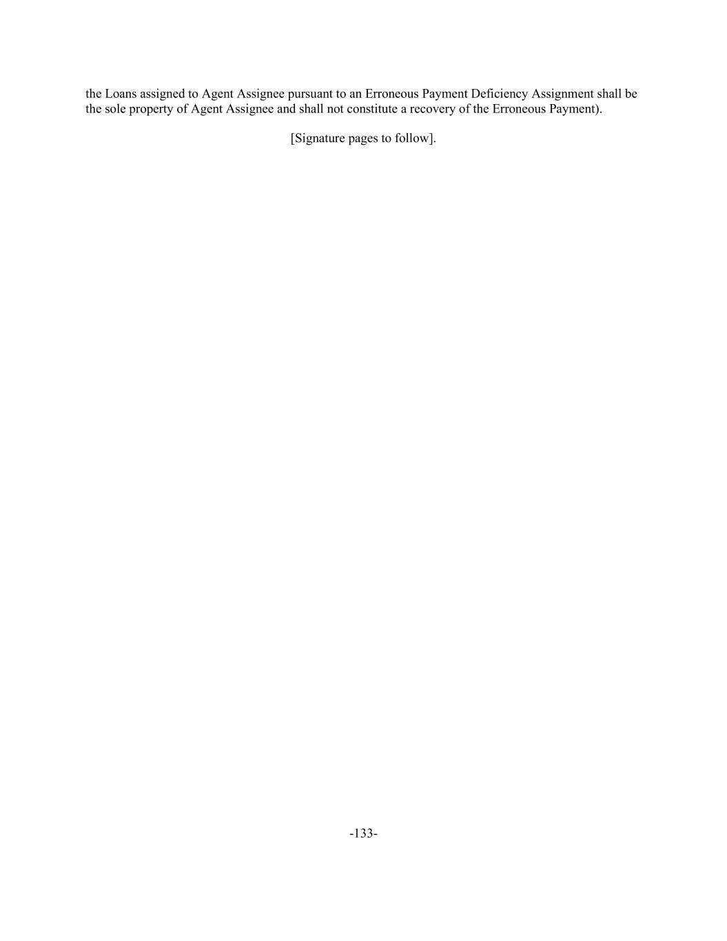 -133- the Loans assigned to Agent Assignee pursuant to an Erroneous Payment Deficiency Assignment shall be the sole property of Agent Assignee and shall not constitute a recovery of the Erroneous Payment). [Signature pages to follow].