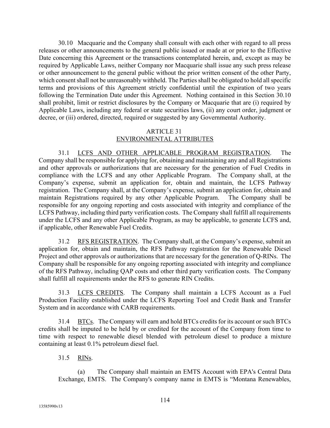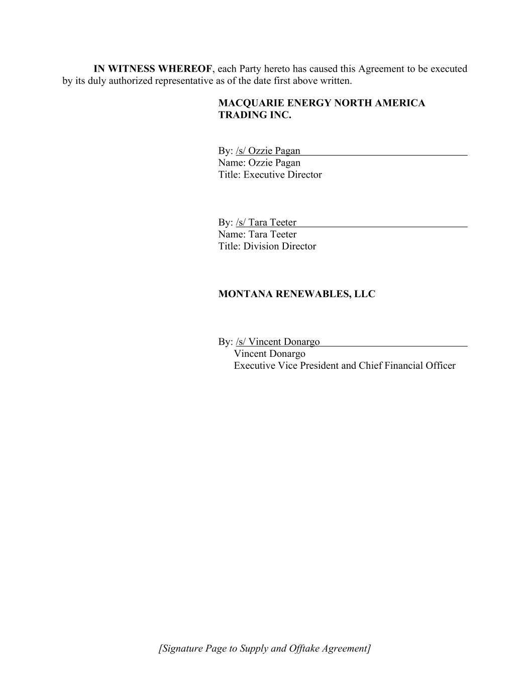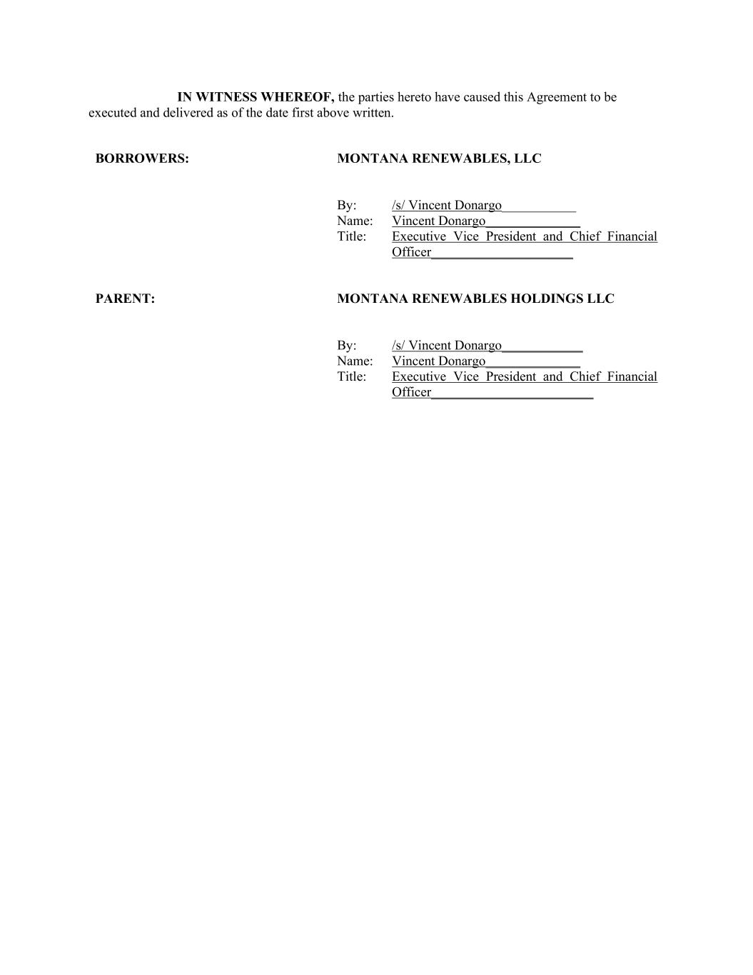 IN WITNESS WHEREOF, the parties hereto have caused this Agreement to be executed and delivered as of the date first above written. BORROWERS: MONTANA RENEWABLES, LLC By: /s/ Vincent Donargo___________ Name: Vincent Donargo______________ Title: Executive Vice President and Chief Financial Officer_____________________ PARENT: MONTANA RENEWABLES HOLDINGS LLC By: /s/ Vincent Donargo____________ Name: Vincent Donargo______________ Title: Executive Vice President and Chief Financial Officer________________________